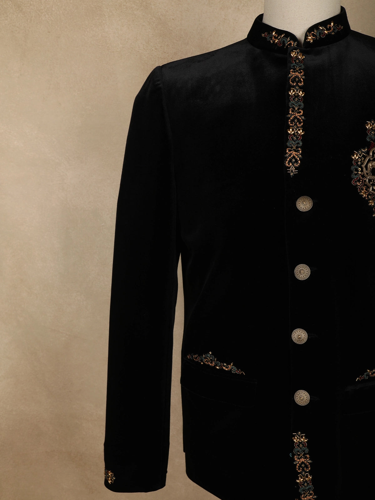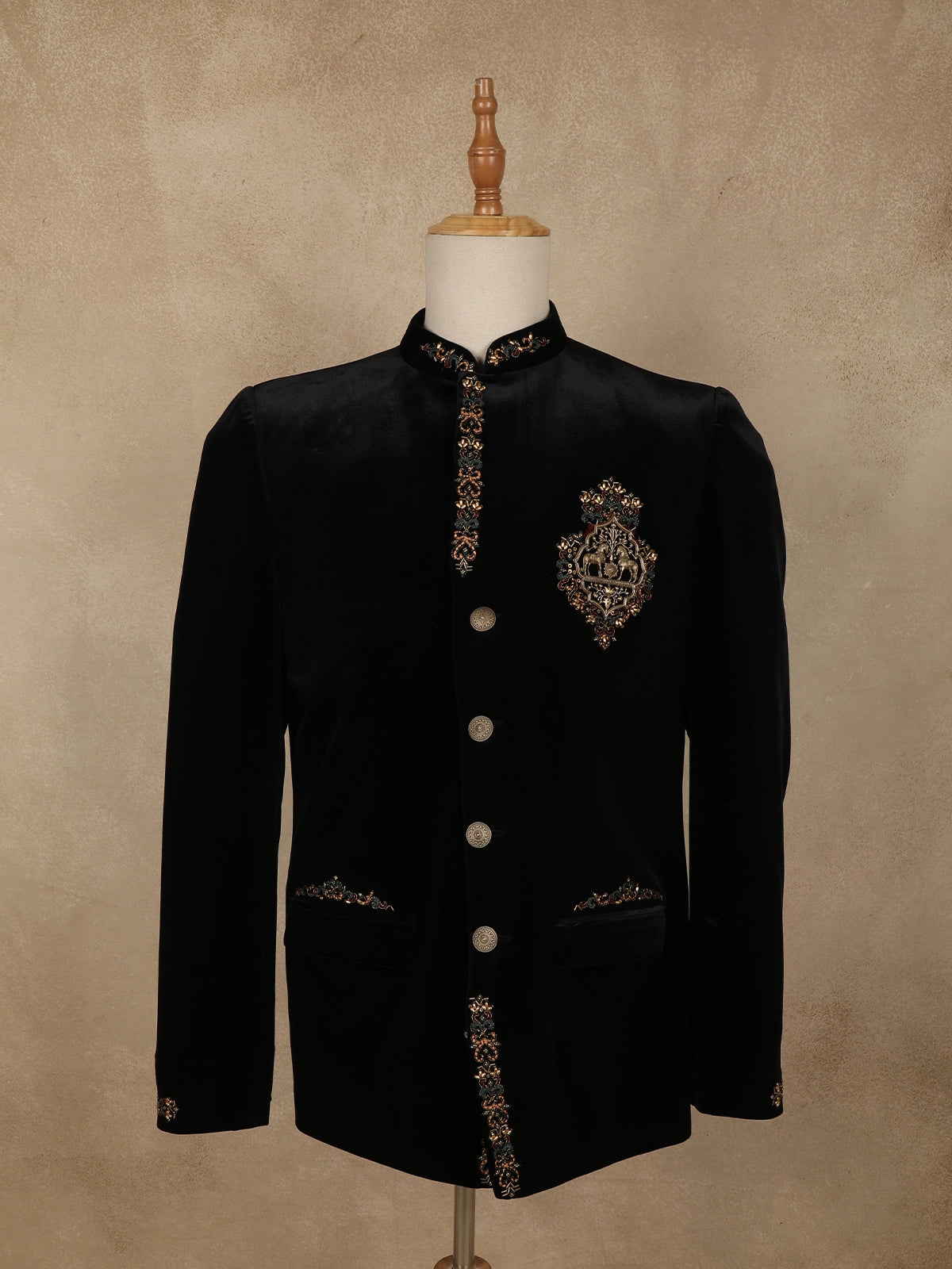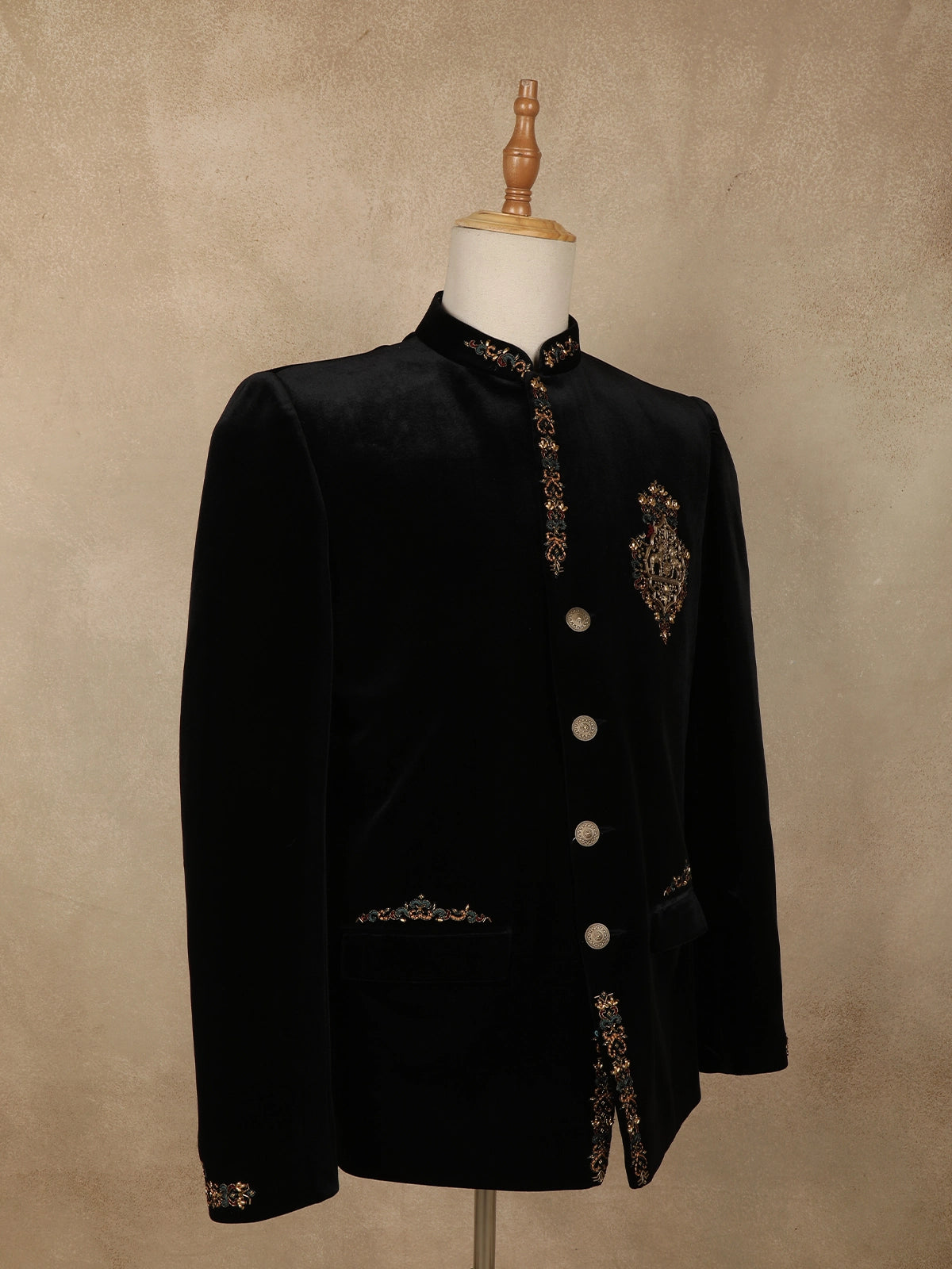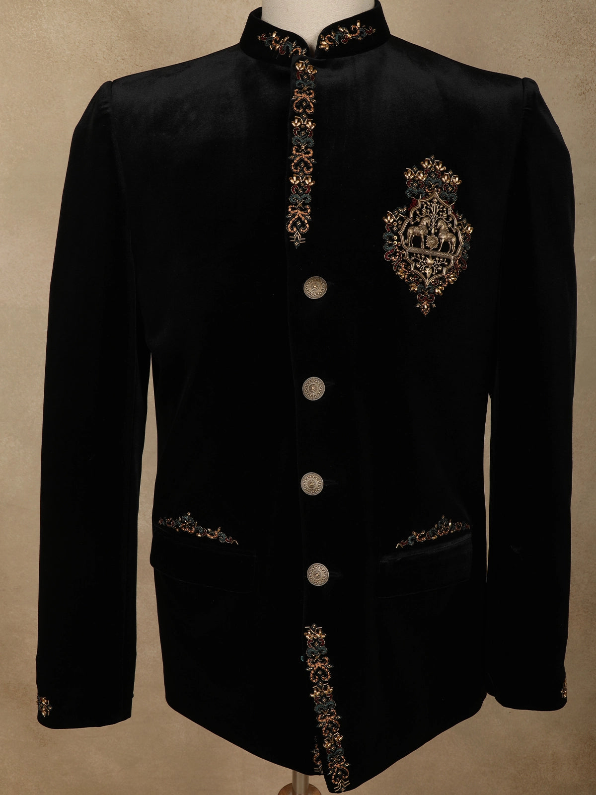 This suit showcases intricate handcrafted embroidery along the placket, collar, cuffs, and pocket edges, featuring ornate floral and vine motifs. A striking royal crest emblem on the chest becomes the focal point, reflecting grandeur and sophistication. The embroidery is detailed with metallic threads and beadwork, creating a subtle sheen that elevates the overall design without overpowering its classic silhouette.