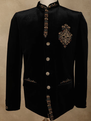 Exude timeless royalty with this Classic Jet Black Velvet Men’s Suit, designed for men who appreciate heritage-inspired luxury with a contemporary finish. The deep jet-black base sets a powerful, elegant tone, beautifully enhanced by antique gold and deep teal accents that add depth and regal charm.