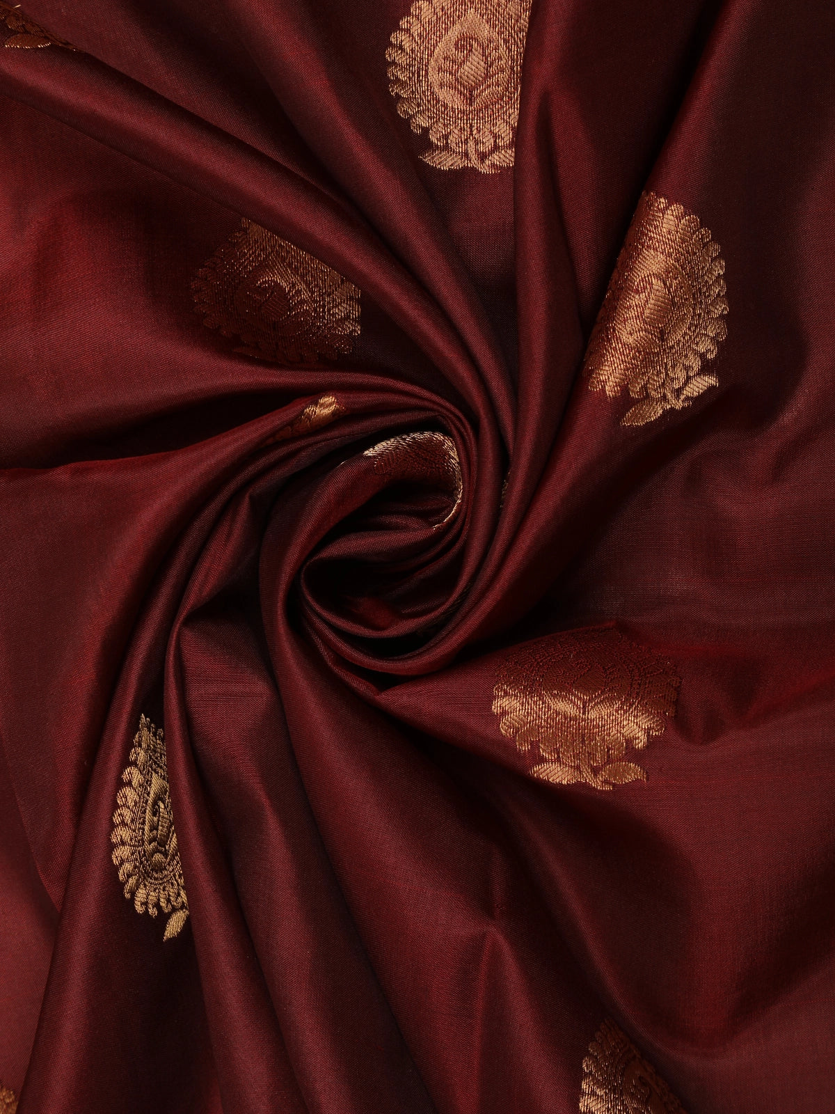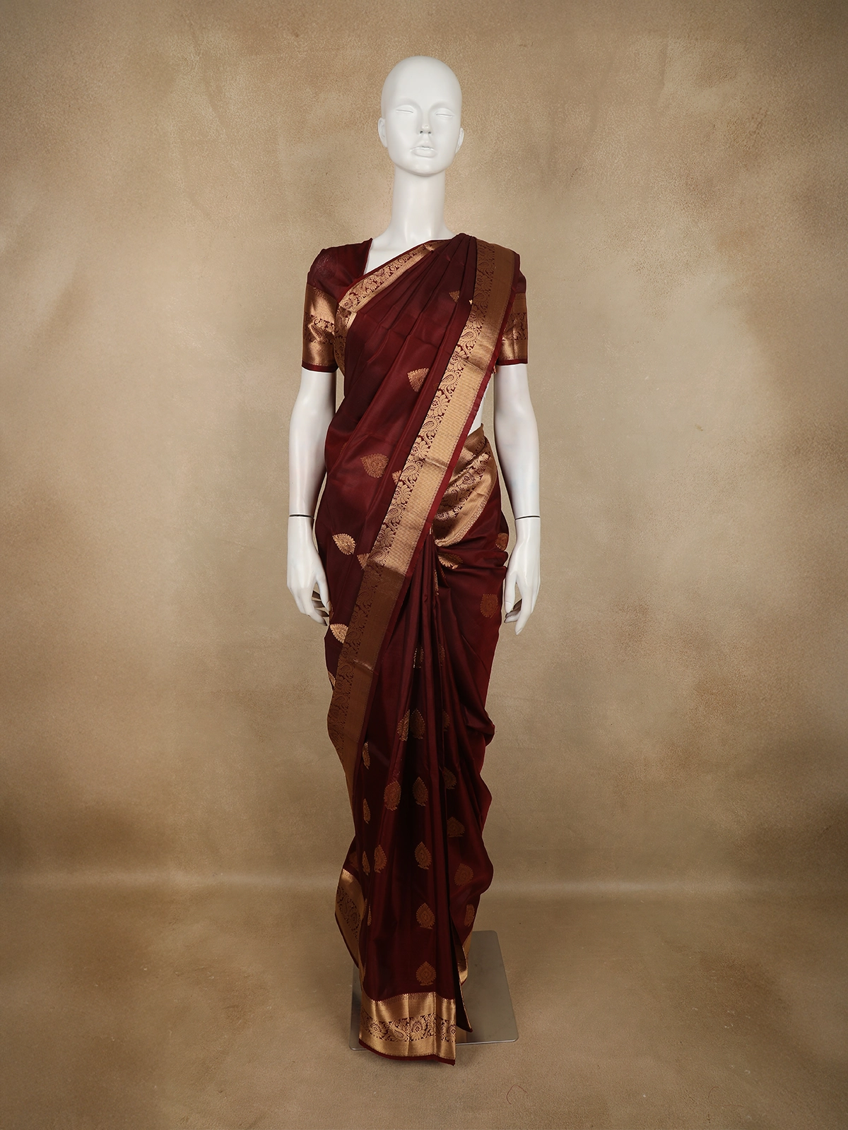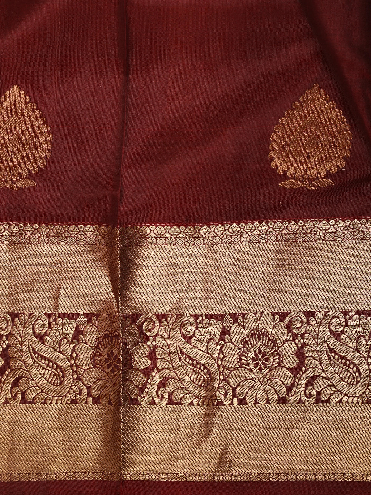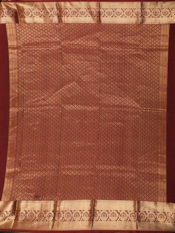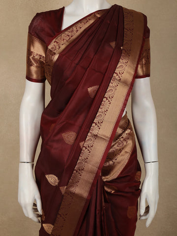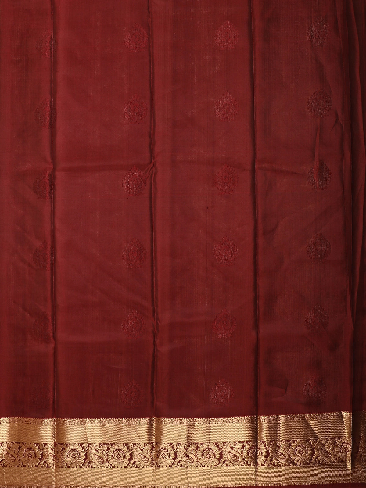 The saree is beautifully finished with a traditional gold zari border, intricately designed with ornate floral and paisley-inspired patterns that enhance its regal appeal. The warm antique gold zari contrasts gracefully with the rich maroon hue, creating a look that is both majestic and timeless.