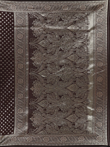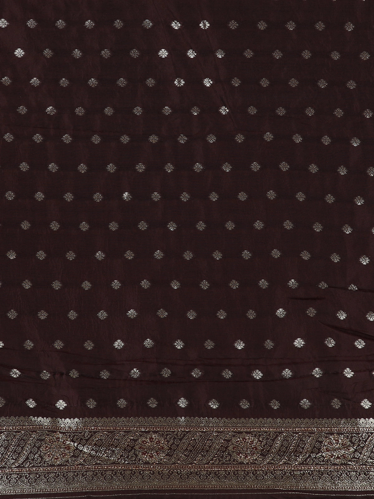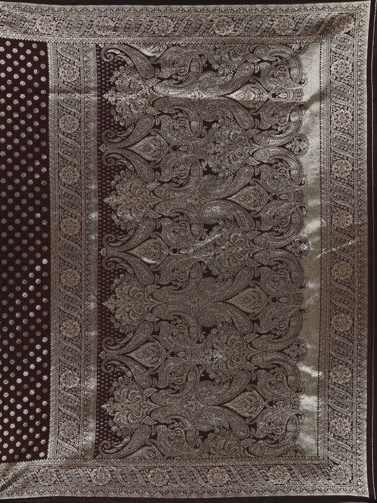 Emanate timeless sophistication with this exquisite Brown Semi Banarasi Silk Saree, a graceful weave that embodies tradition and festive luxury. The saree features intricate zari-woven floral motifs that glimmer beautifully across the rich brown fabric, reflecting the artistry of Banarasi craftsmanship.