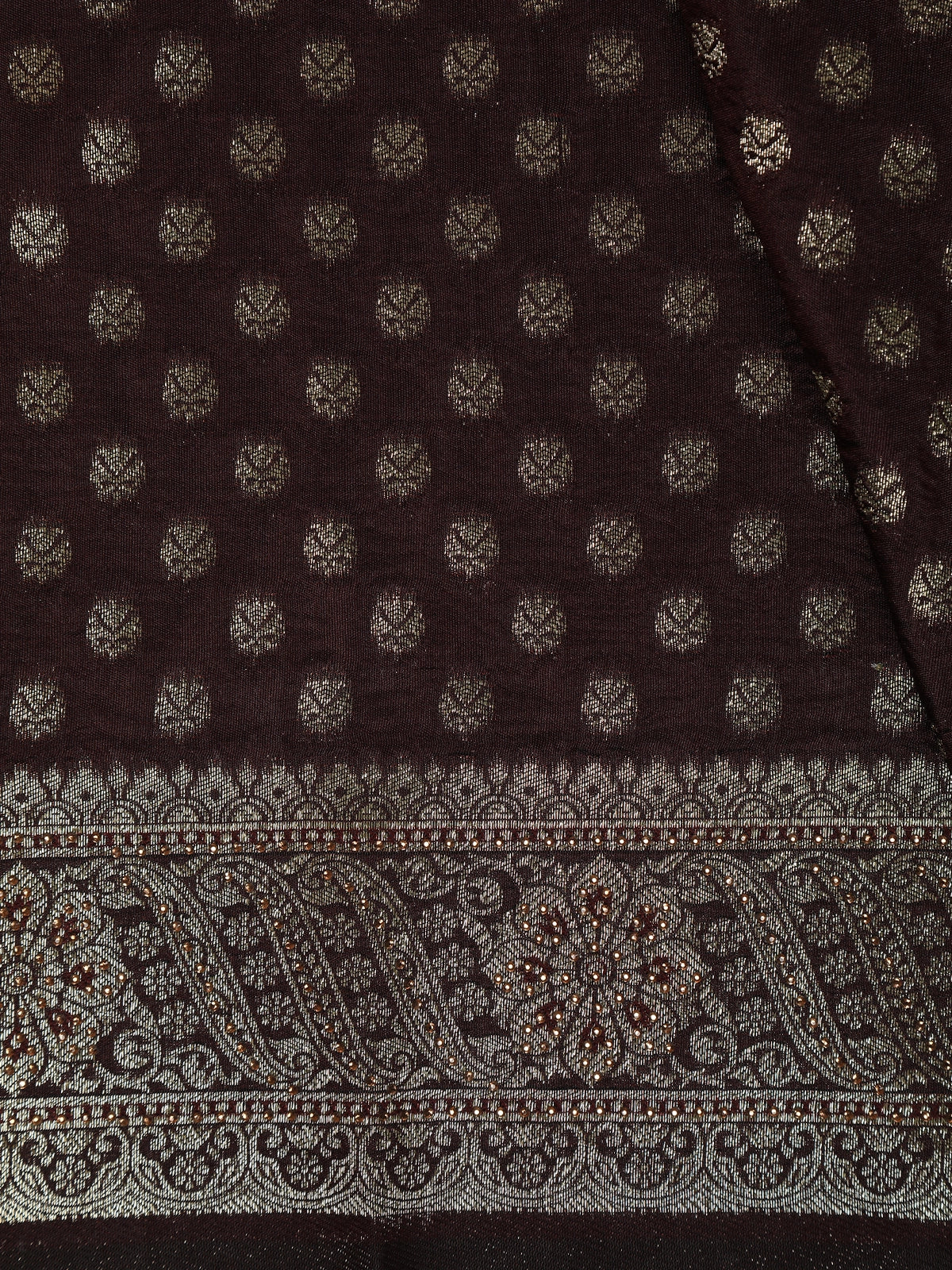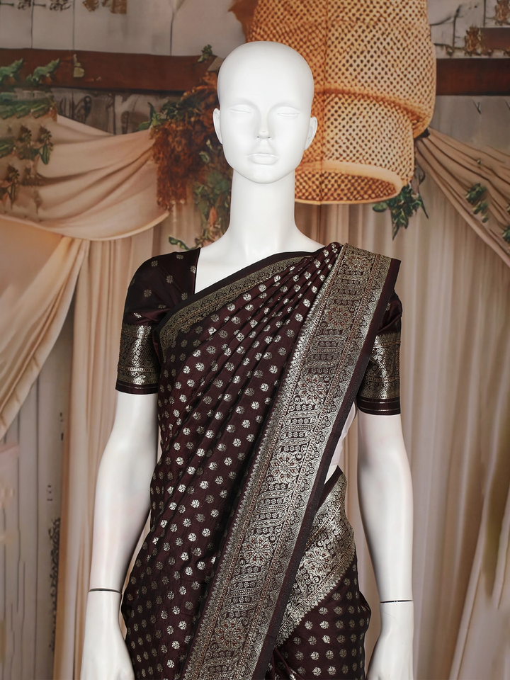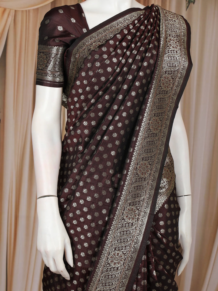 The semi Banarasi silk drapes fluidly, offering a perfect balance of comfort and grandeur—ideal for festive gatherings, traditional events, or wedding celebrations. A matching brown blouse completes the look, while the shimmering zari border lends a regal charm to this elegant ensemble.