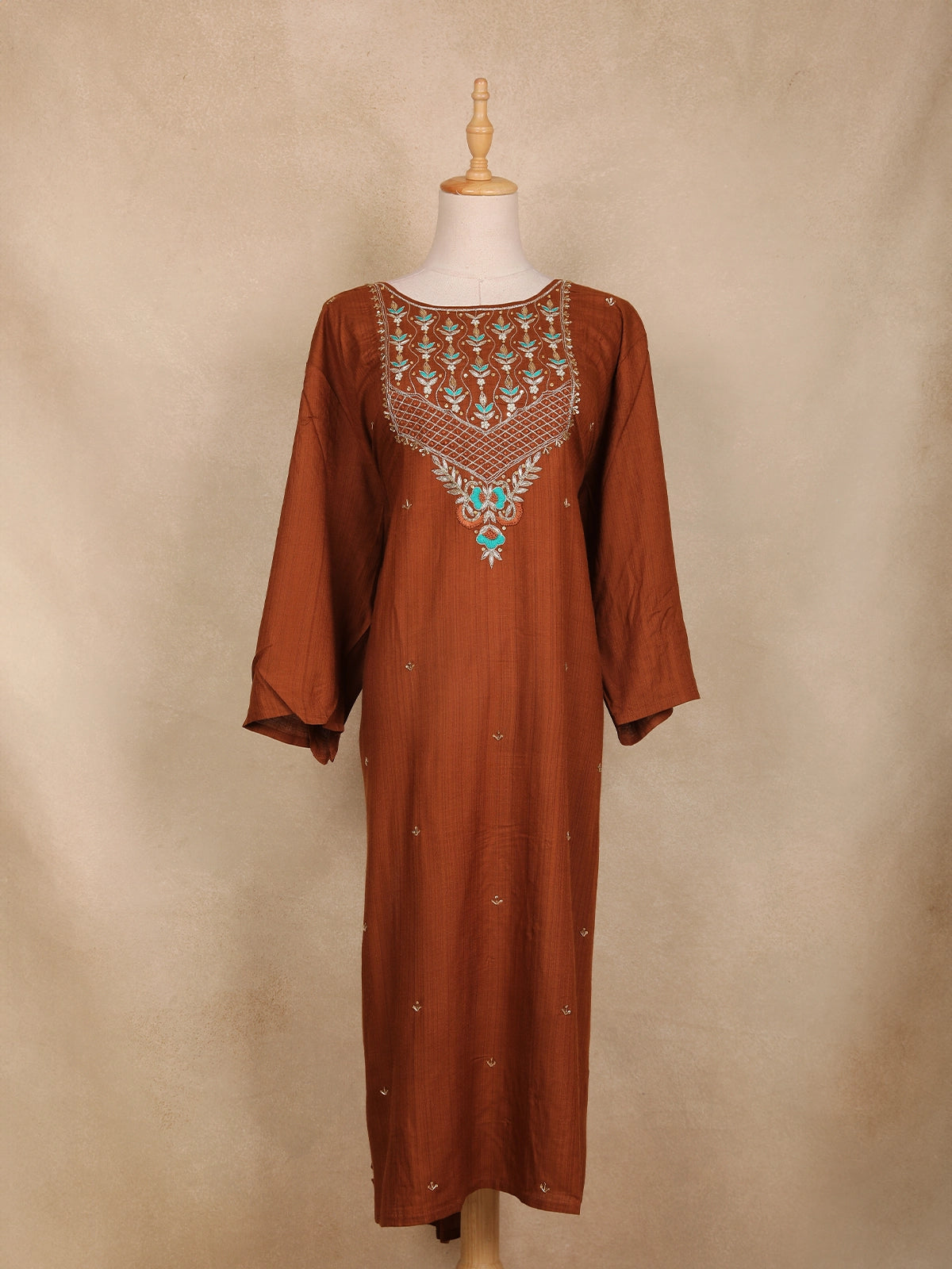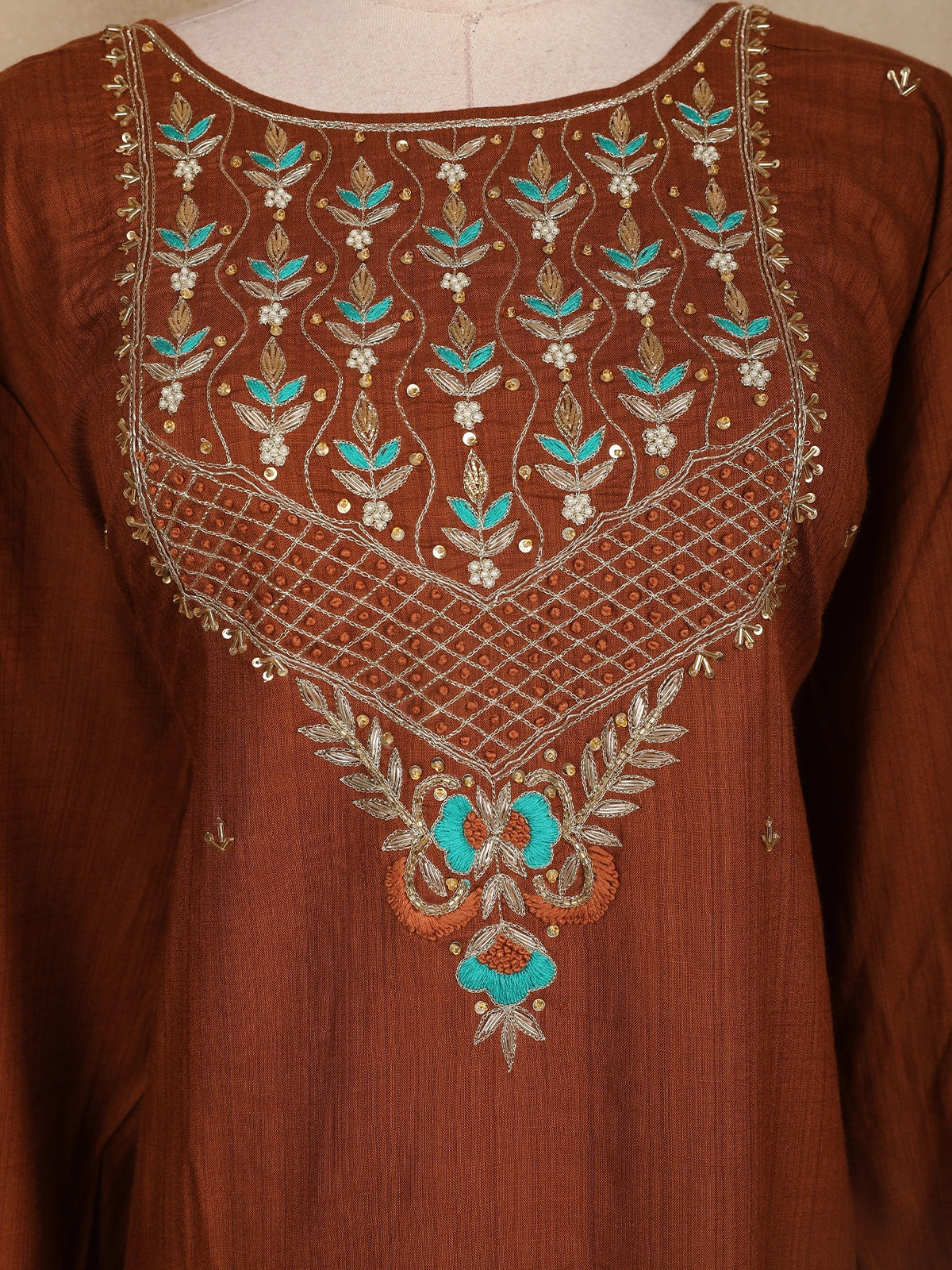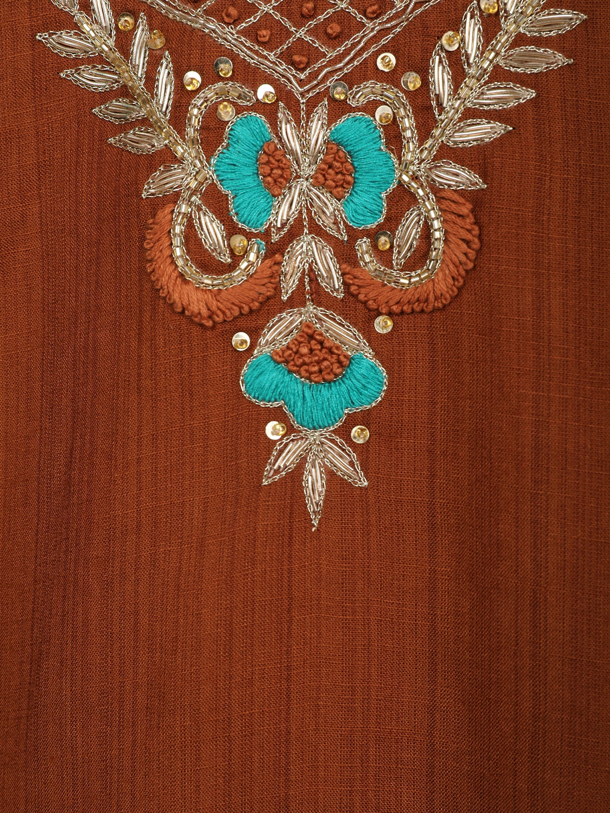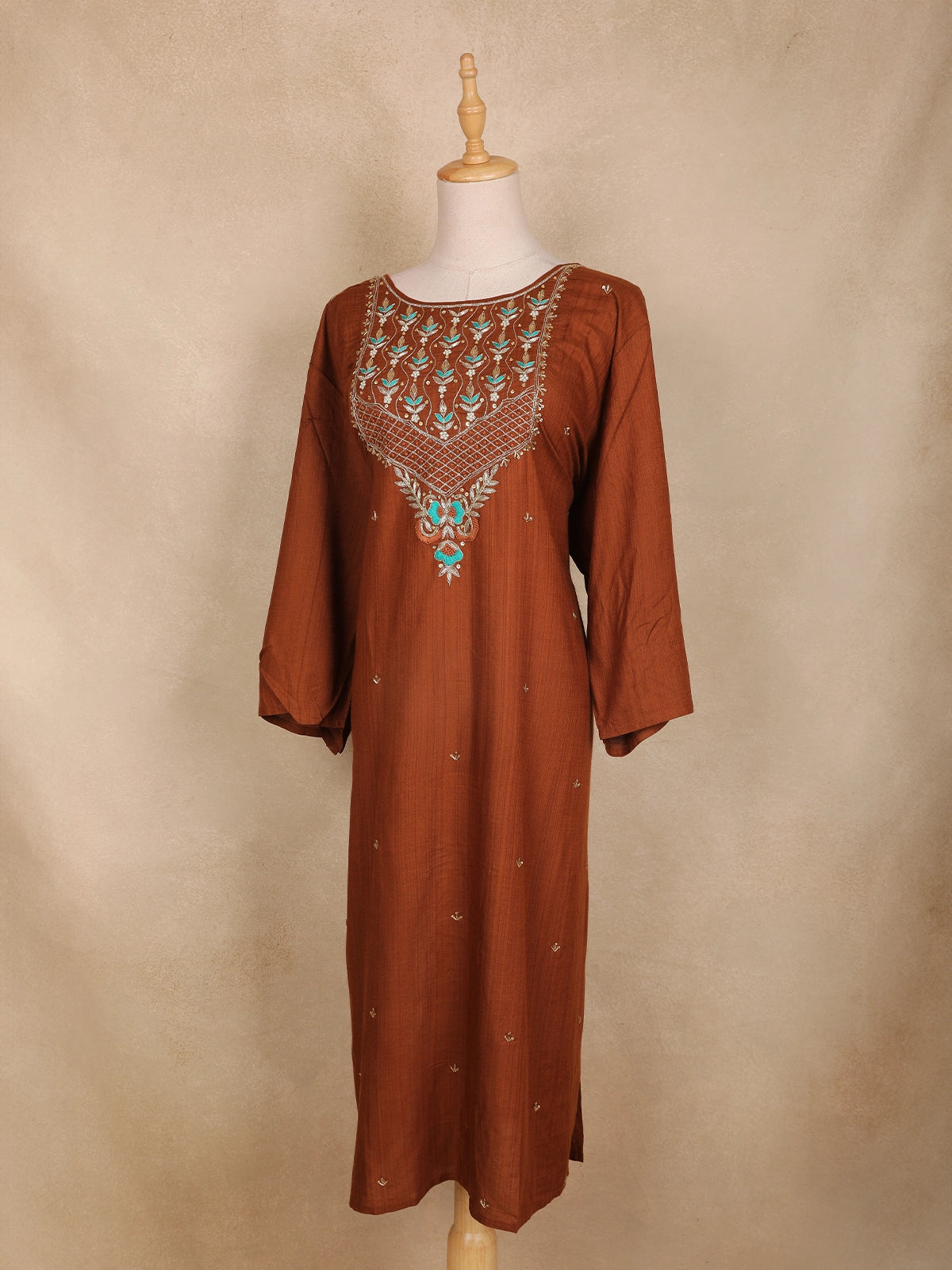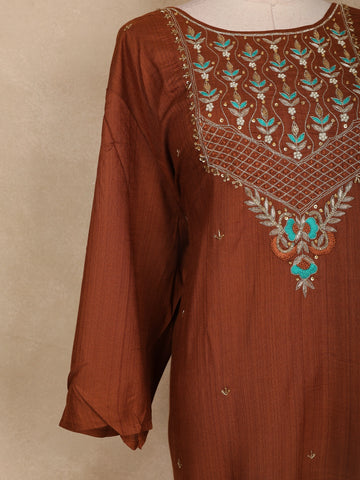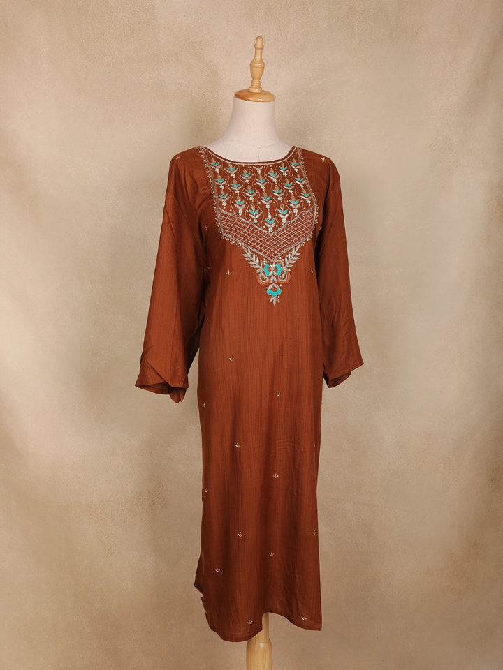 Elevate your ethnic charm with this brown cotton kurti adorned with exquisite floral embroidery. The beautifully designed yoke showcases intricate threadwork in turquoise blue and golden tones, adding a graceful contrast to the earthy base. The kurti features a round neckline embellished with delicate sequin highlights and geometric lattice detailing. The loose, comfortable three-quarter sleeves and straight silhouette make it ideal for casual gatherings, festive wear, or everyday elegance. Pair it with cream or beige leggings and oxidized jewelry for a complete ethnic look.