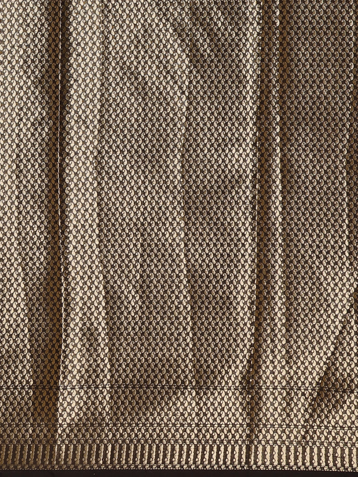 The deep coffee brown base complements the golden zari work and ornate border, while the matching blouse and pallu complete the ensemble with refined harmony. Lightweight yet luxurious, this saree is ideal for festivals, weddings, and traditional celebrations, offering a timeless look that never goes out of style.
