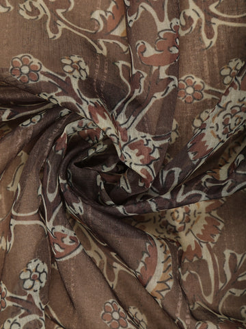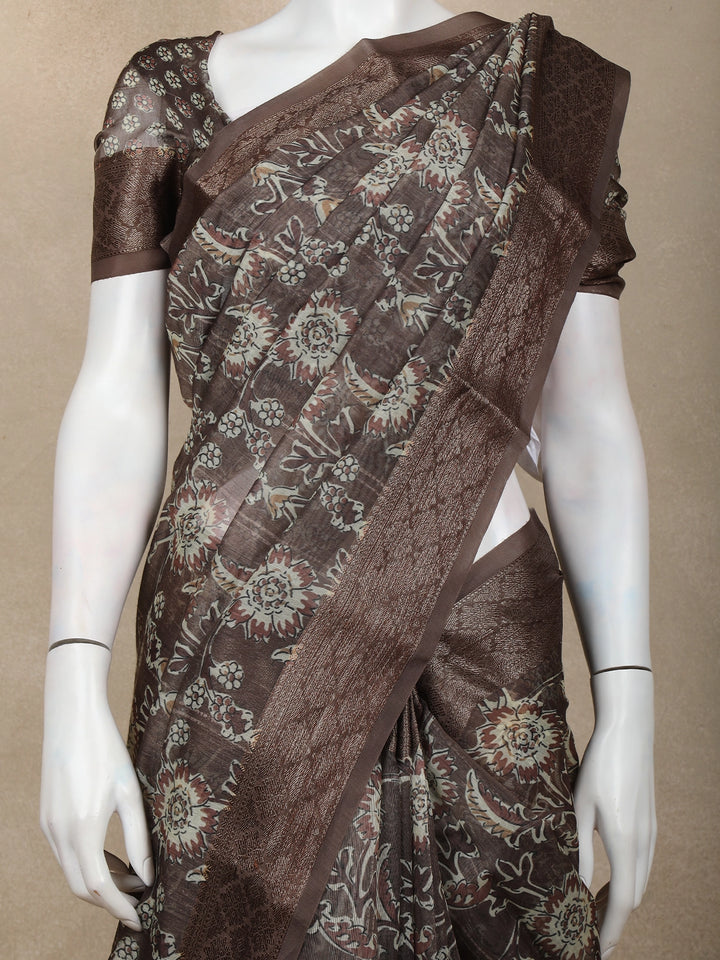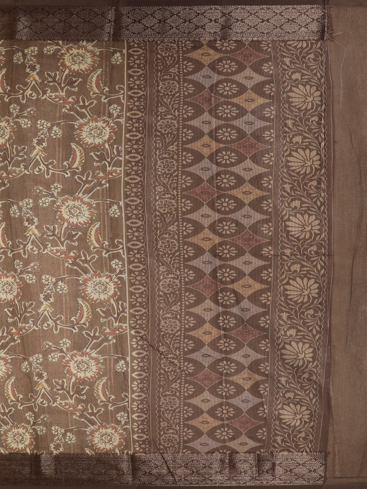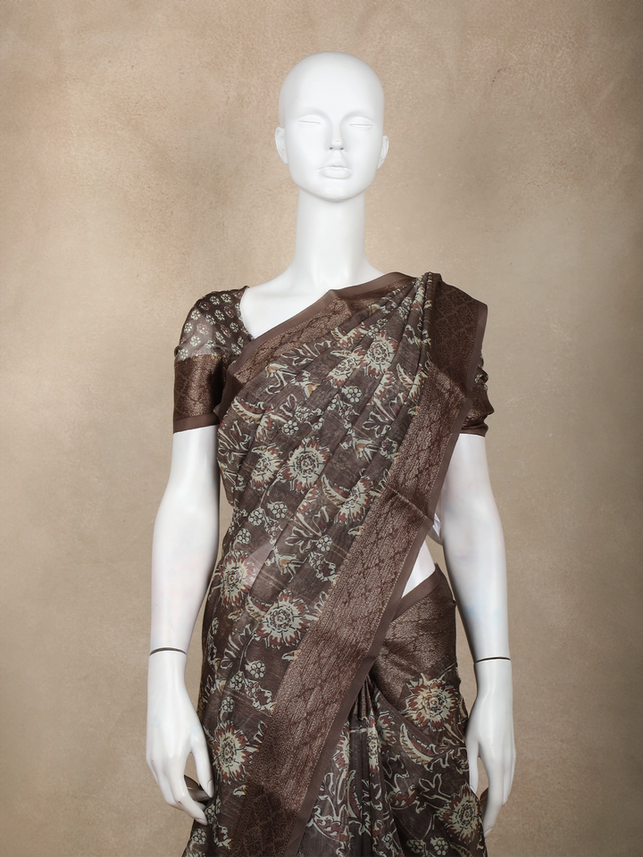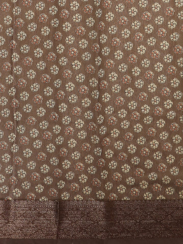 Coffee Brown Floral Printed Chanderi Cotton Saree with Zari Woven Border