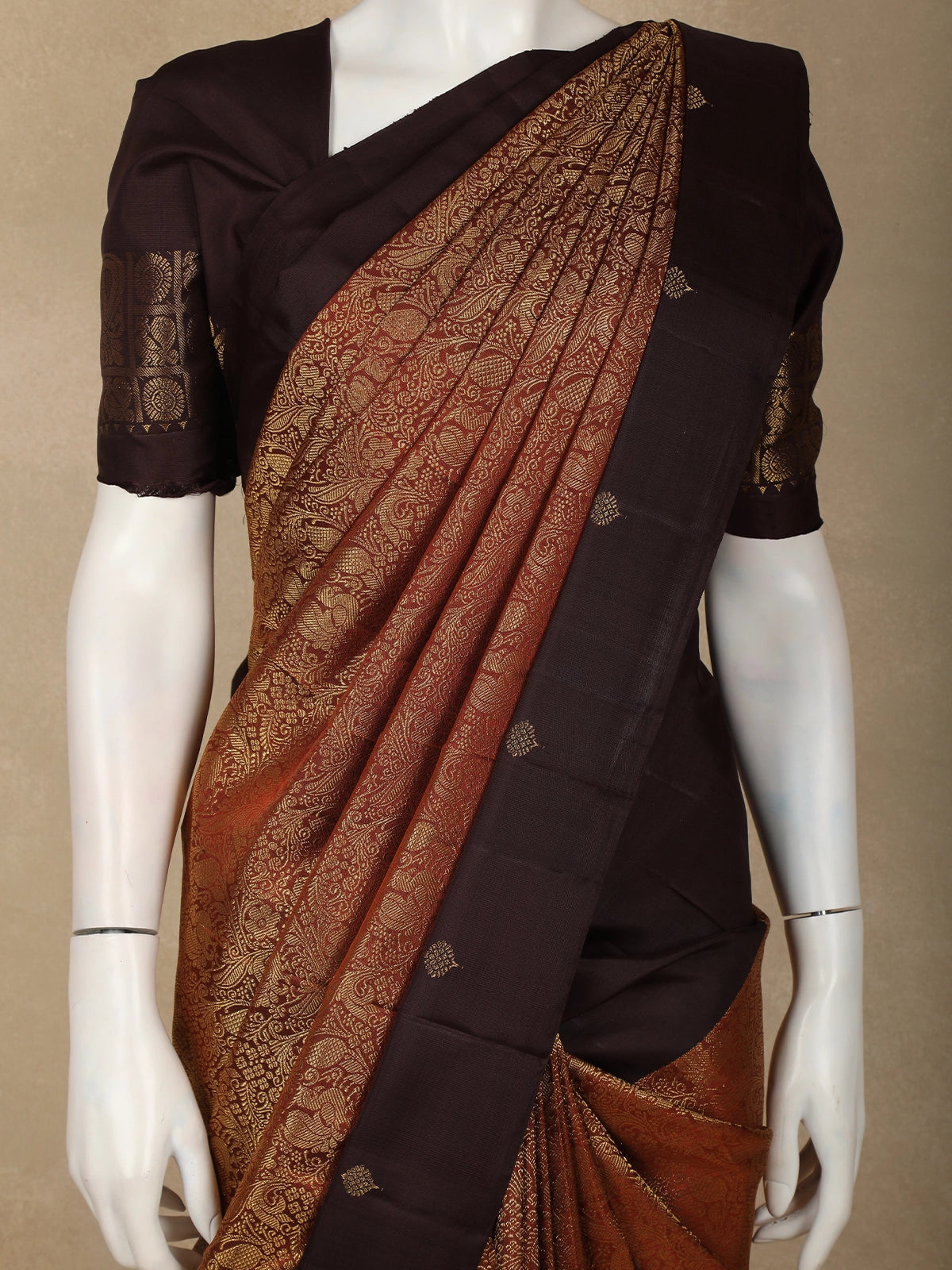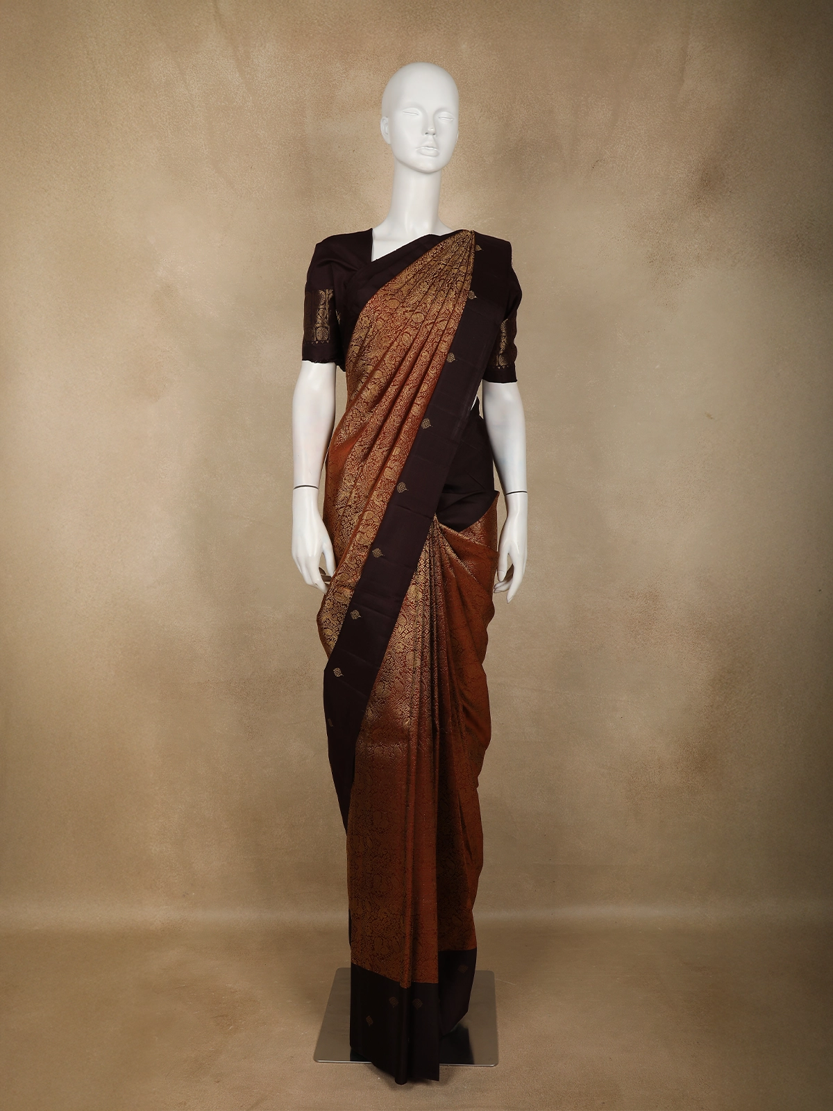 The saree is beautifully contrasted with a deep brown solid zari border, accentuated by delicate butta detailing that frames the drape with refined elegance. The richly woven pallu enhances the saree’s regal appeal, making it an ideal choice for weddings, festive ceremonies, and auspicious occasions. The harmonious blend of coffee brown and warm zari tones creates a sophisticated palette that never goes out of style.
