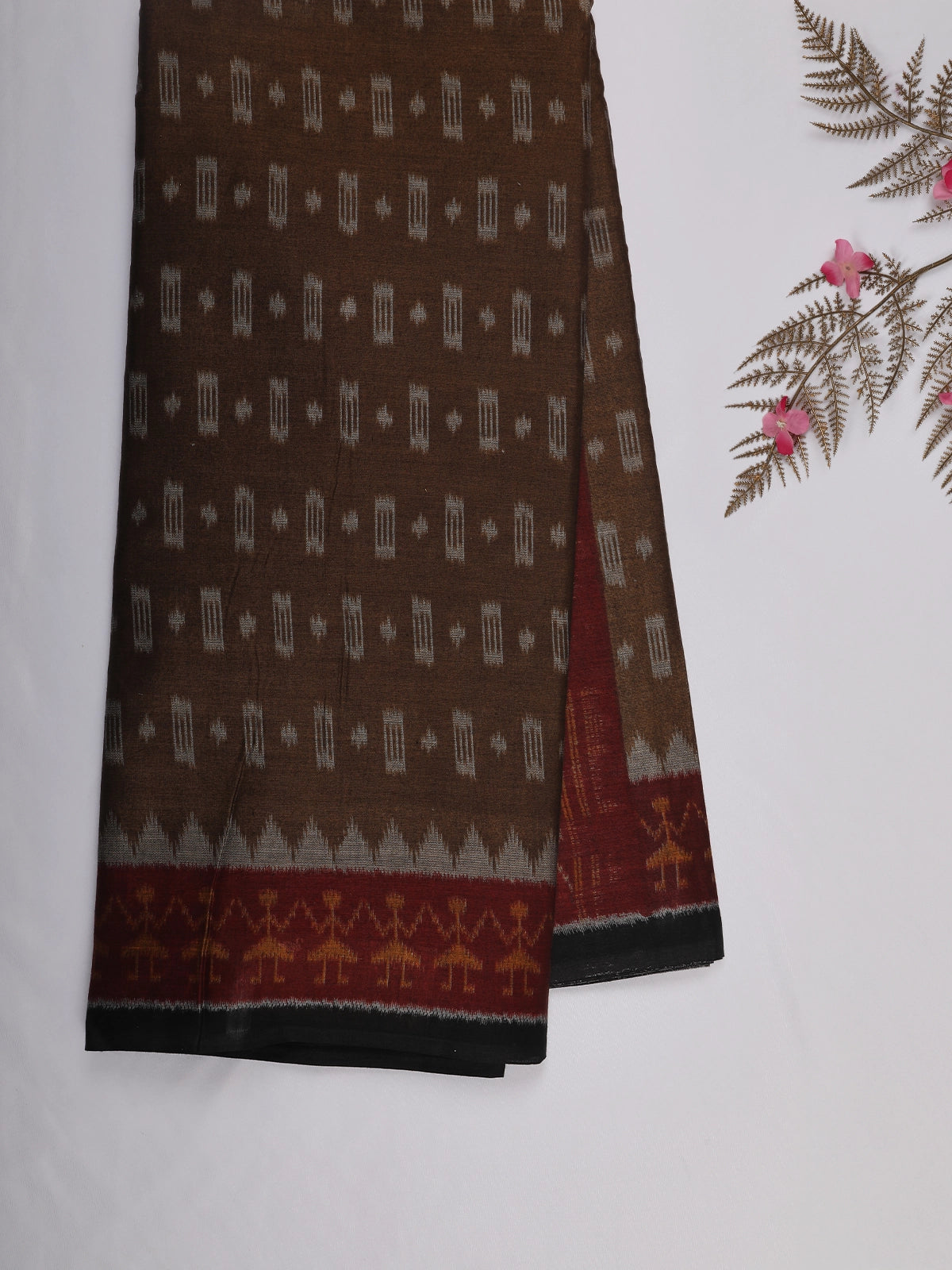 Coffee Brown Ikat Printed Karishma Cotton Saree with Contrast Border