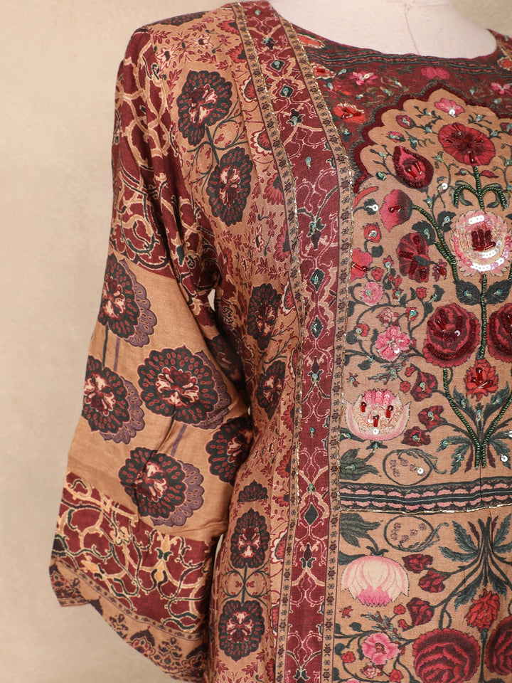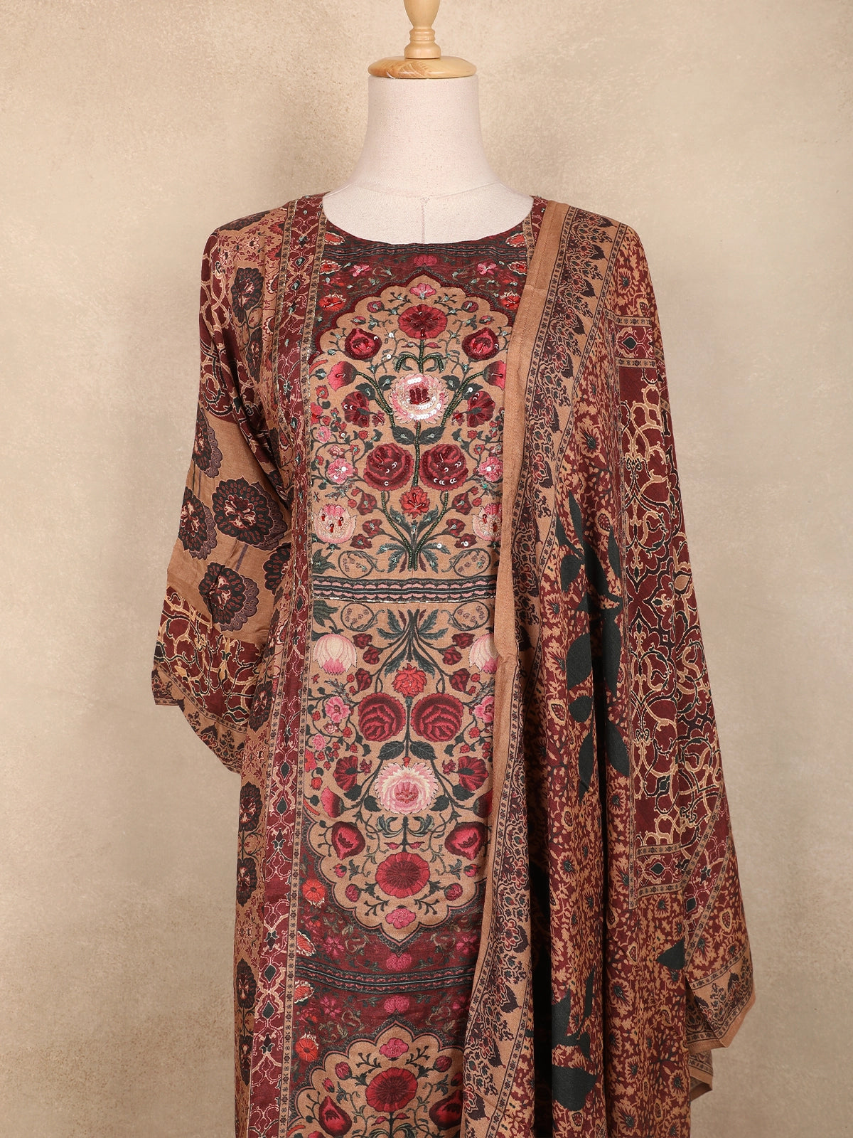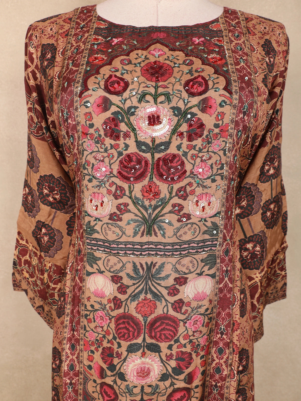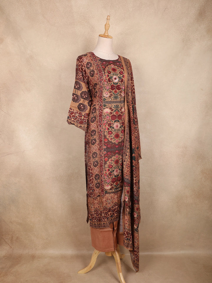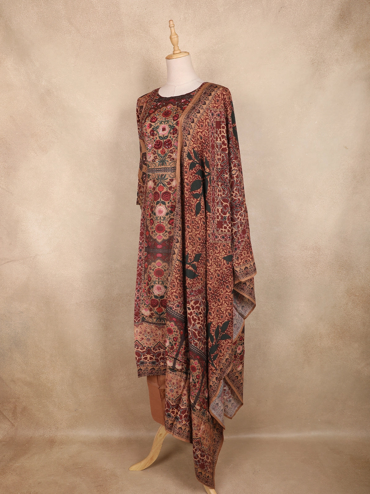 Step into timeless elegance with this Coffee Brown Kashmiri Floral Printed Crepe Straight Cut Salwar Suit, a perfect blend of traditional charm and modern finesse. The kurta showcases intricate Kashmiri-inspired floral prints in rich tones of maroon, beige, and olive, creating a captivating contrast against the deep brown backdrop. Detailed printed borders along the neckline, sleeves, and hem enhance its classic ethnic appeal.