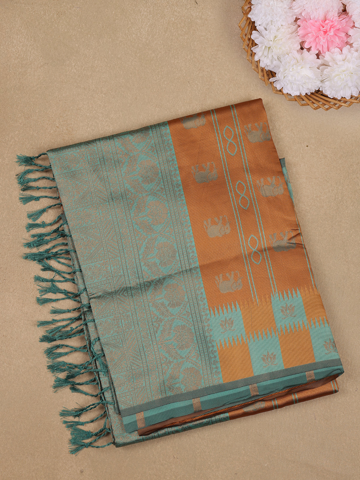 Copper Brown and Aqua Green Elephant Motif Woven Art Silk Saree with Zari Border