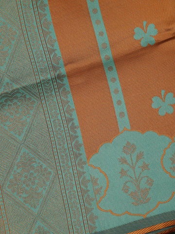 Grace your festive moments with this elegant woven art silk saree, beautifully crafted in a stunning combination of copper brown and aqua green. The saree showcases a perfect blend of traditional floral and geometric motifs, intricately woven throughout the drape using fine jacquard weaving.