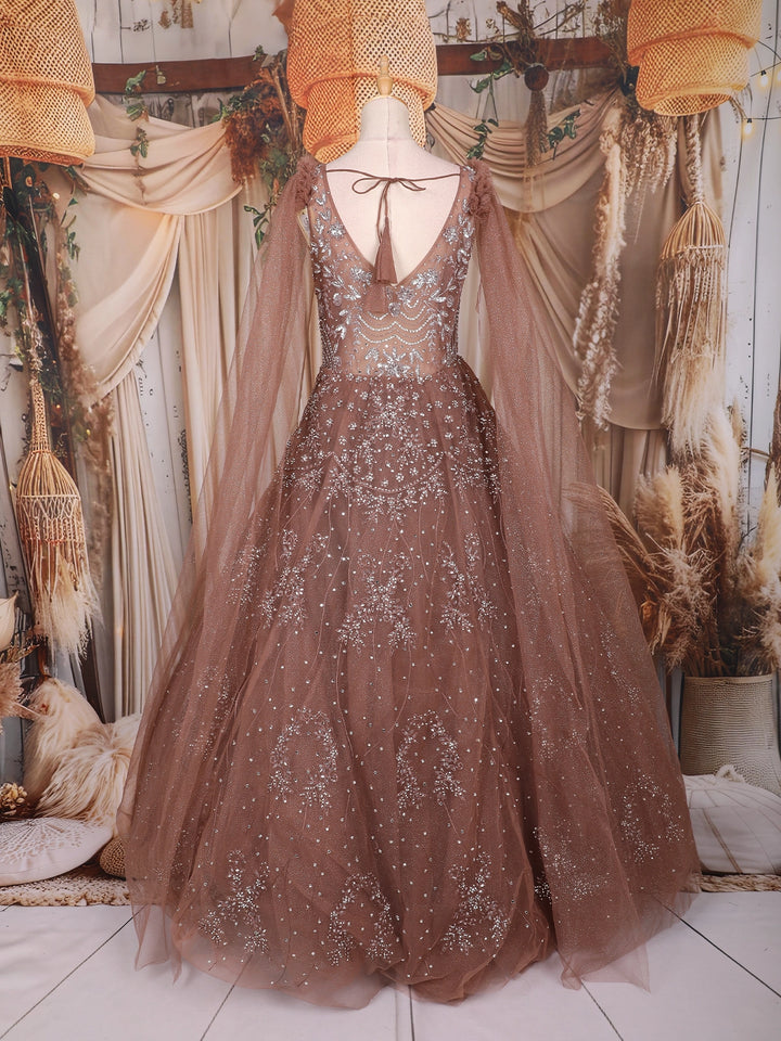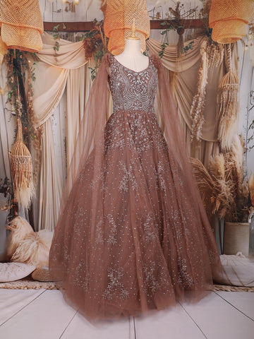 Step into the spotlight with this stunning Copper Net Gown, exuding grace and grandeur in every detail. Crafted from delicate net fabric, this ensemble showcases intricate sequin and bead embroidery across the bodice and flare, adding a luxurious shimmer that catches the light beautifully. The soft copper hue gives it a regal charm, perfect for evening occasions and festive celebrations.