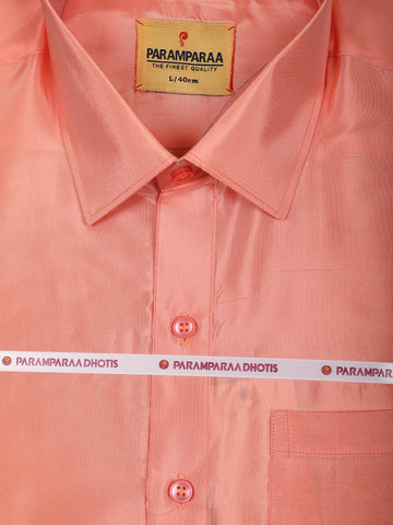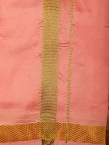 Coral Peach Solid Design Dhoti Shirt Set with Gold Zari Border