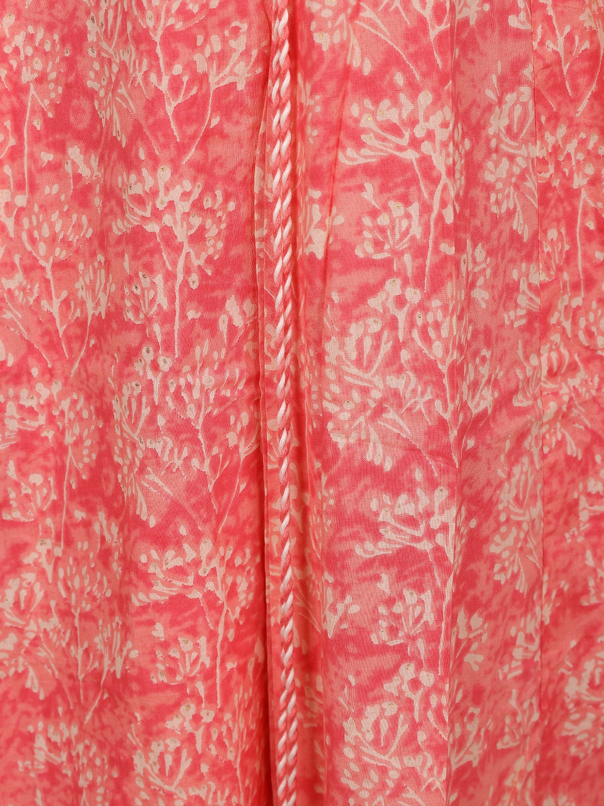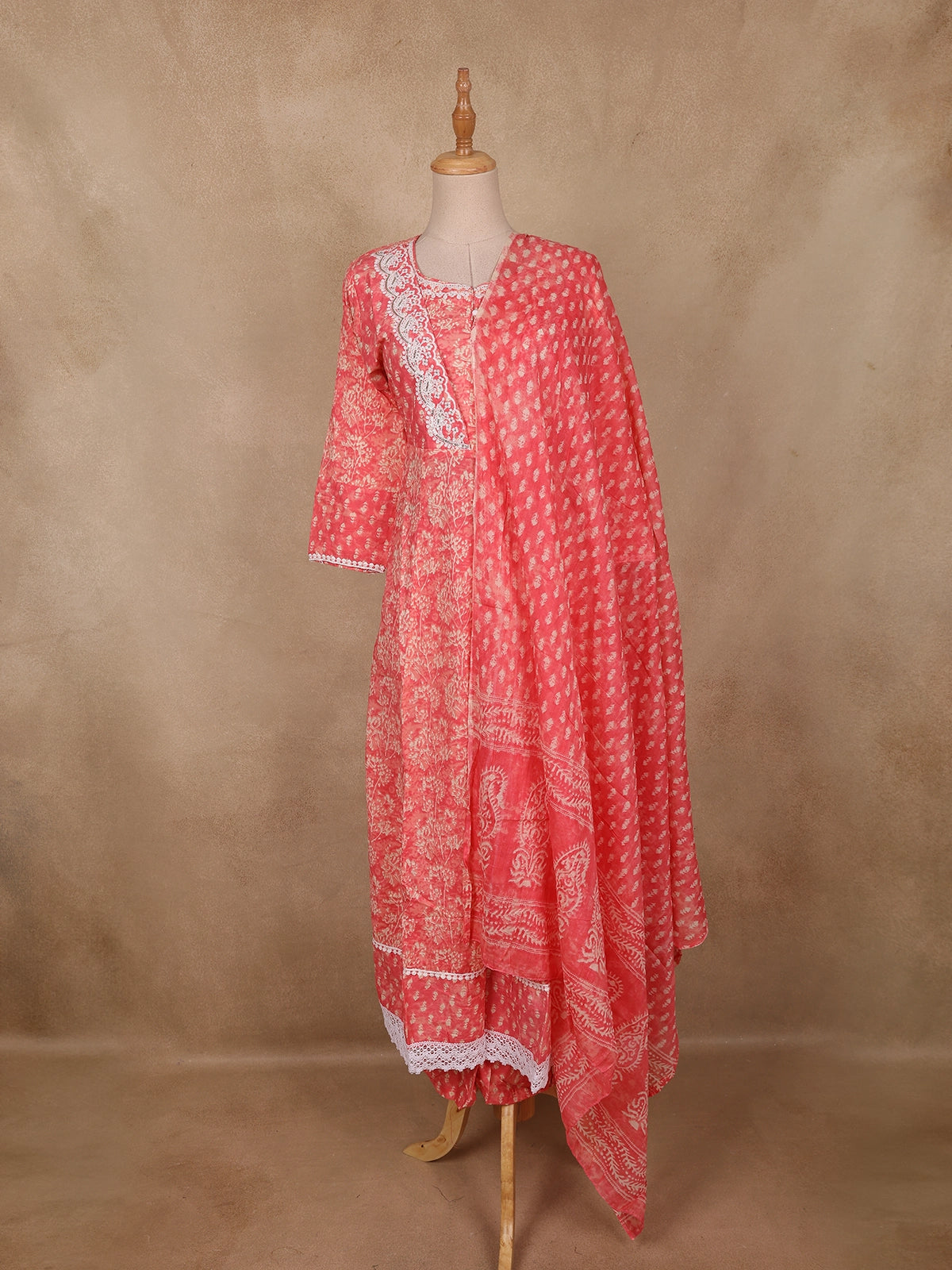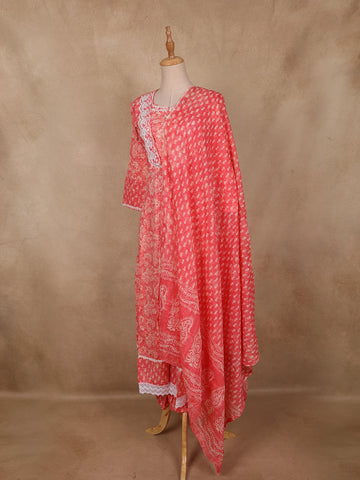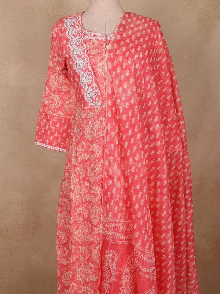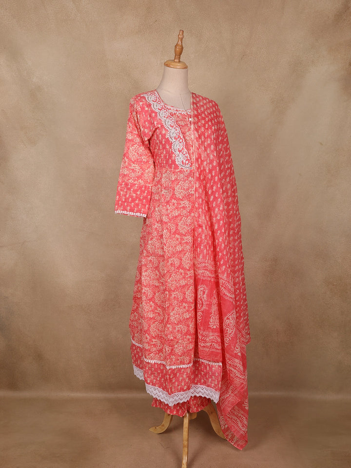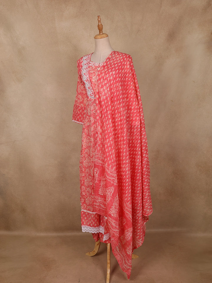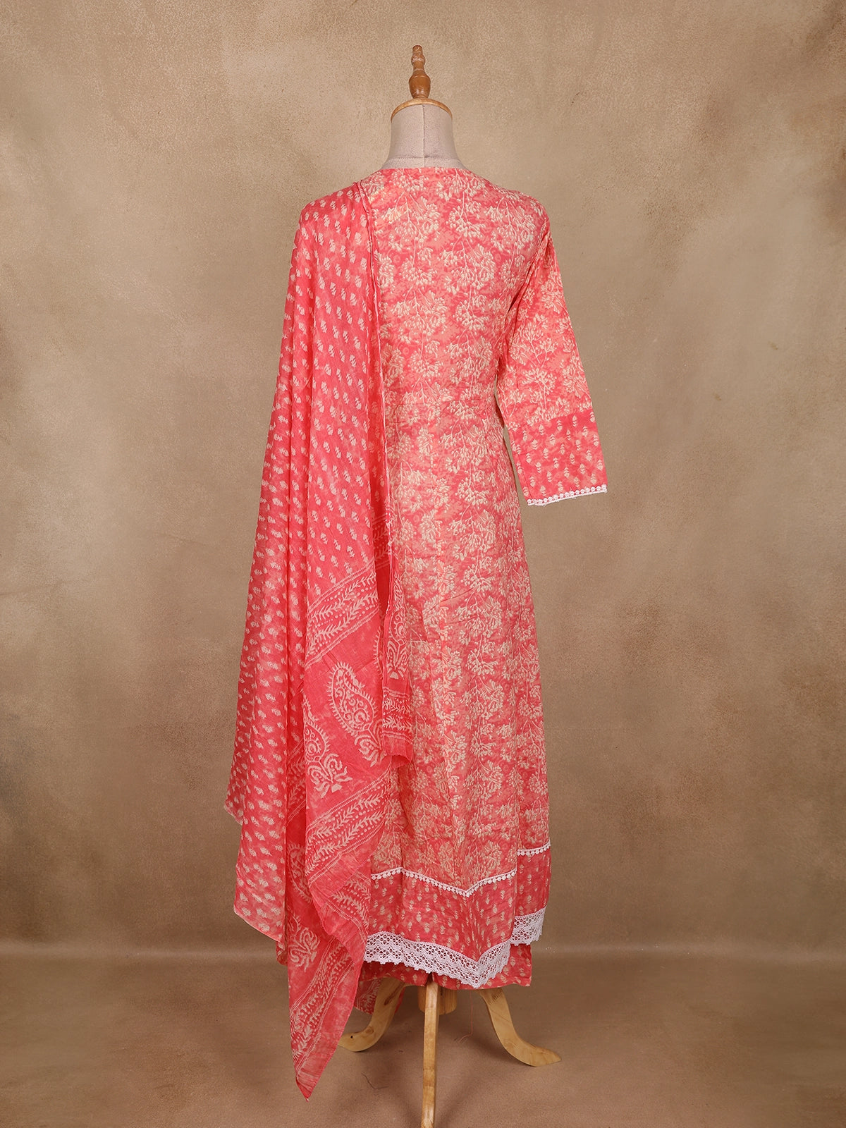 Coral Pink Floral Printed Cotton Salwar Suit with Dupatta