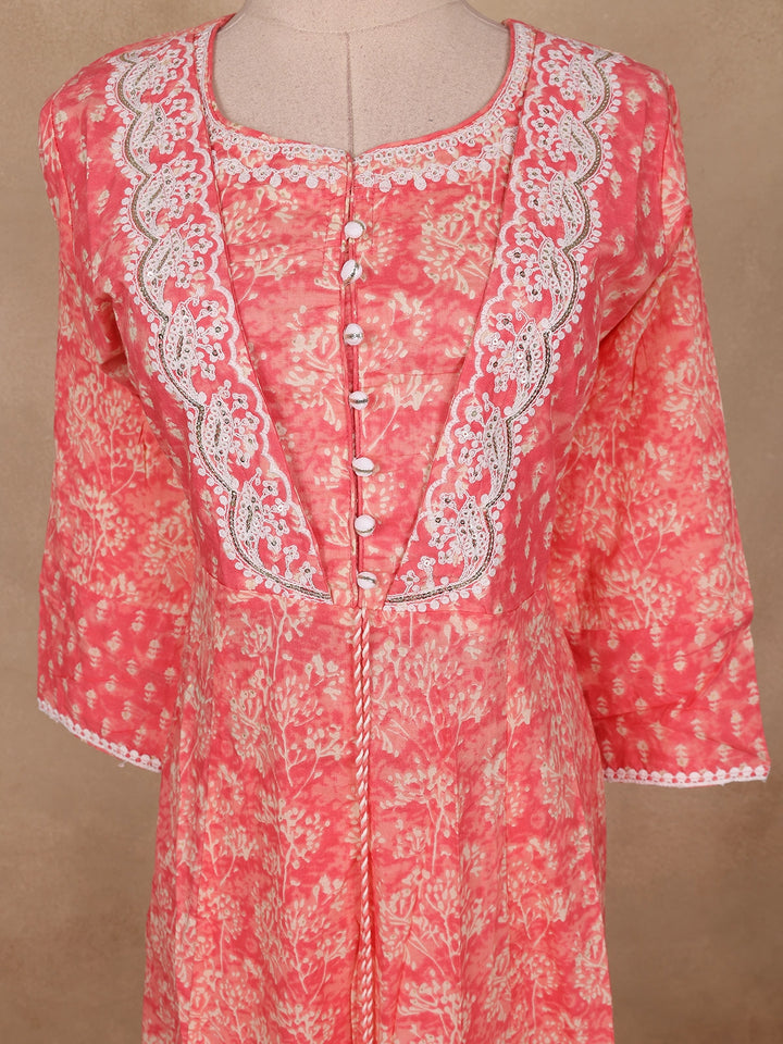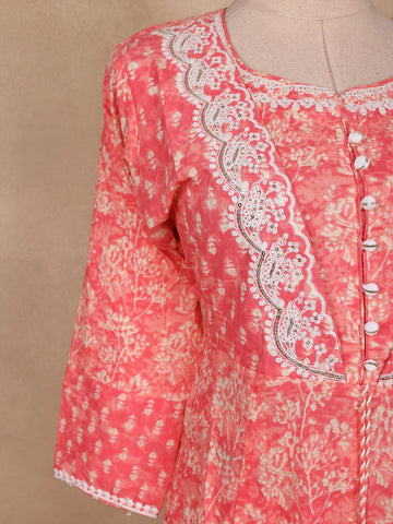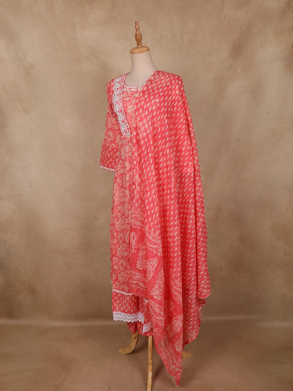 Step into effortless grace with this Coral Pink Floral Printed Cotton Salwar Suit, designed to blend traditional motifs with a refreshing summer hue. The kurta features delicate floral block prints accentuated with intricate white lace embroidery along the neckline and front placket, adding a feminine charm. The soft cotton fabric ensures breathable comfort, making it perfect for daily wear and festive occasions alike.