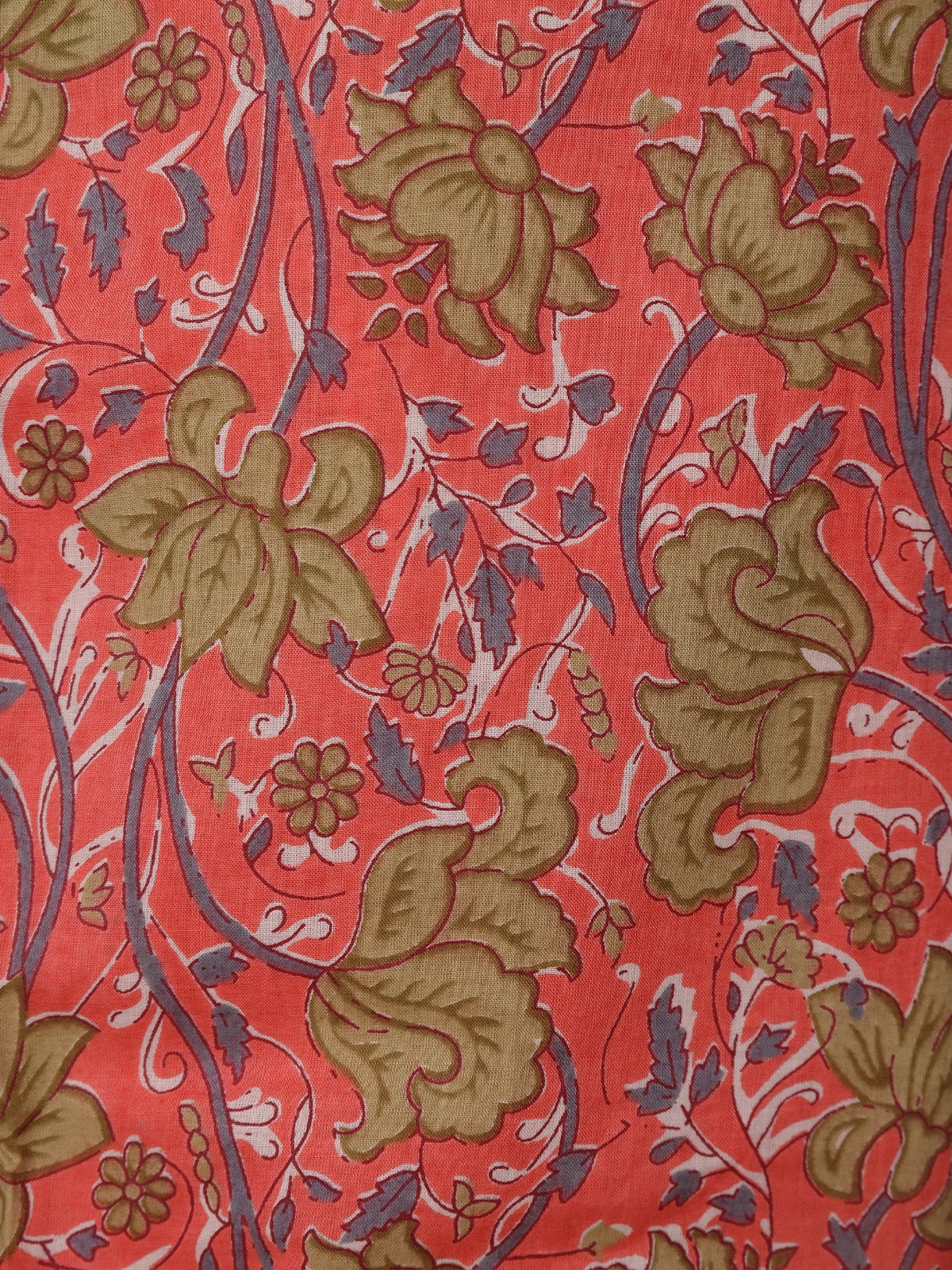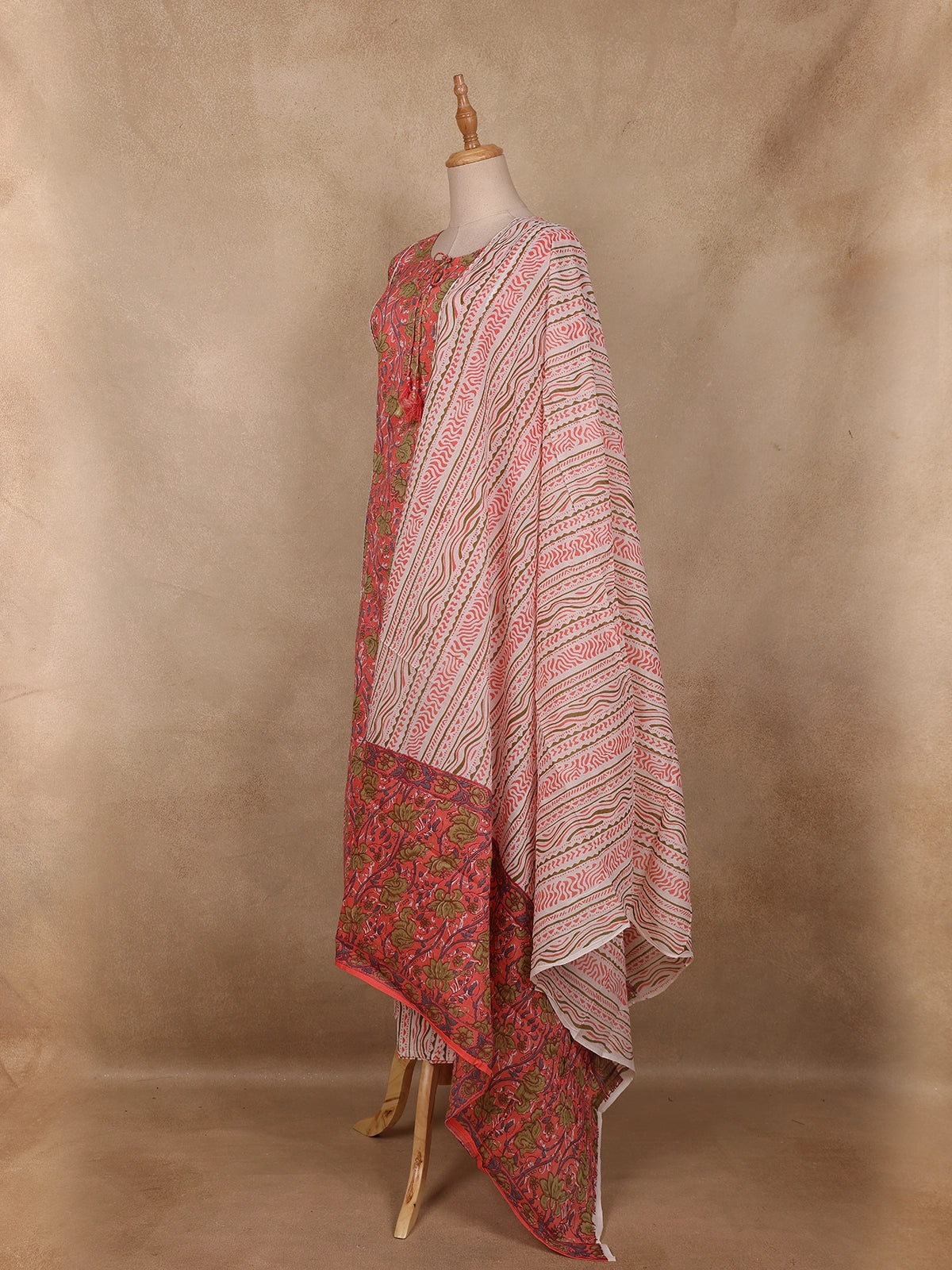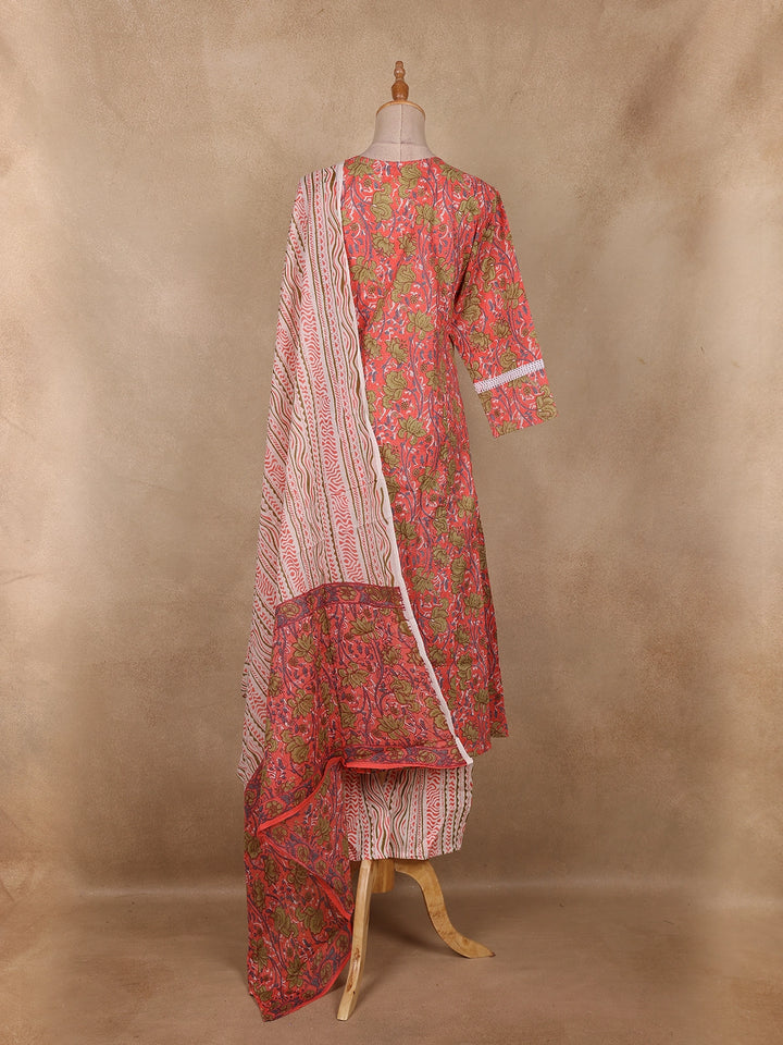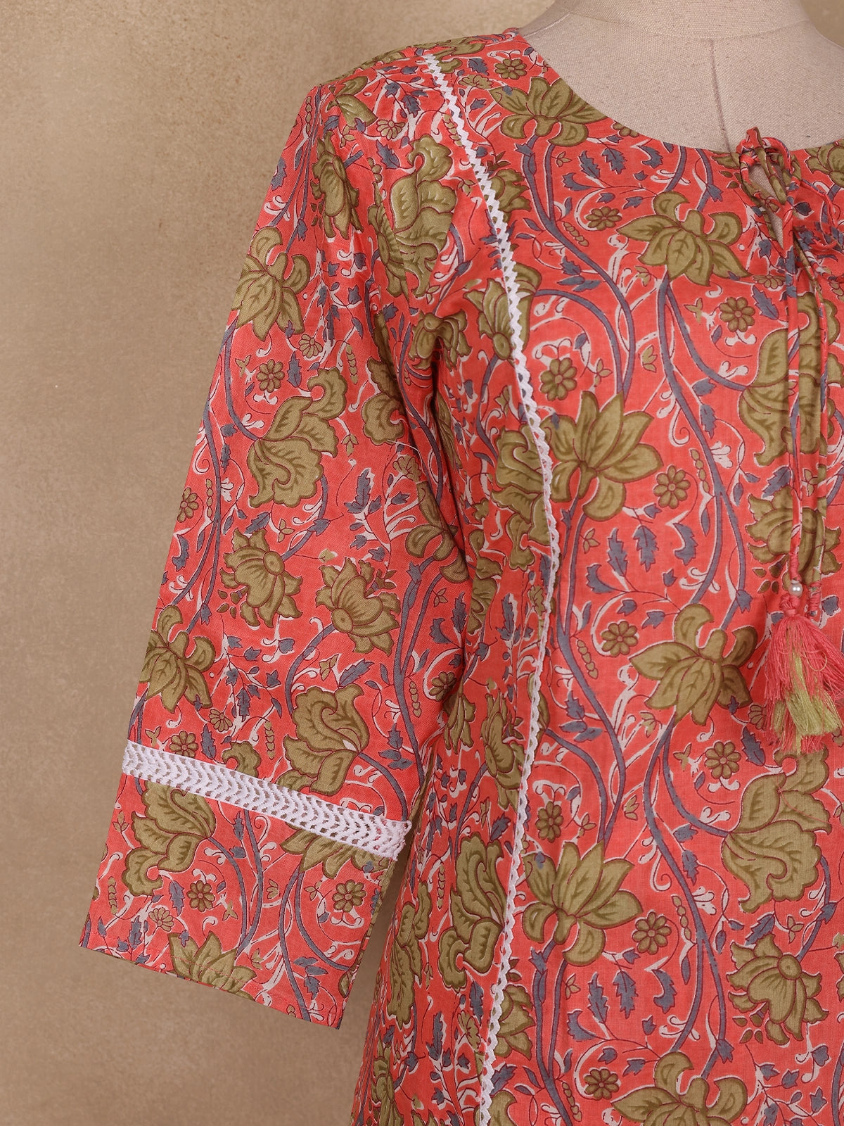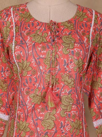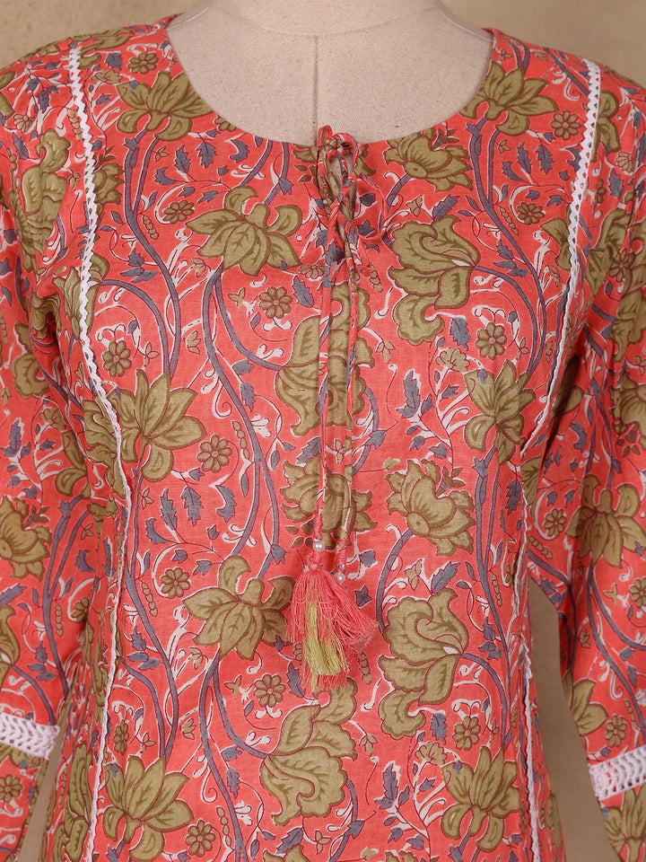 Step into elegance with this coral pink floral printed cotton salwar suit, designed to capture timeless ethnic grace. The kurta showcases traditional hand-block-inspired floral motifs in shades of olive green and soft blue on a coral pink base, exuding a rustic yet refined charm. The round neckline with tasseled tie-up detailing adds a playful touch, while the lace inserts on the sleeves enhance its feminine appeal.