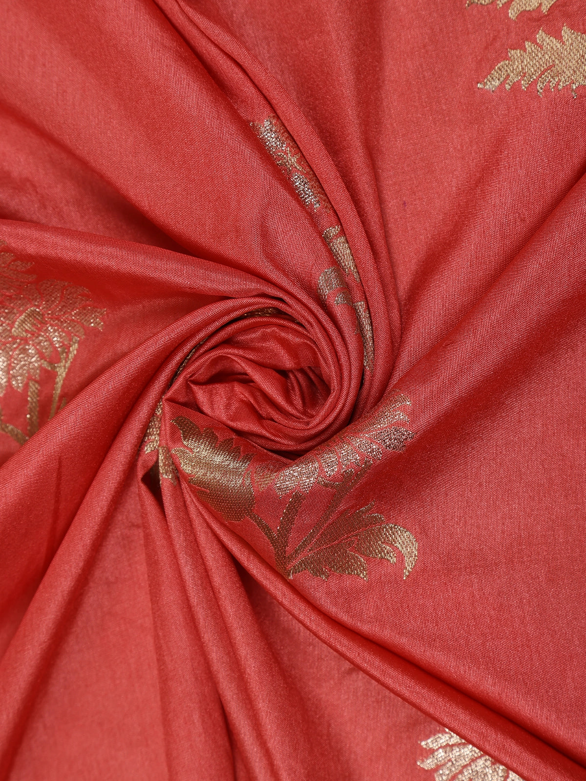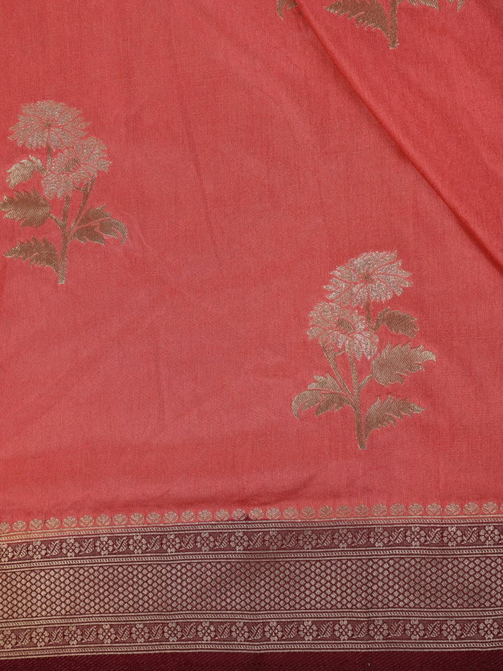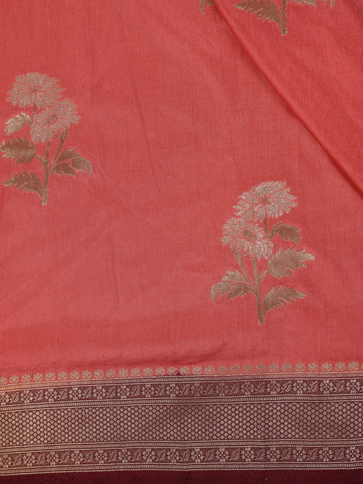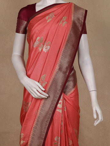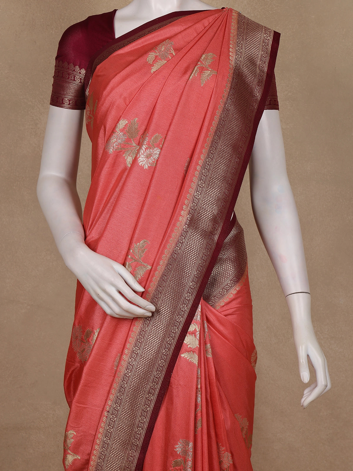 Coral Pink Floral Zari Woven Design Semi Banarasi Saree with Contrast Border