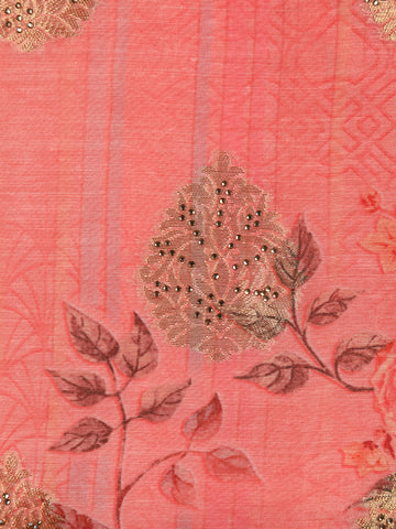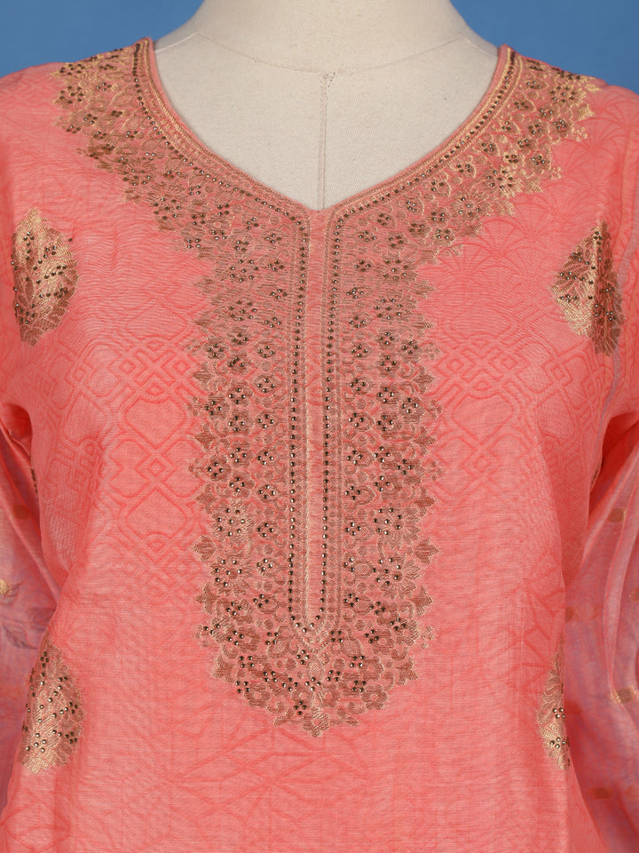 Radiate timeless grace with this Coral Pink Zari Embroidered Banarasi Silk Salwar Suit, an exquisite ensemble that beautifully combines heritage craftsmanship with contemporary charm. The rich Banarasi silk fabric showcases a lustrous finish, while the zari-embroidered neckline and woven floral motifs across the kurta exude festive opulence.