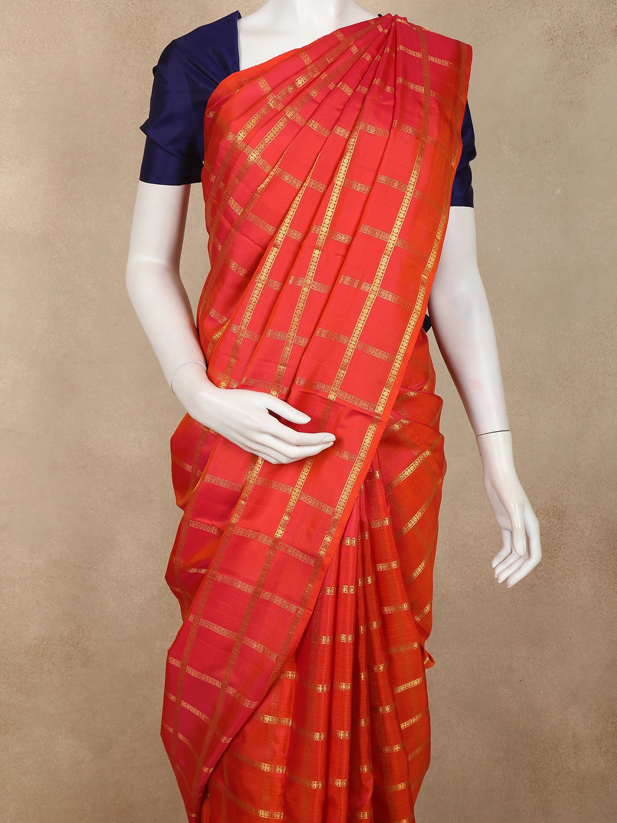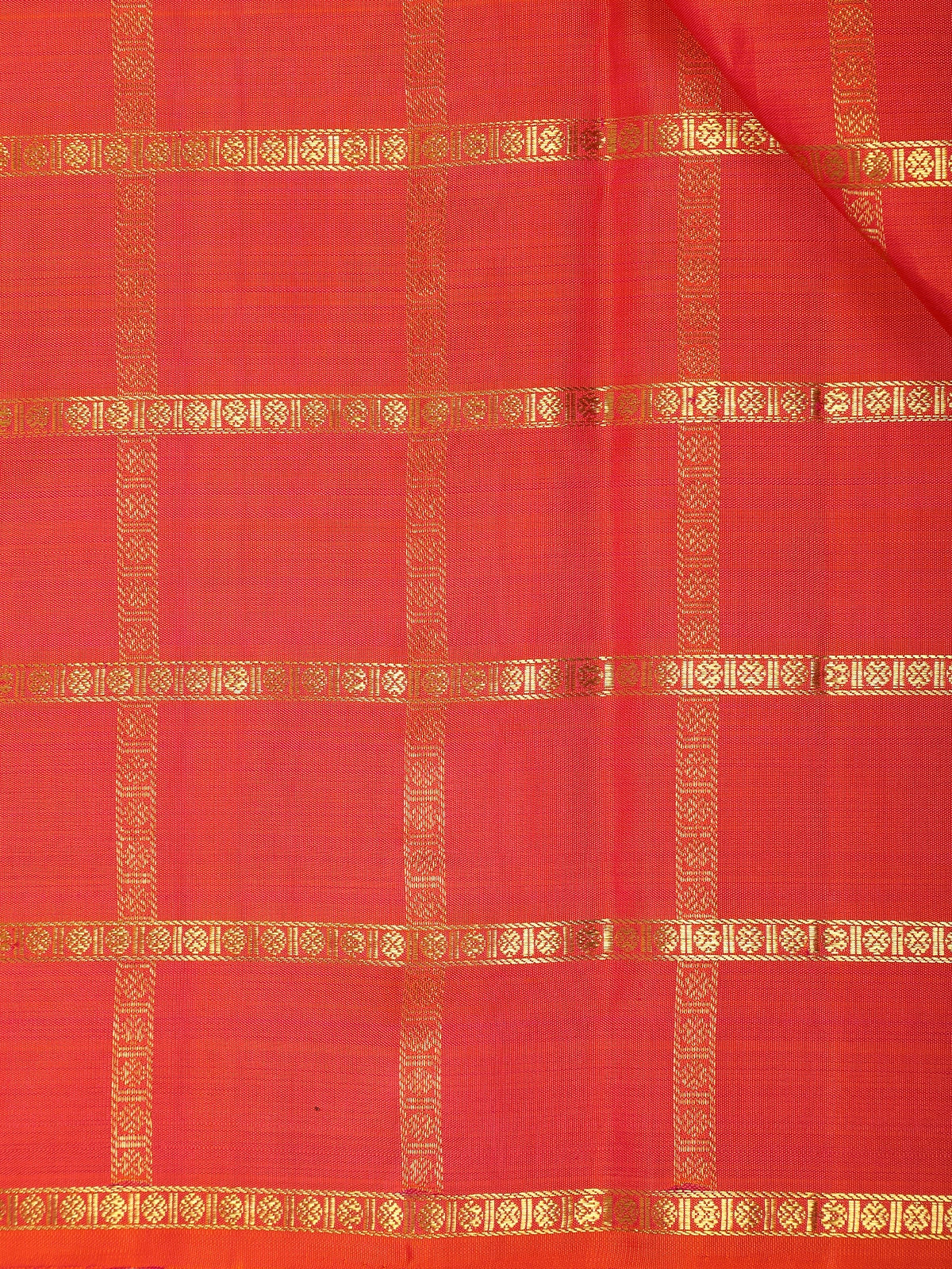 Coral Red Checked Zari Woven Kanchipuram Silk Saree