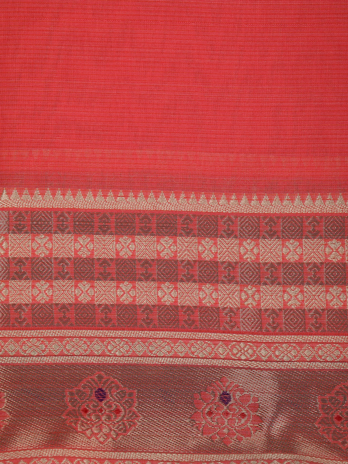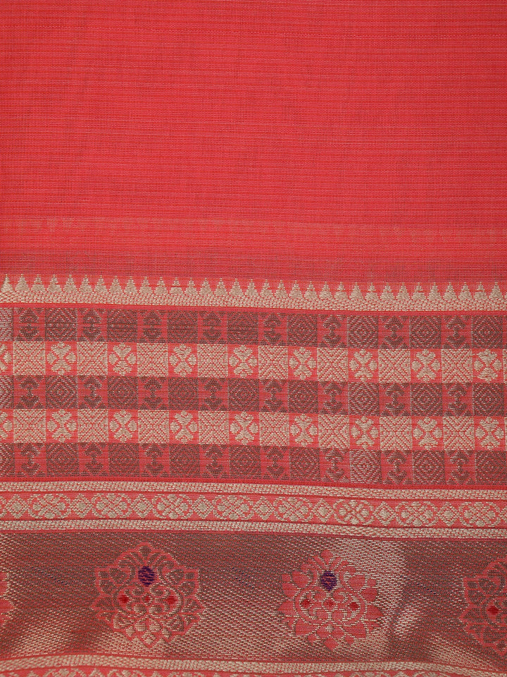 The saree is highlighted by a shimmering zari border, adding just the right touch of festive sparkle without overpowering its simplicity. The matching coral red pallu with delicate zari weaving complements the saree’s body beautifully, creating a seamless flow of elegance from shoulder to pleats.