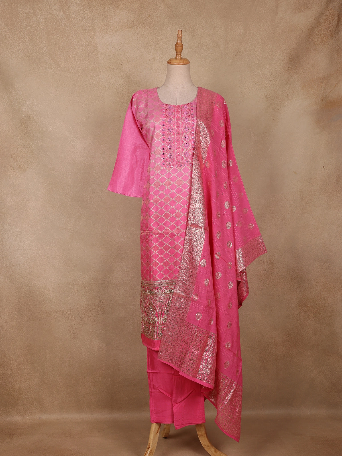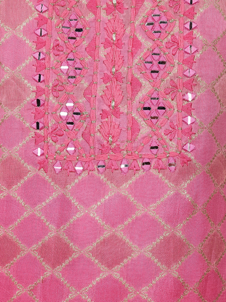 Radiate timeless charm in this exquisite Pink Zari Woven Silk Salwar Suit, a perfect blend of tradition and luxury. The kurta features intricate diamond-shaped zari weaving throughout, highlighted by a beautifully embroidered neckline embellished with delicate mirror work and resham detailing that catches the light with every movement.