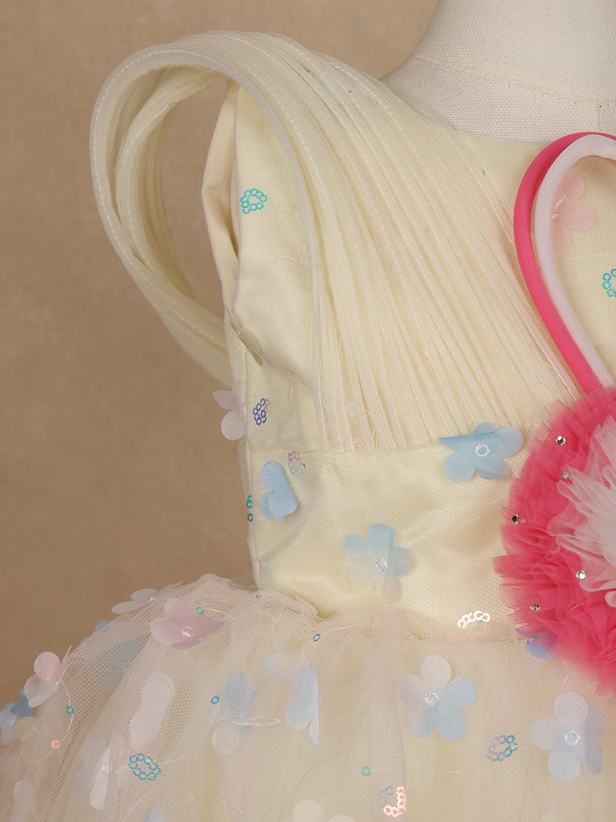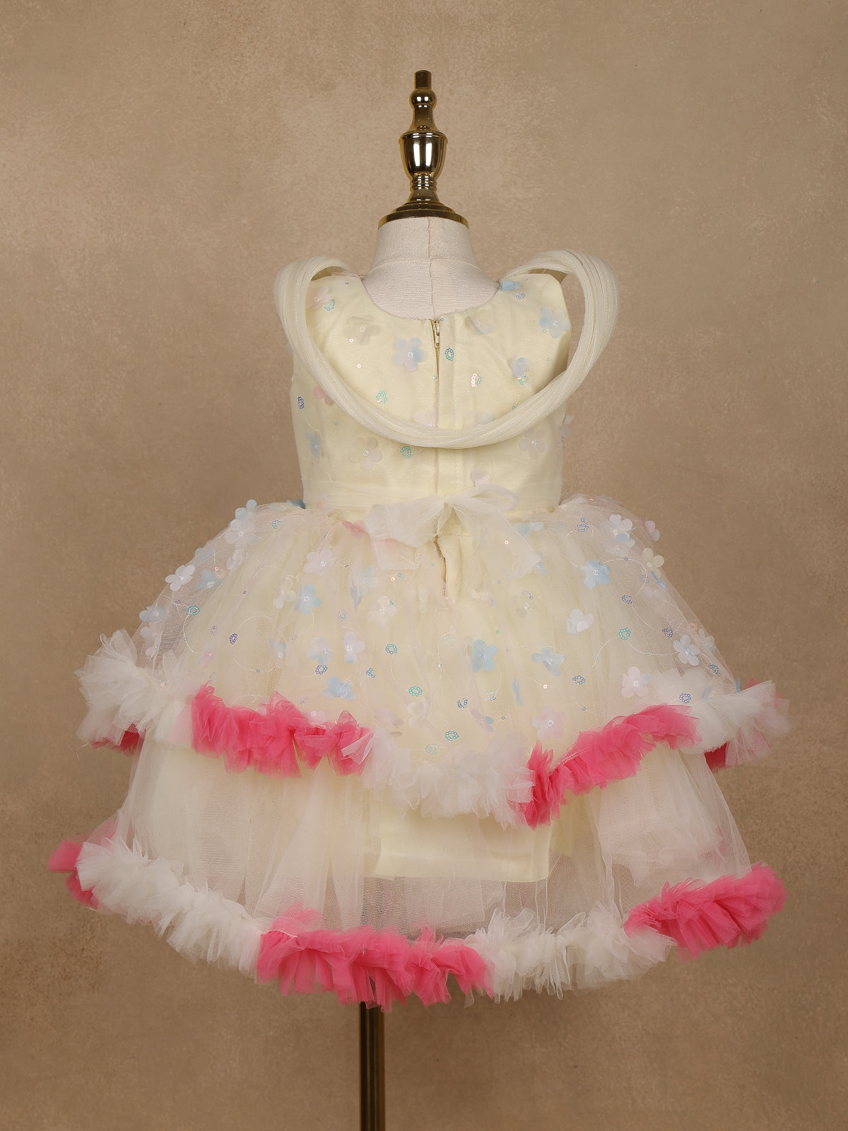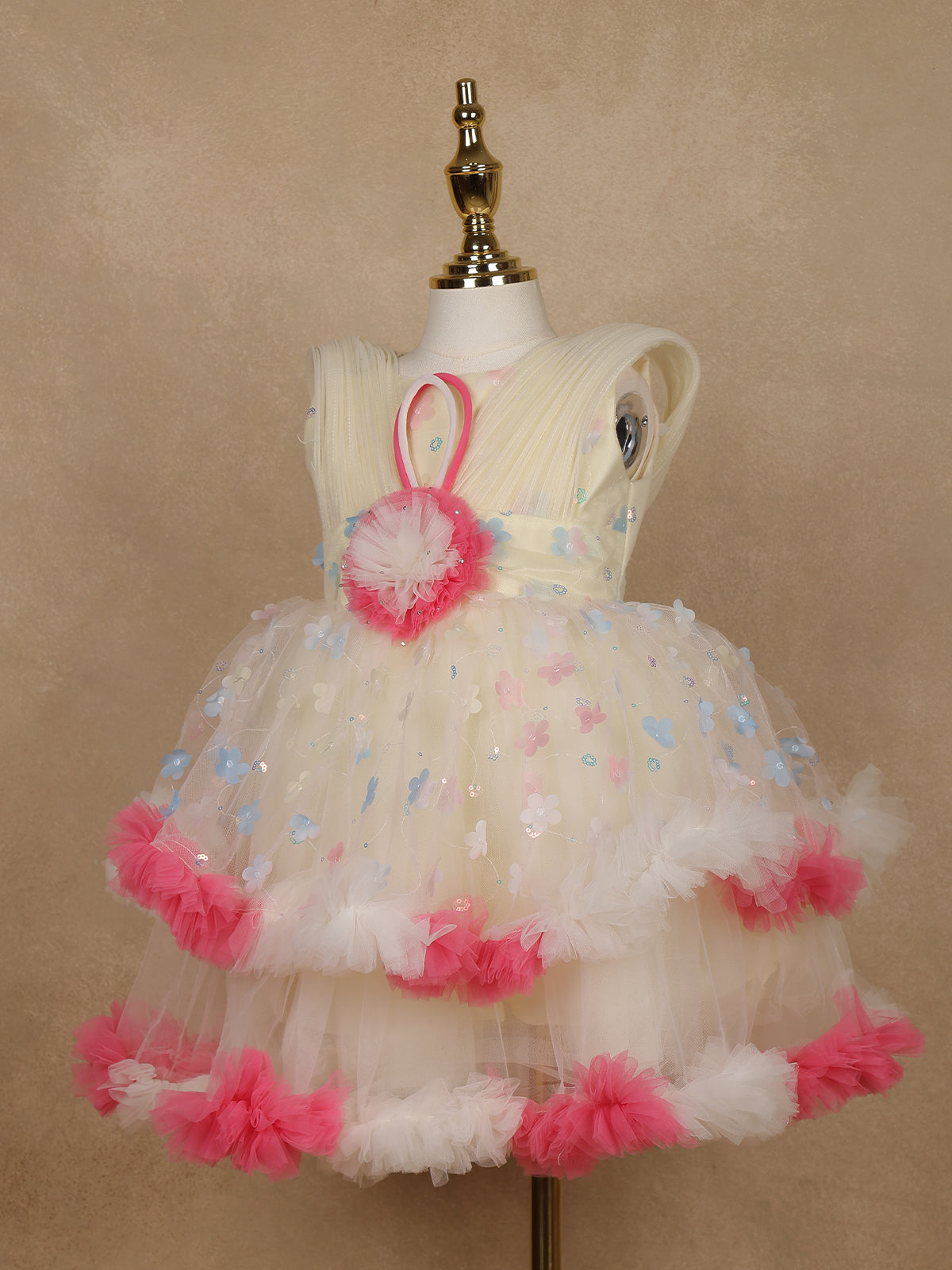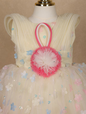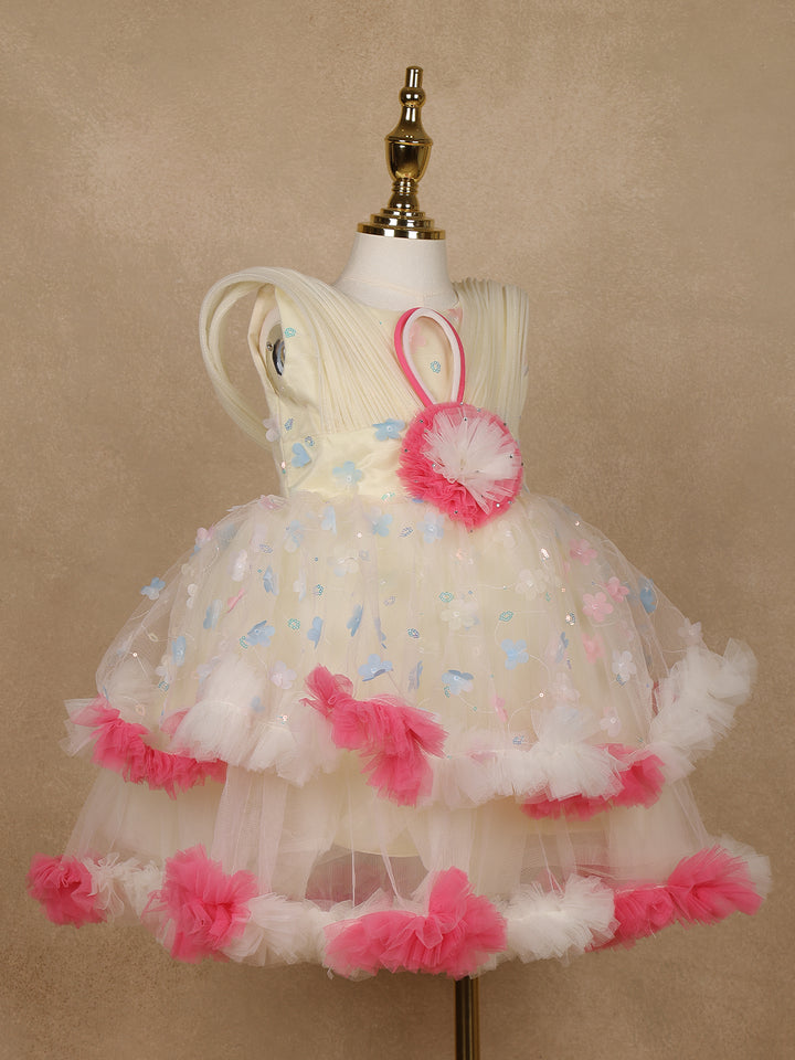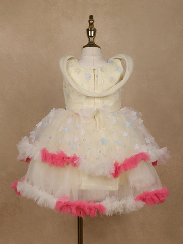 Cream 3D Floral Layered Party Net Frock with Pink Ruffle Accents