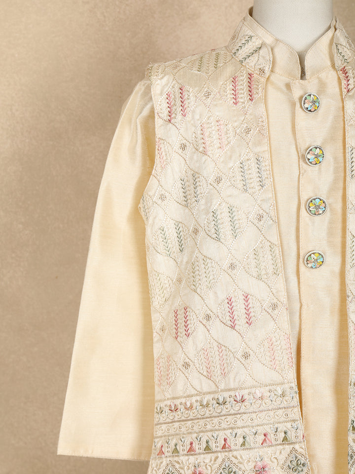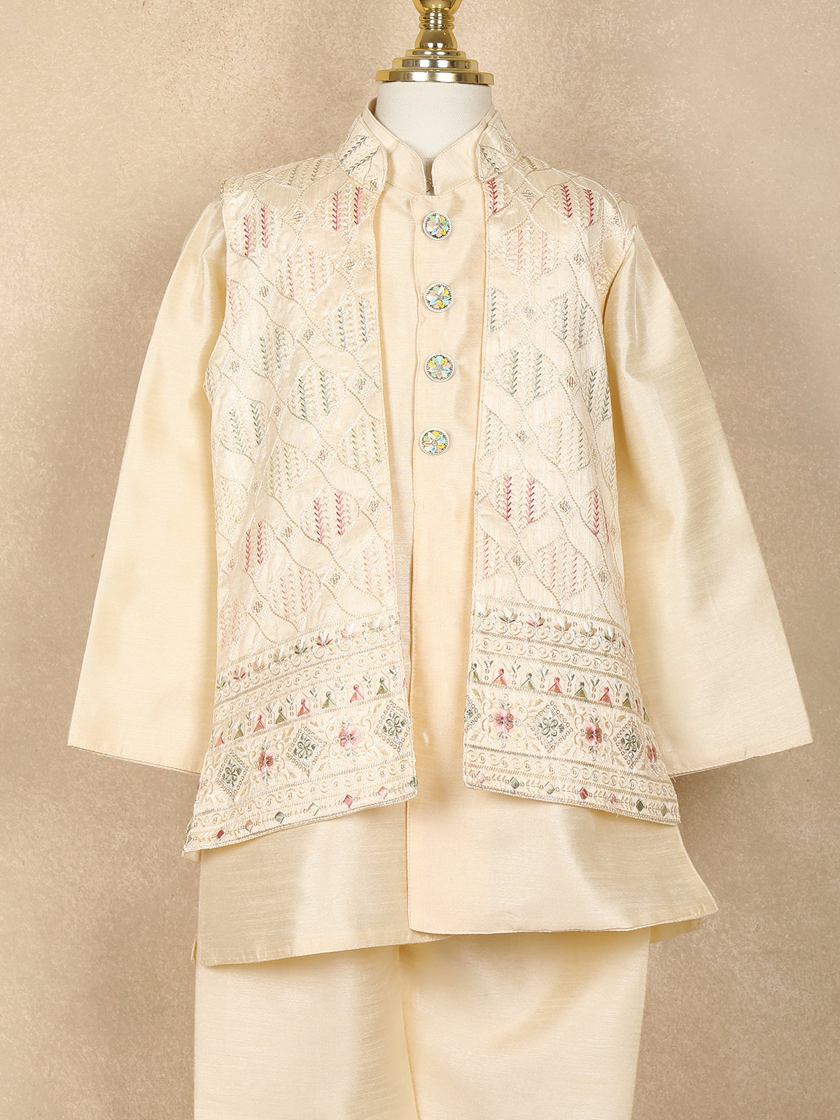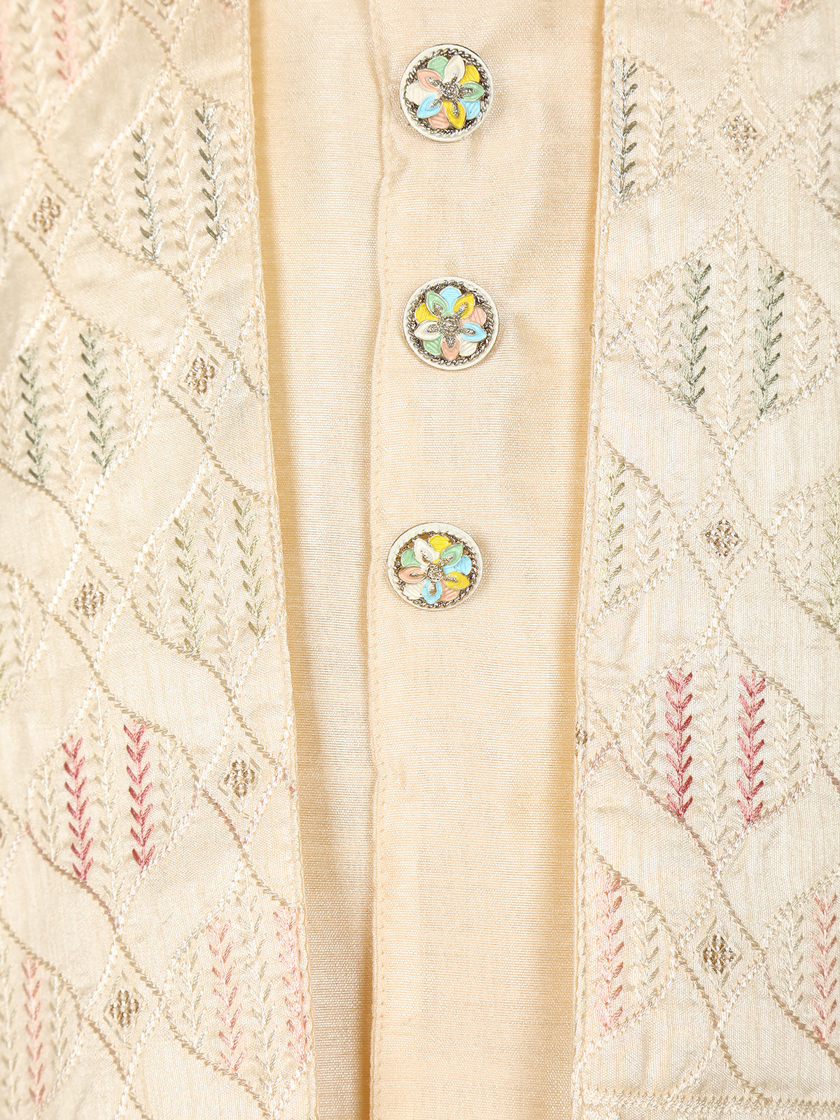 Dress your little one in elegance with this cream embroidered silk sherwani set. The outfit includes a finely-stitched kurta, coordinated pants, and a beautifully patterned jacket showcasing diamond-style thread motifs in soft pastel hues. The standout floral enamel buttons add a premium festive charm, making it ideal for ethnic occasions, family functions, and ceremonies.