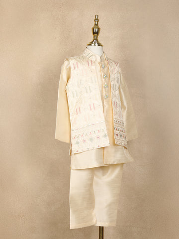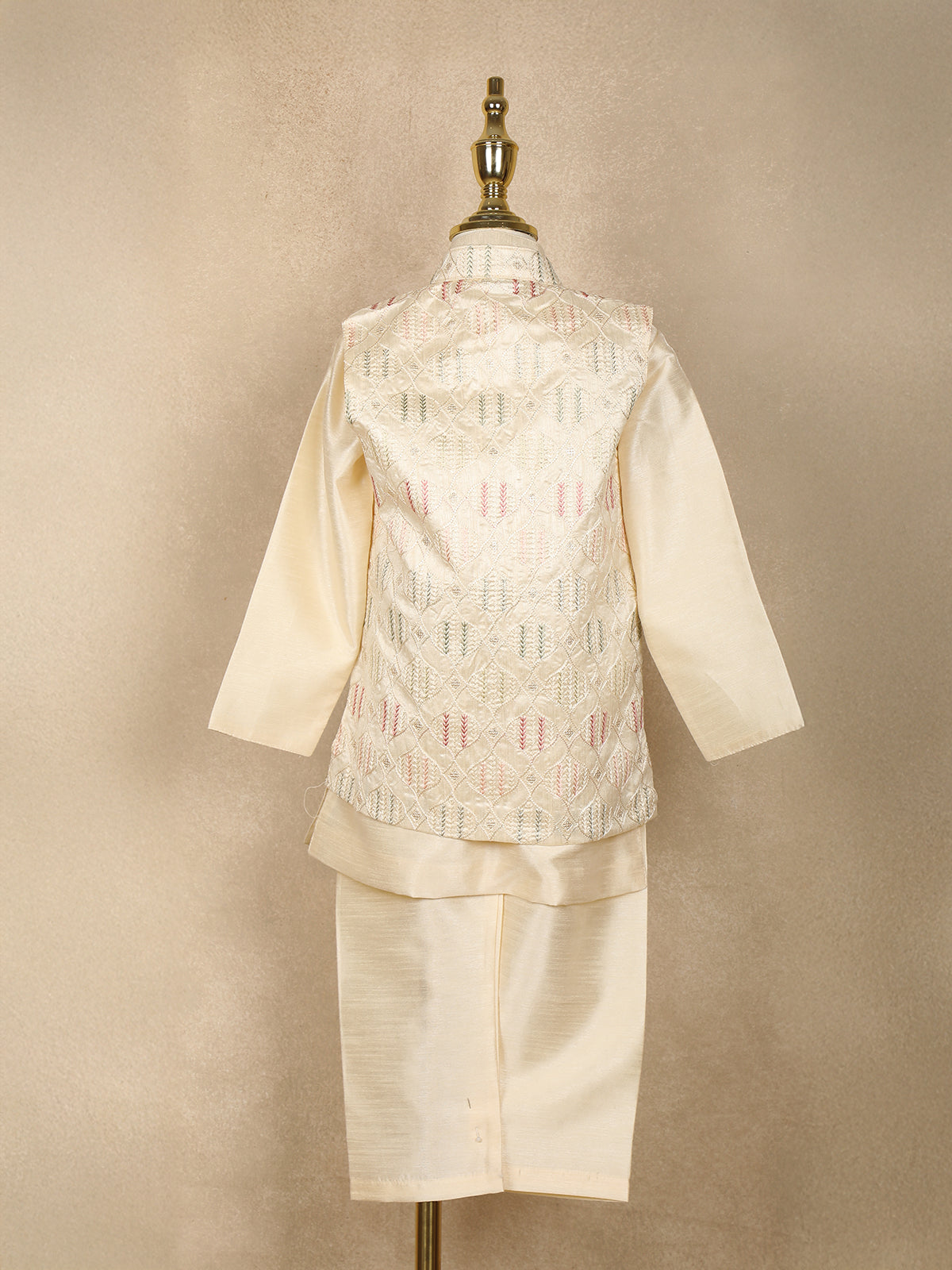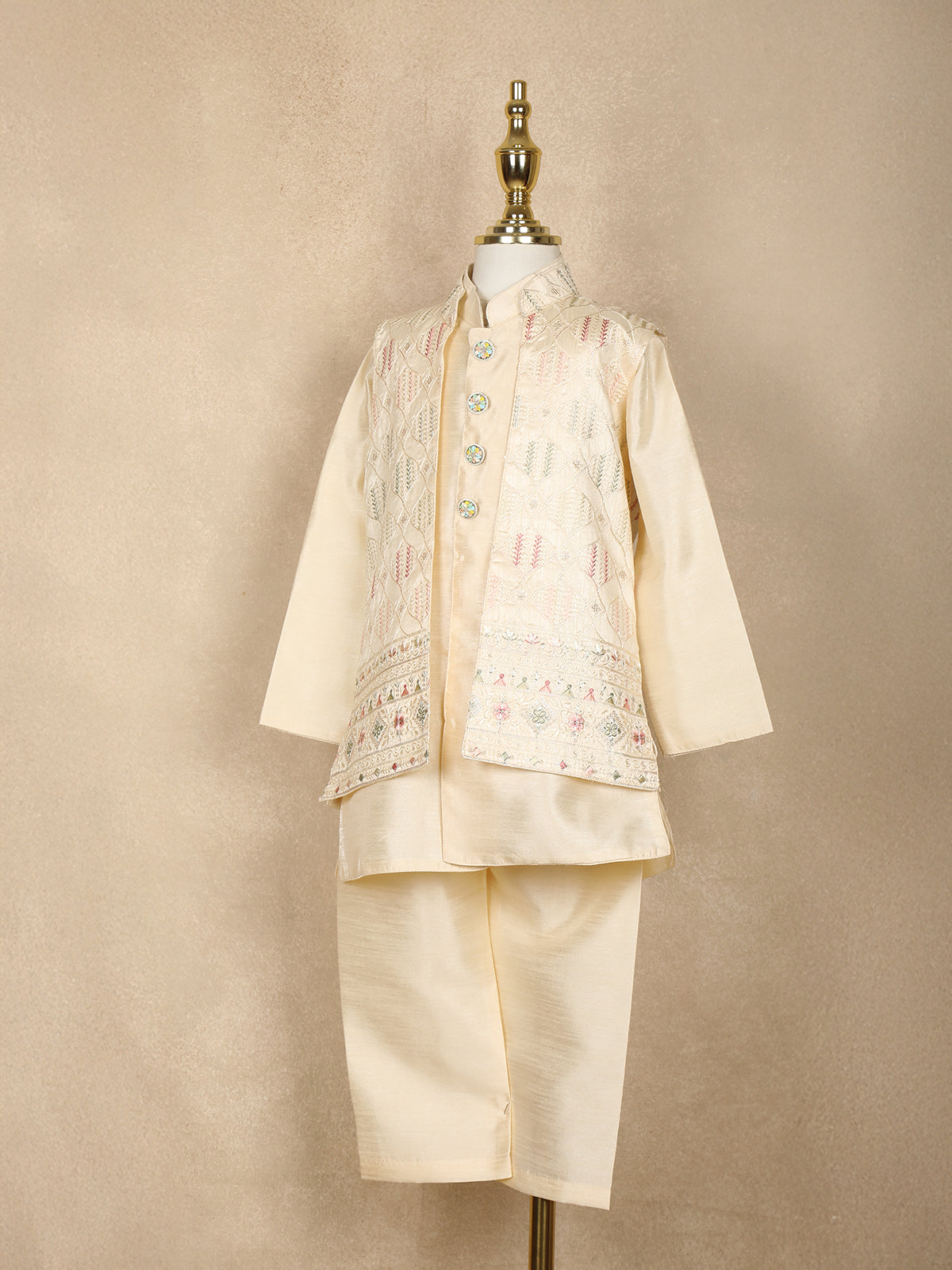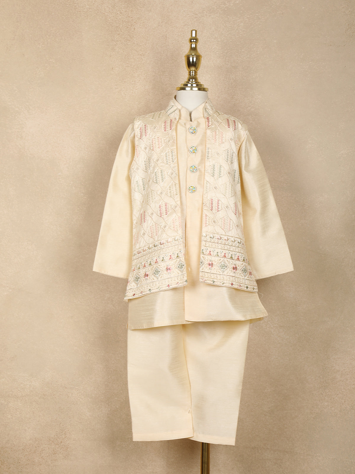 Dress your little one in elegance with this cream embroidered silk sherwani set. The outfit includes a finely-stitched kurta, coordinated pants, and a beautifully patterned jacket showcasing diamond-style thread motifs in soft pastel hues. The standout floral enamel buttons add a premium festive charm, making it ideal for ethnic occasions, family functions, and ceremonies.