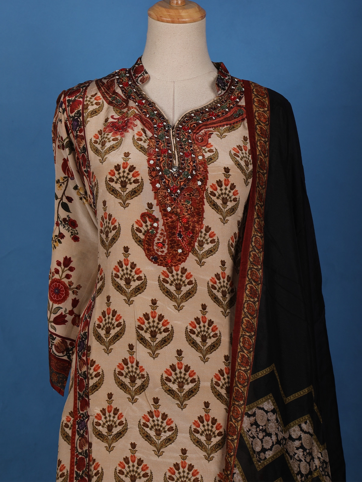 The floral design is beautifully complemented by delicate embroidery work, adding a hint of sparkle and sophistication. Its straight-cut silhouette creates a timeless look that’s both graceful and comfortable — perfect for festive gatherings, parties, or family celebrations.