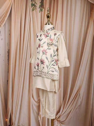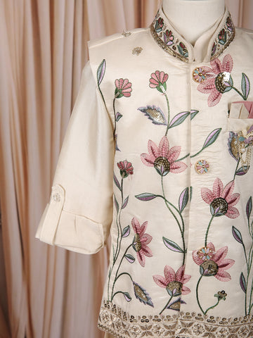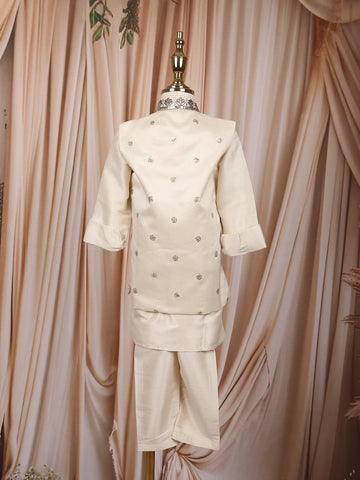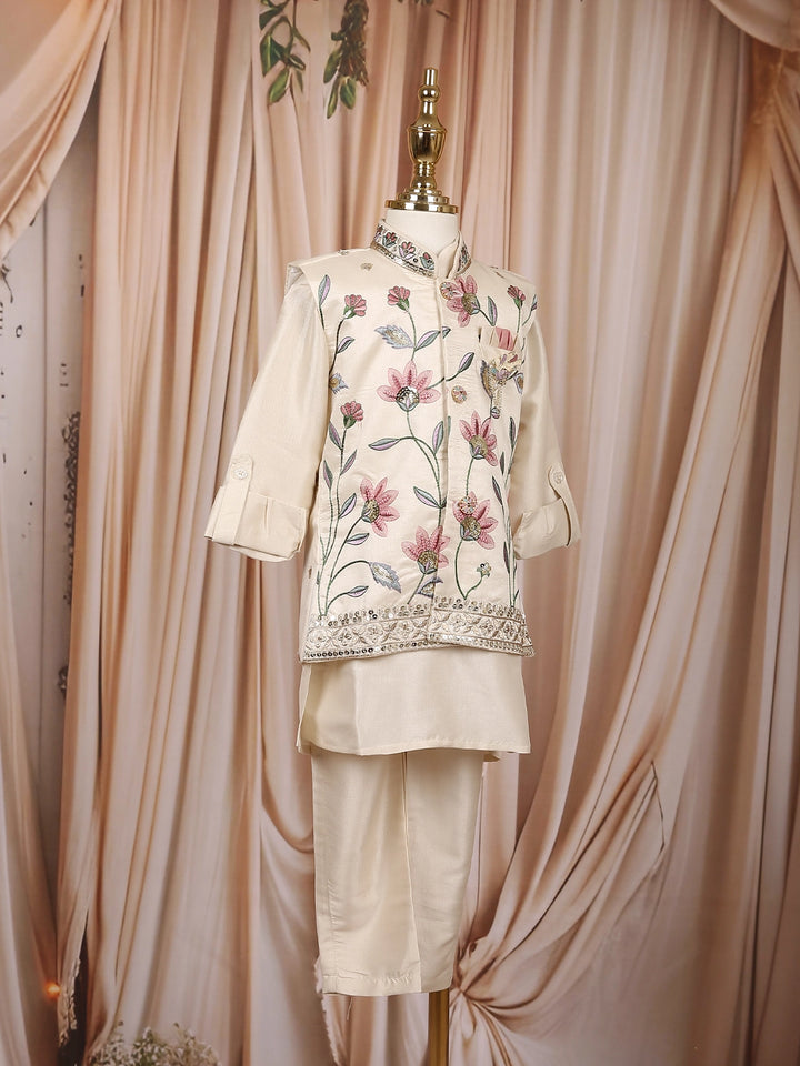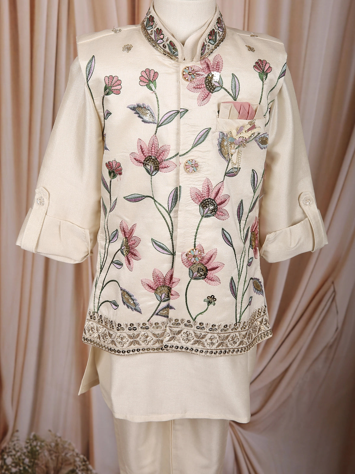 Cream Floral Embroidered Jacket Silk Kurta Set for Boys