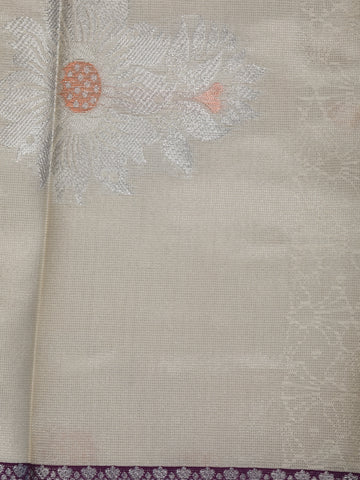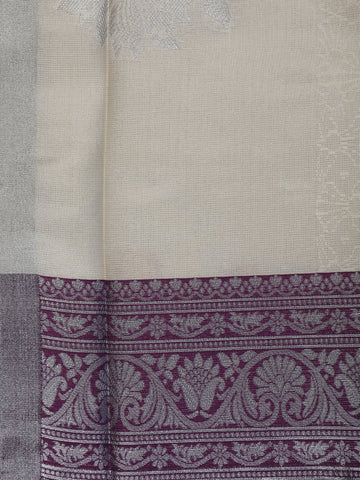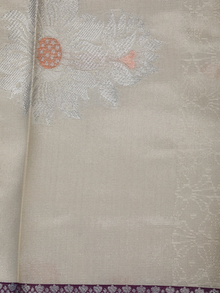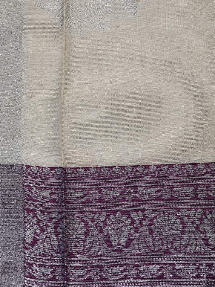 Cream Floral Woven Art Silk Saree With Contrast Silver And Purple Zari Border