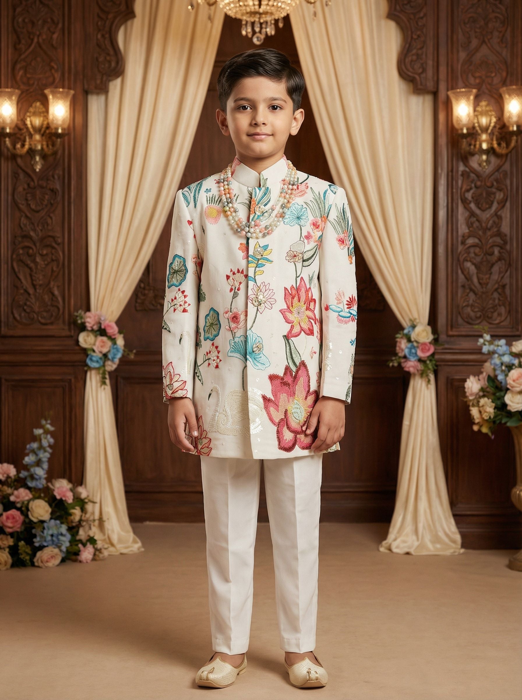 Intricate floral embroidery adorns the sherwani, showcasing delicate craftsmanship and adding a touch of regal artistry. The embroidery enhances the fabric without overpowering it, creating a balanced and graceful visual appeal.
