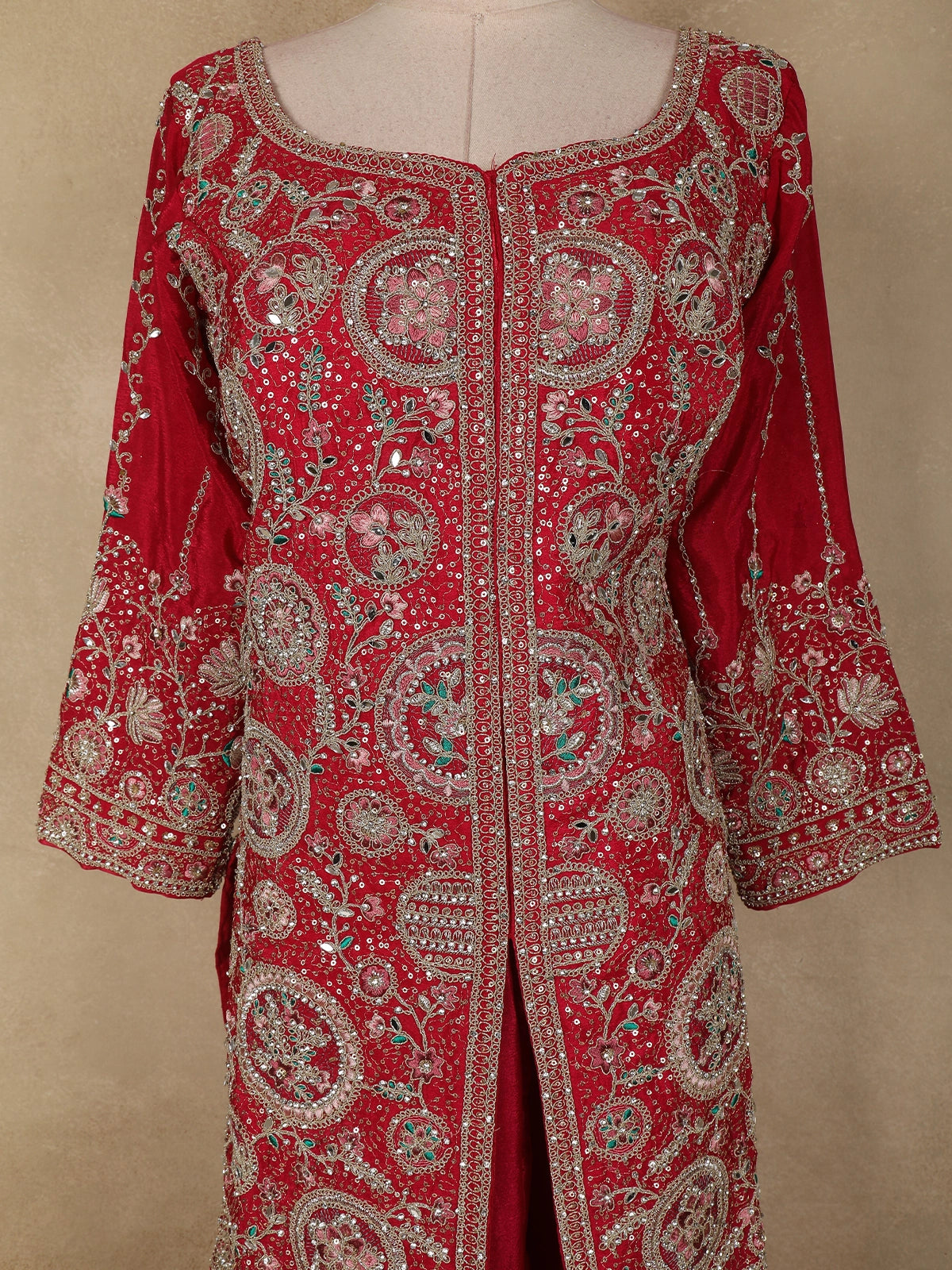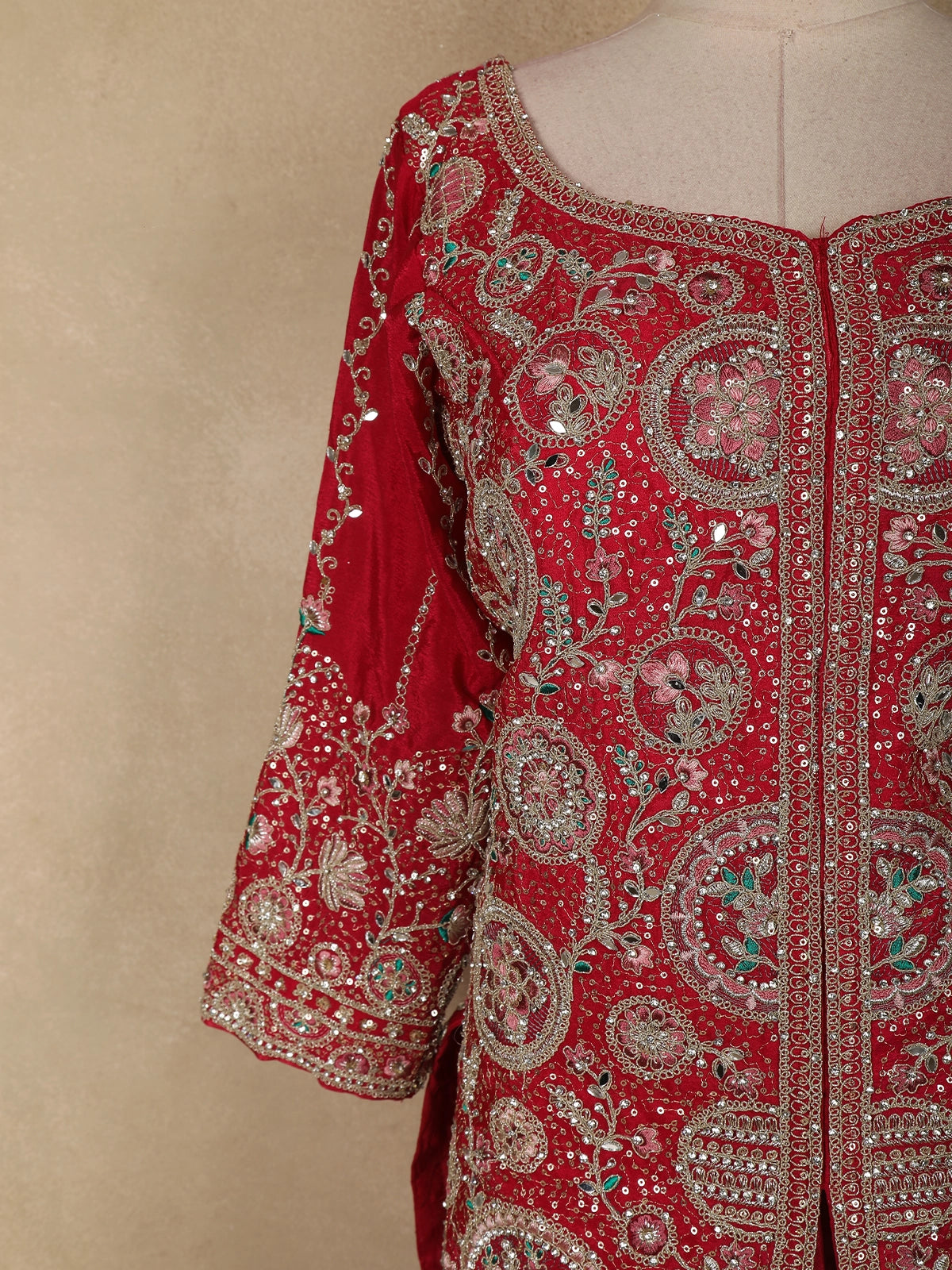 Make a striking statement with this Dark Pink Floral Sequins and Beads Embroidered Palazzo Set, designed to exude timeless elegance and festive charm. Crafted in flowy georgette, the kurta showcases intricate floral motifs highlighted with shimmering sequins, delicate beadwork, and fine thread embroidery that lend a luxurious, handcrafted appeal. The richly detailed embroidery is beautifully balanced with ornate borders, enhancing the overall sophistication of the ensemble.