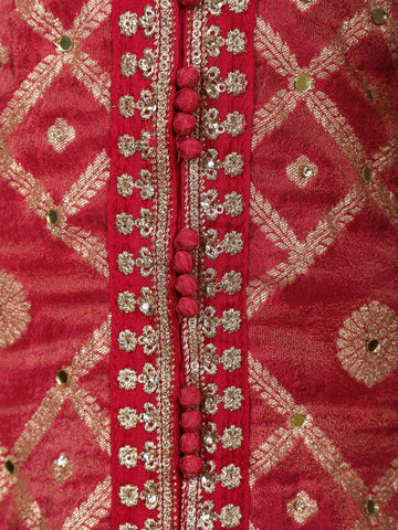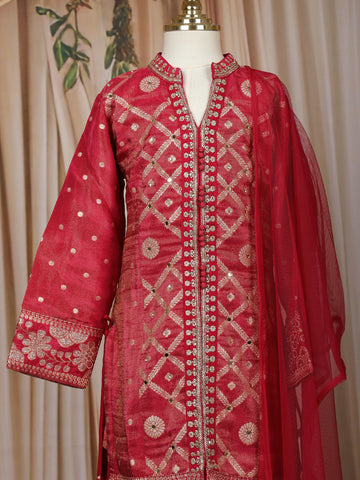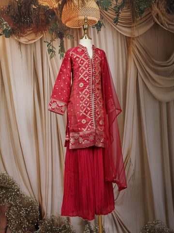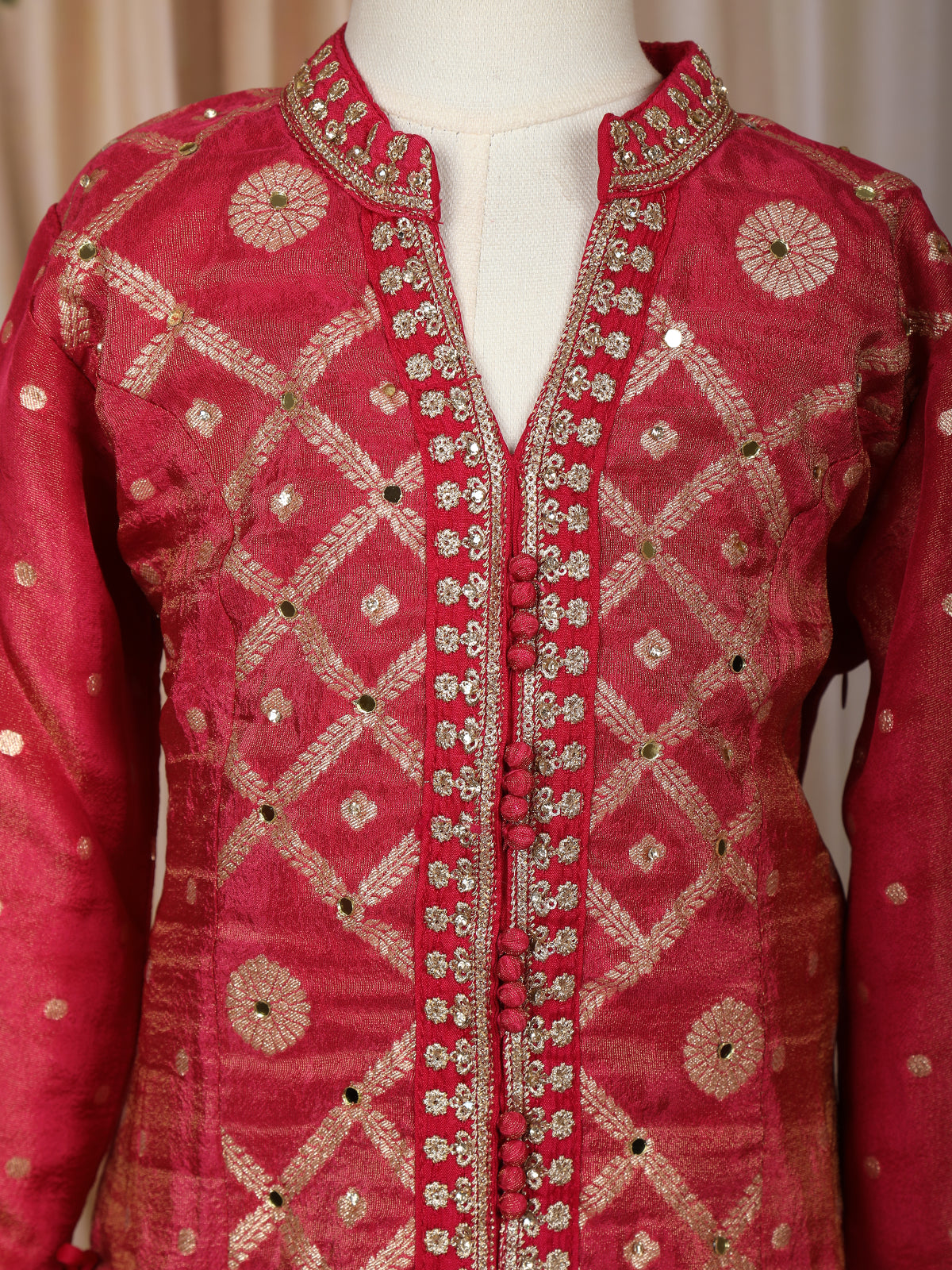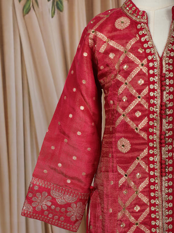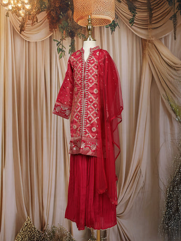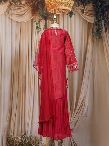 Crimson Red Mirror And Embroidered Design Tissue Silk Kids Palazzo Suit