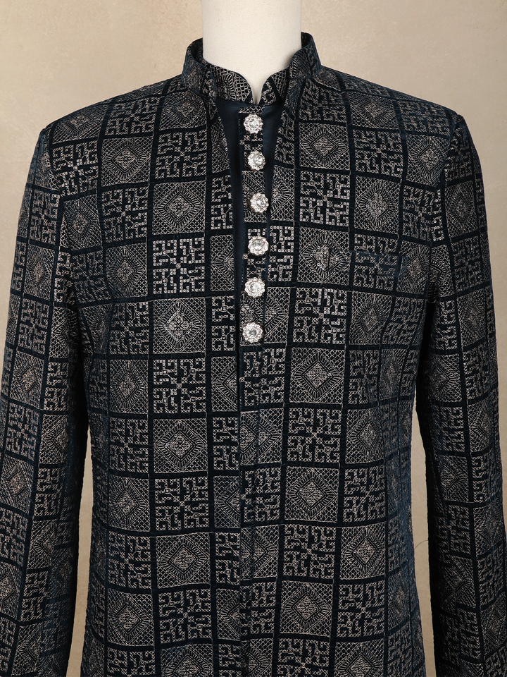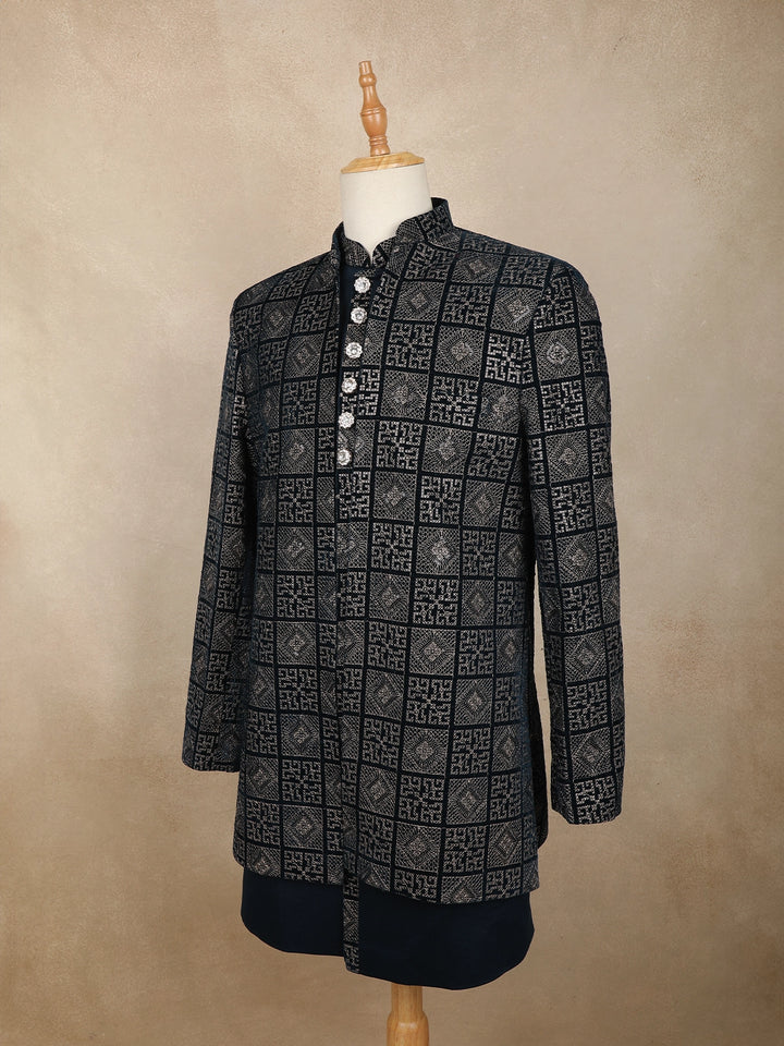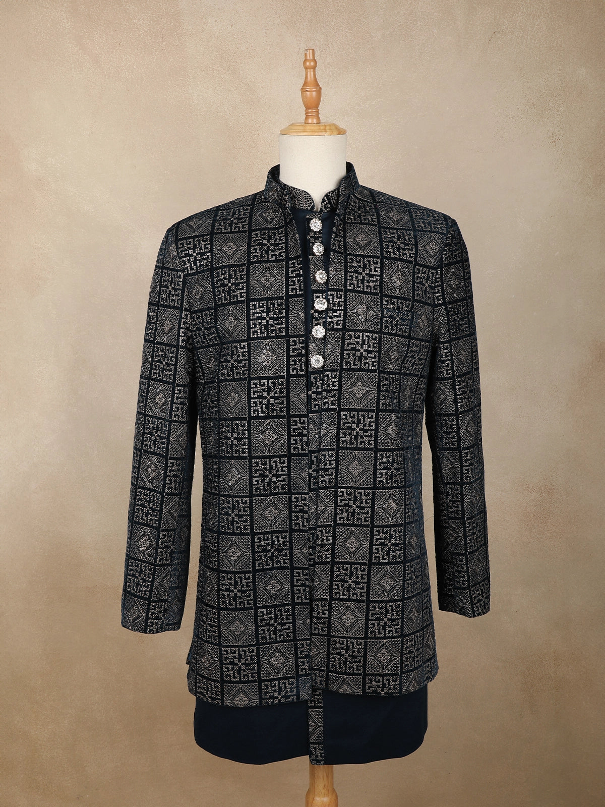 Dark Blue Geometric Thread Embroidered Design Velvet Indo-Western Sherwani Set