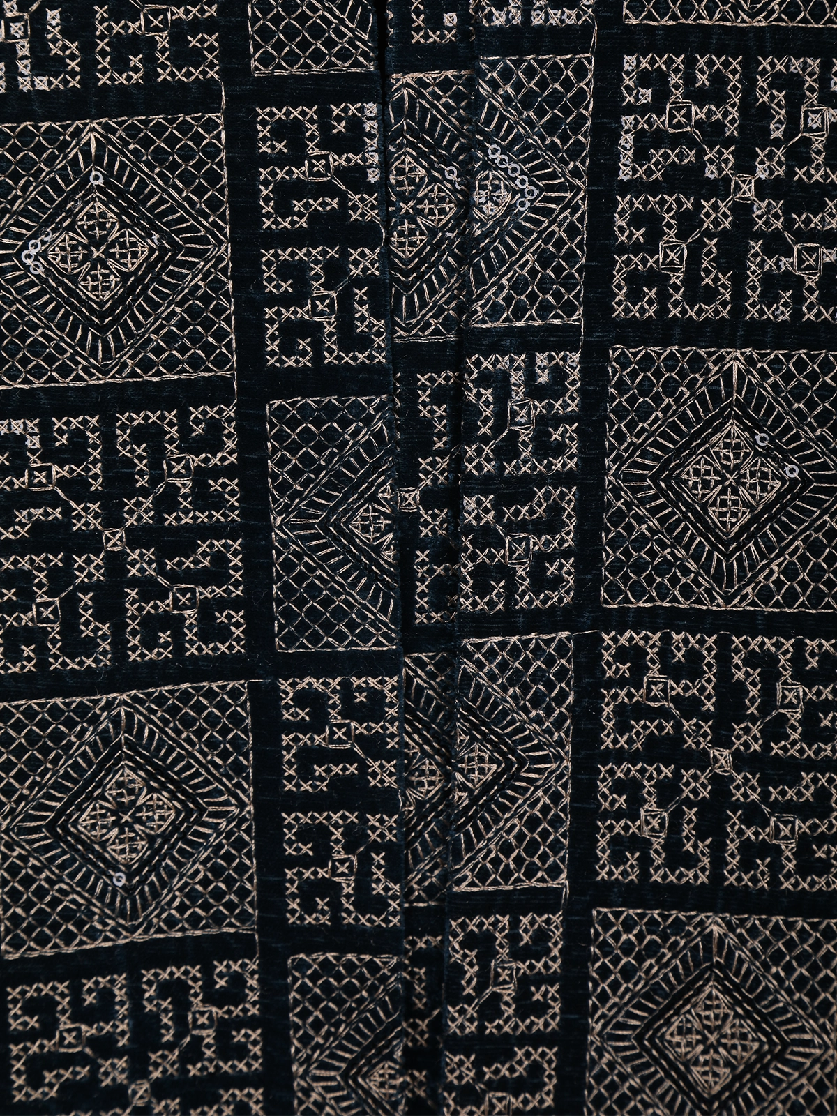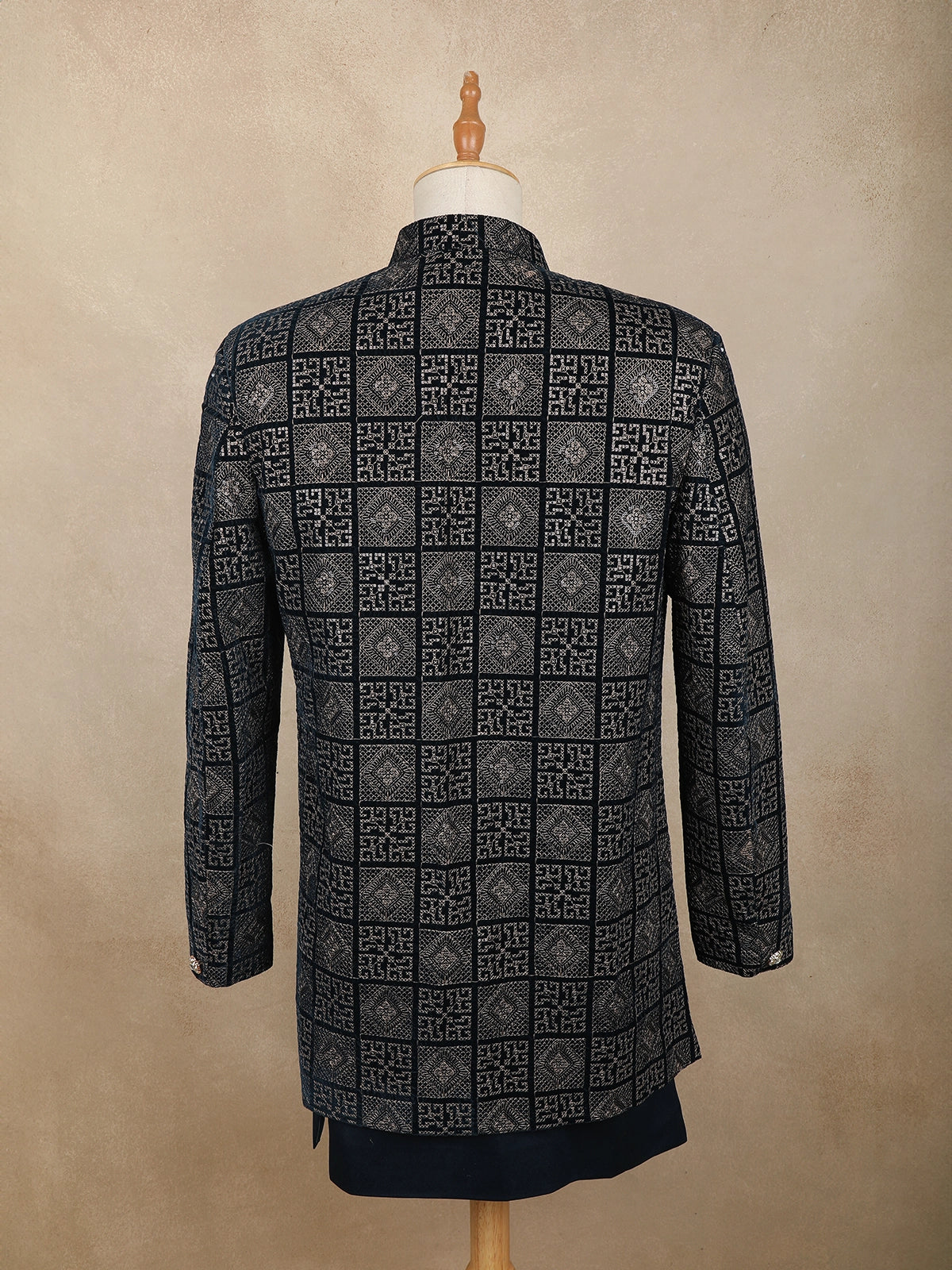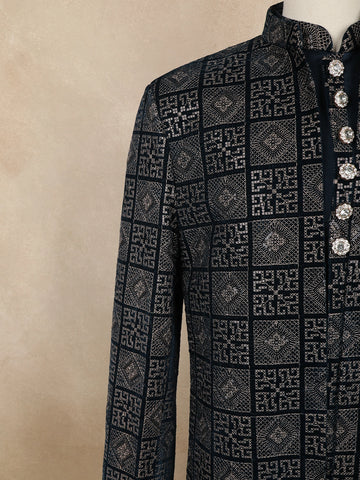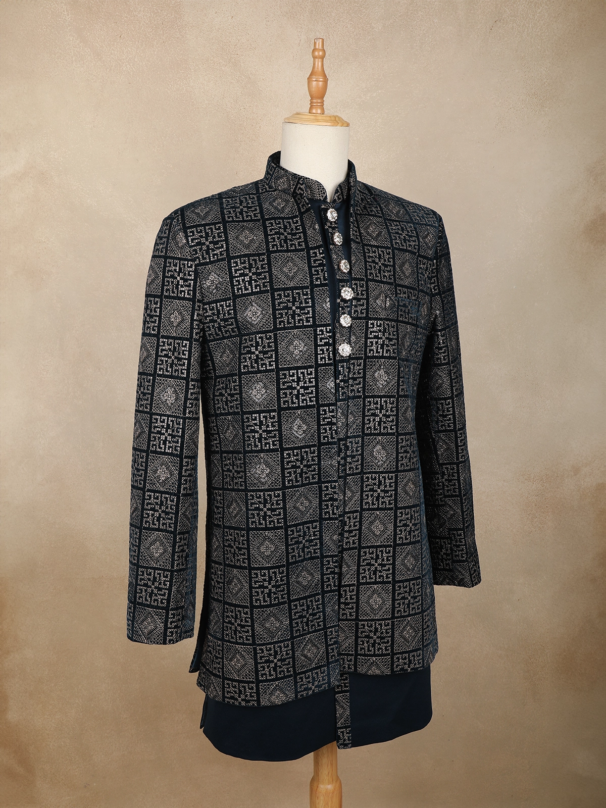 Dark Blue Geometric Thread Embroidered Design Velvet Indo-Western Sherwani Set