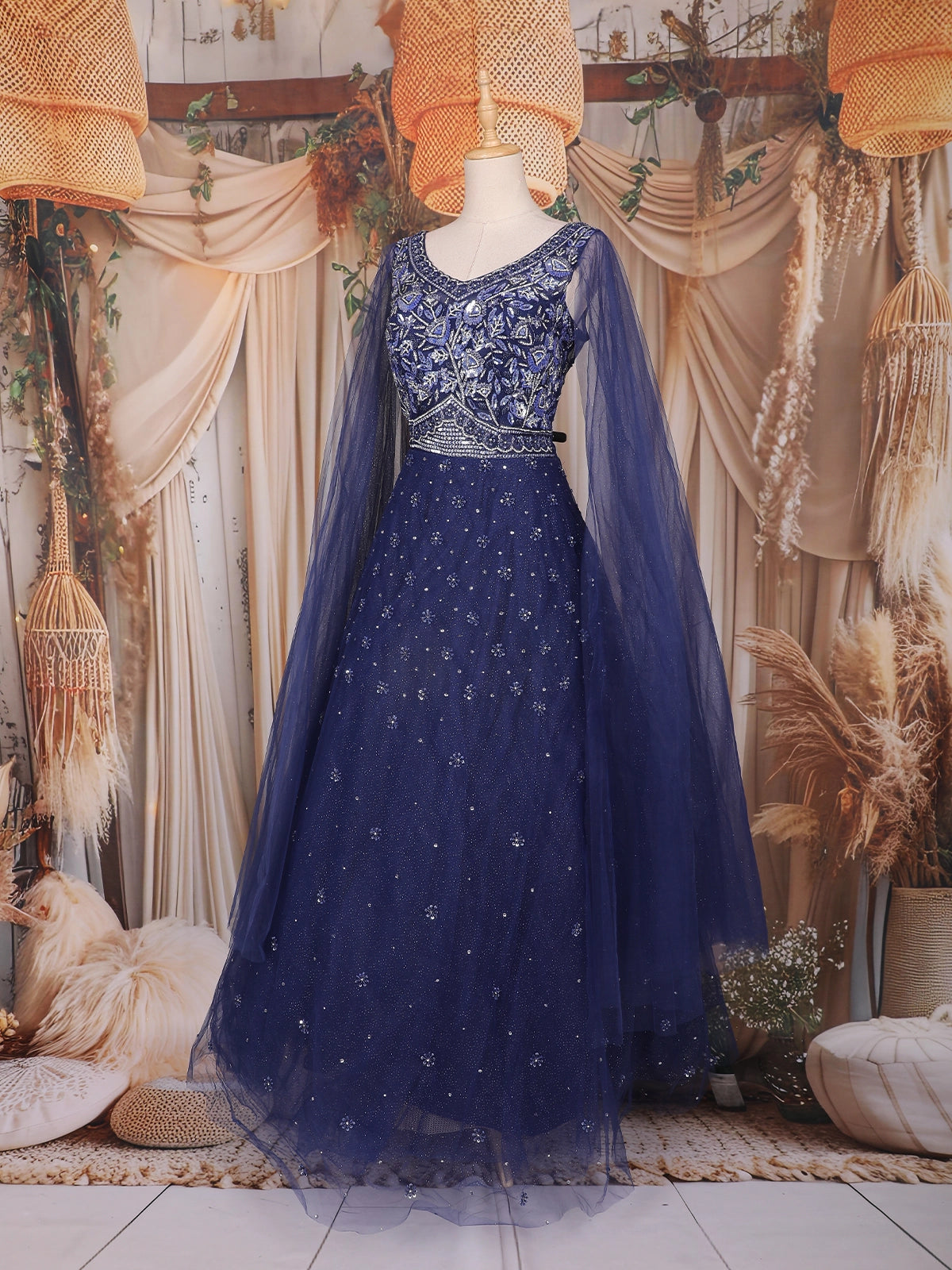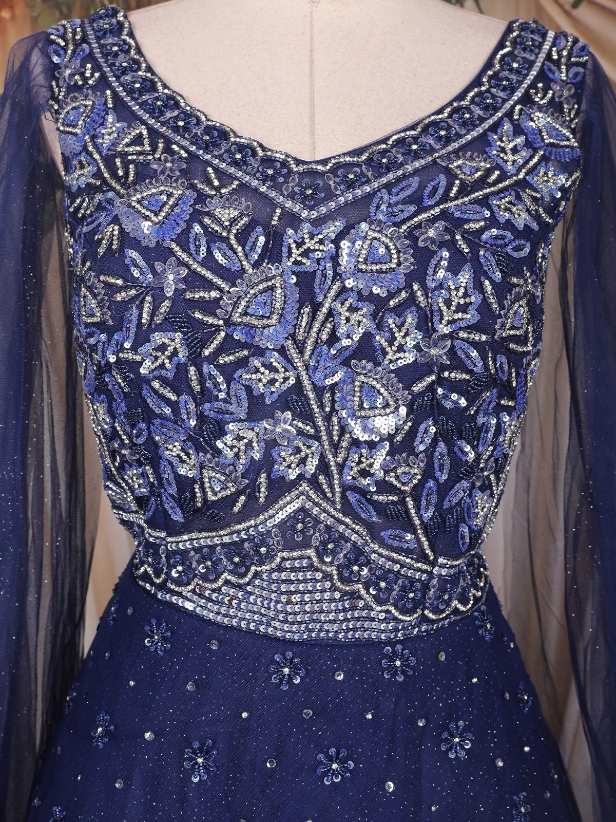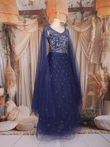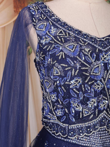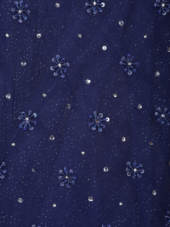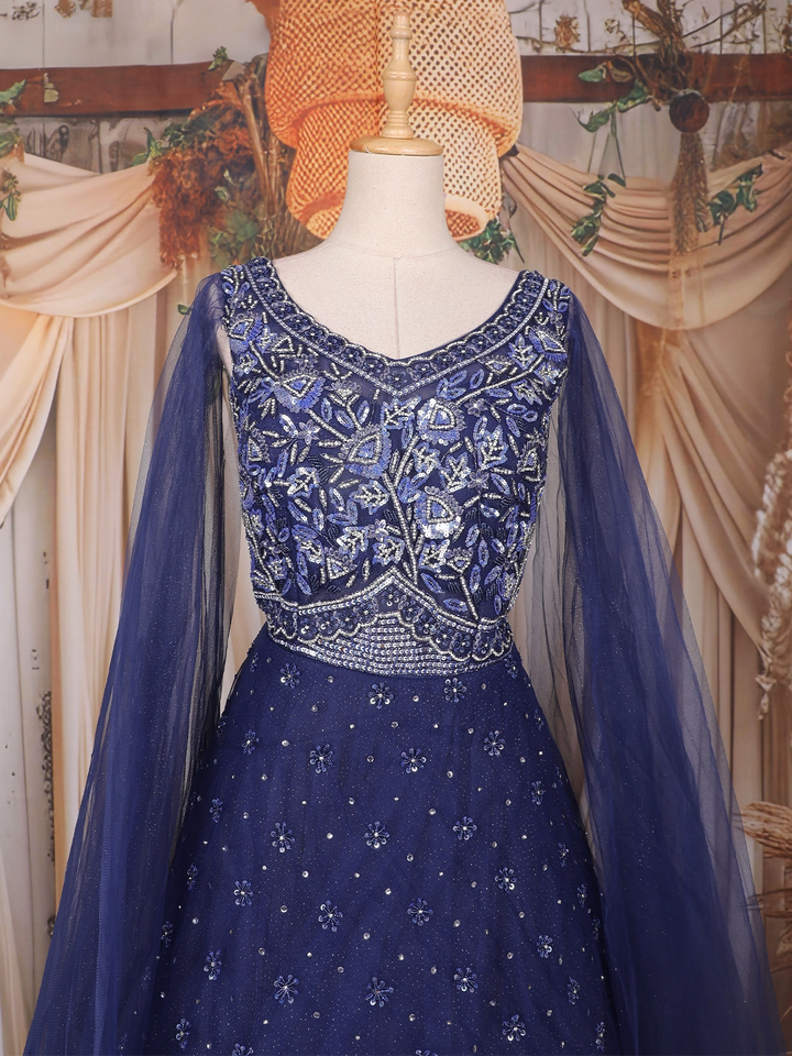Dark Blue Sequins and Beads Embroidered Design Net Gown
