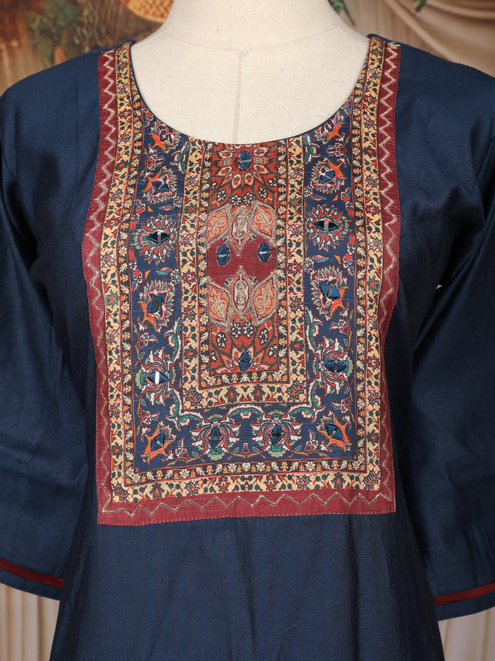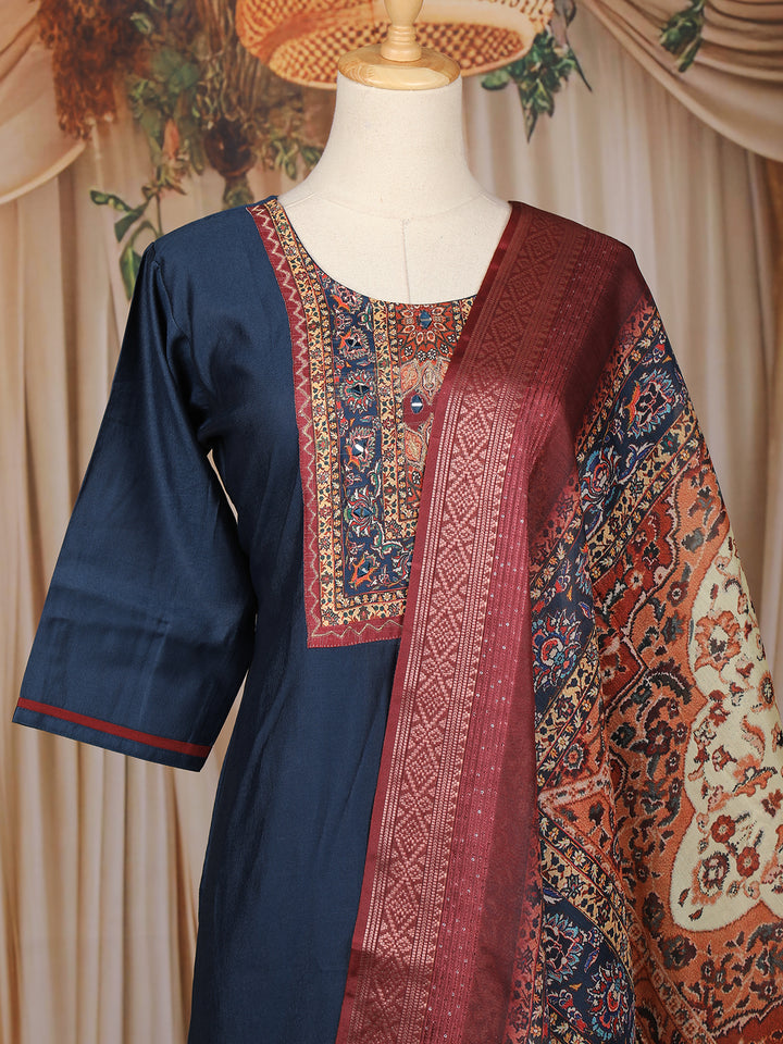 Dark Blue Solid Design Silk Cotton Salwar Suit With Embroidered Yoke
