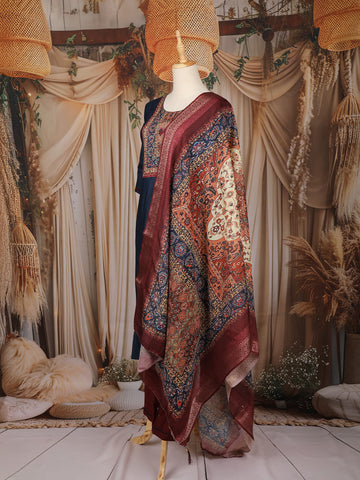 Exude understated elegance in this Blue Solid Design Silk Cotton Salwar Suit, blending traditional craftsmanship with timeless charm. The rich blue kurta features an intricately woven and embroidered yoke panel in contrast maroon and beige tones, inspired by geometric Ikat motifs. The round neckline and 3/4 sleeves add simplicity and ease to the design, making it ideal for daily wear or festive gatherings.