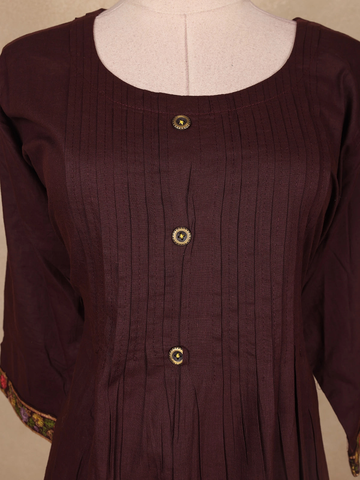 Radiate understated elegance with this Dark Chocolate Cotton Salwar Suit, designed with subtle pintuck detailing and accentuated with antique buttons along the front placket. The soft cotton fabric offers effortless comfort, while the multicolor floral embroidery on the dupatta adds a burst of vibrance against the deep, rich tone. The sleeves feature embroidered cuffs that enhance its refined appeal.