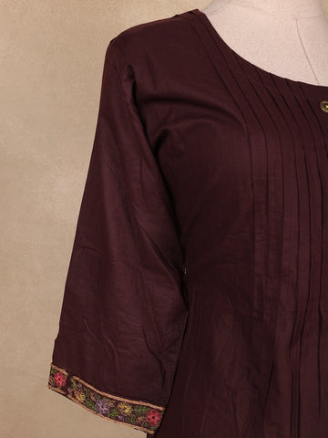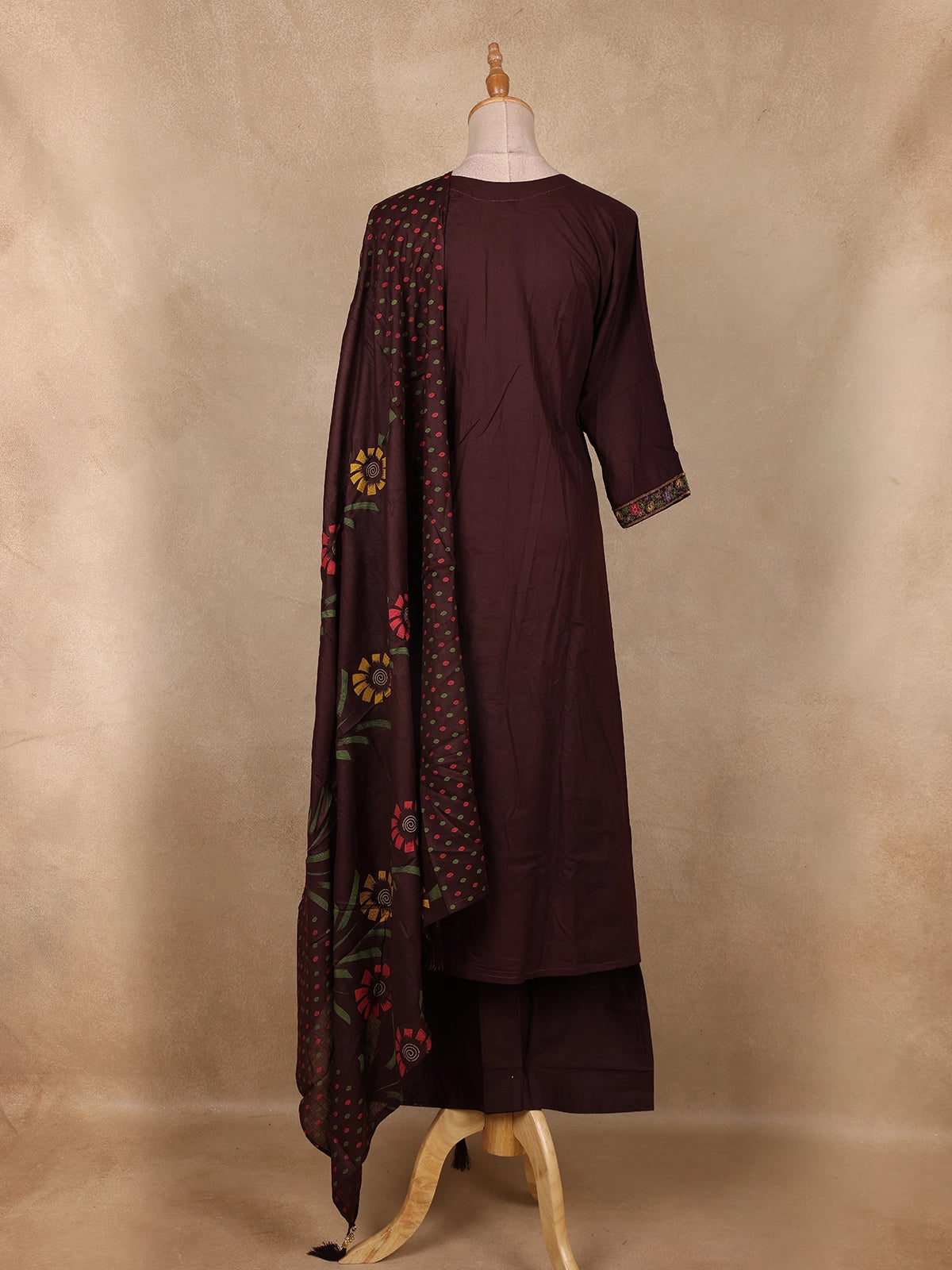 Dark Chocolate Brown Floral Embroidered Cotton Salwar Suit with Dupatta