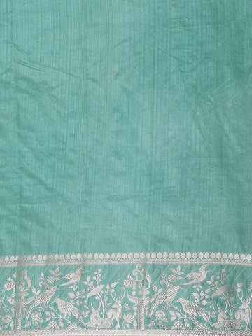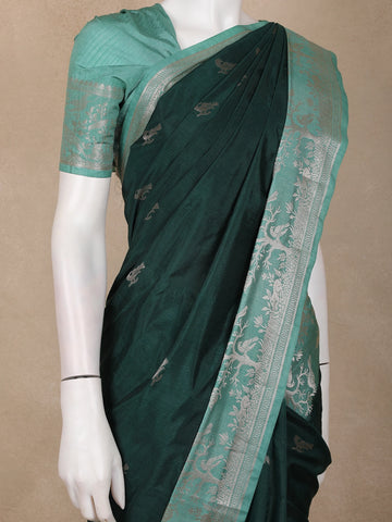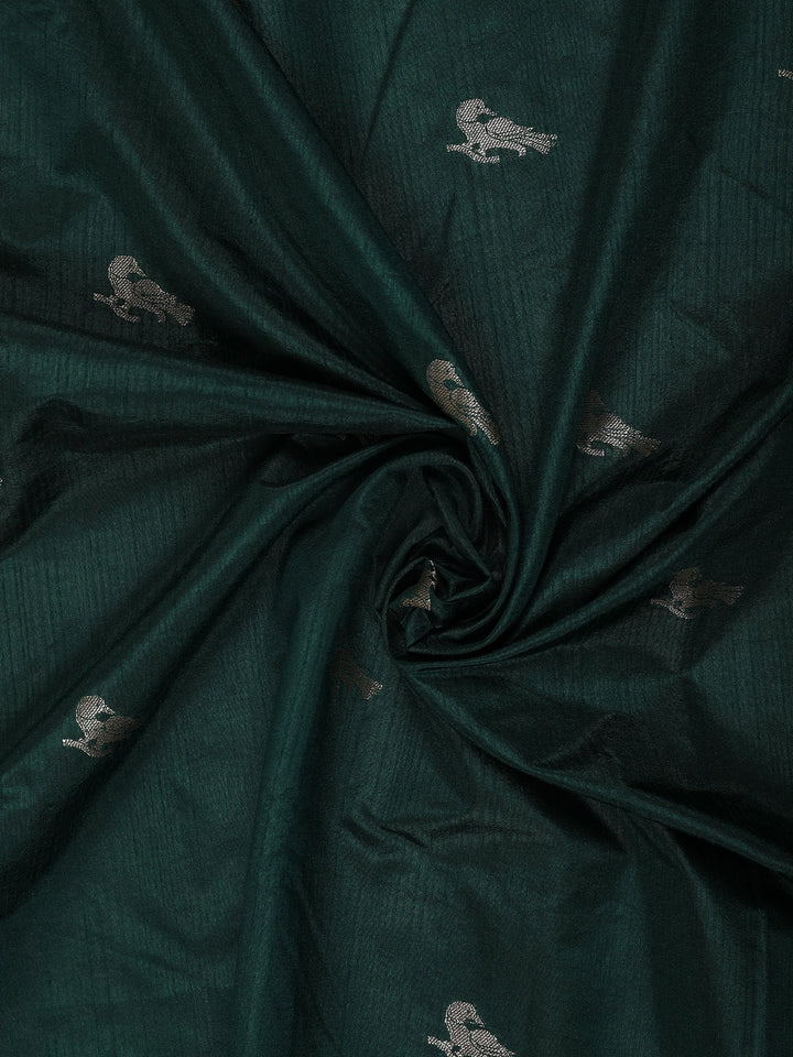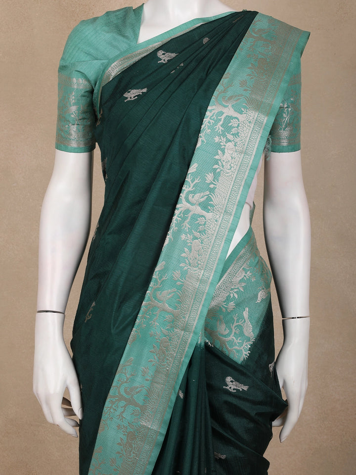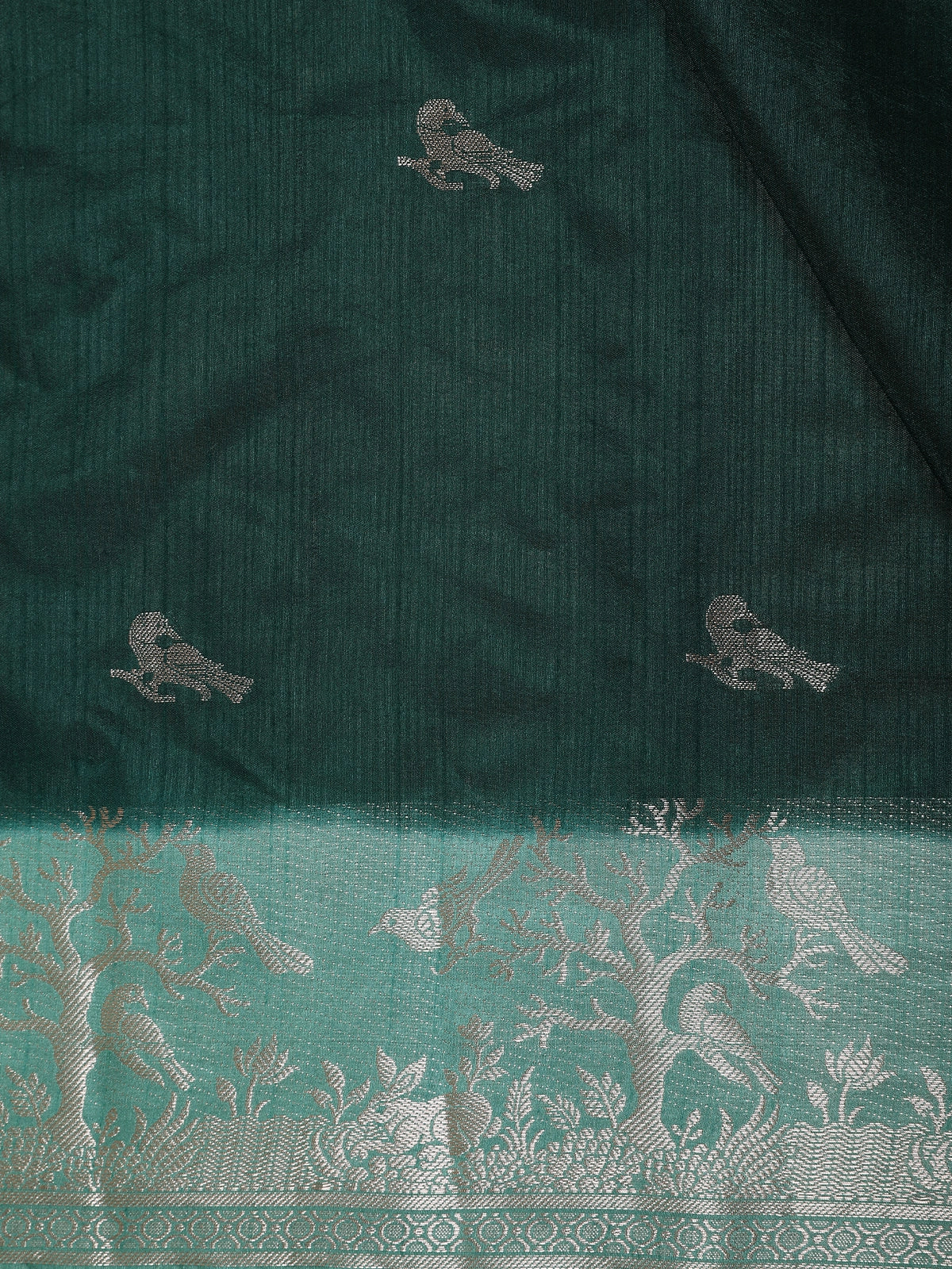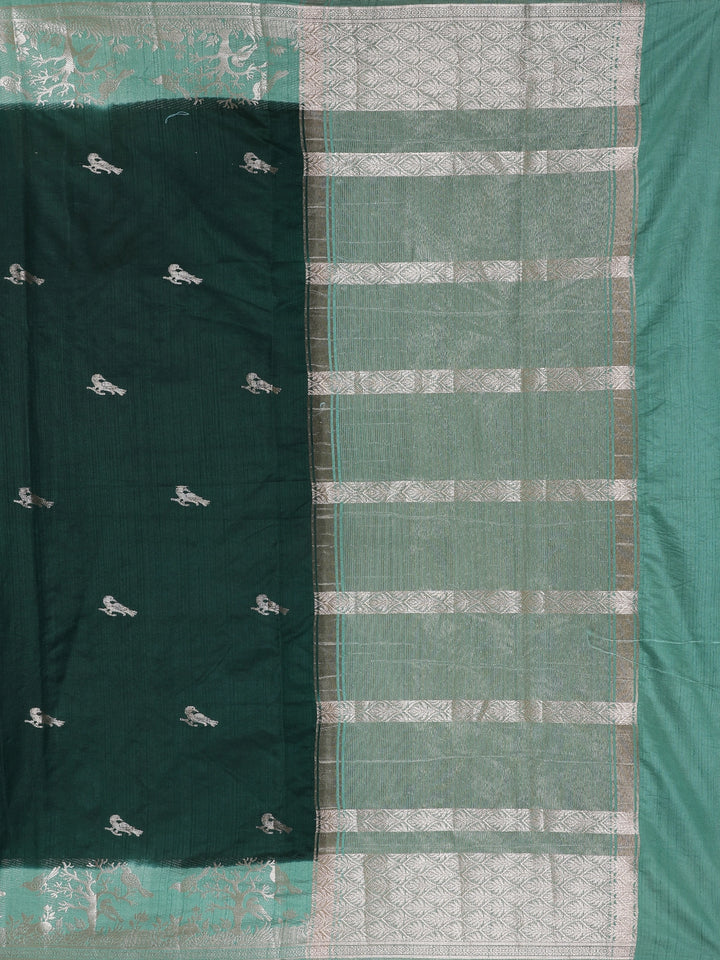 Dark Green Birds Woven Raw Silk Saree with Contrast Mint Green Zari Border