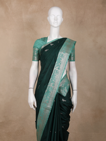 This graceful Dark Green Raw Silk Saree features subtle silver zari bird motifs woven across the body, adding a refined and traditional elegance. The saree is beautifully enhanced with a Contrast Mint Green Zari Border, intricately designed with bird and floral detailing, bringing a fresh and charming appeal to the drape.