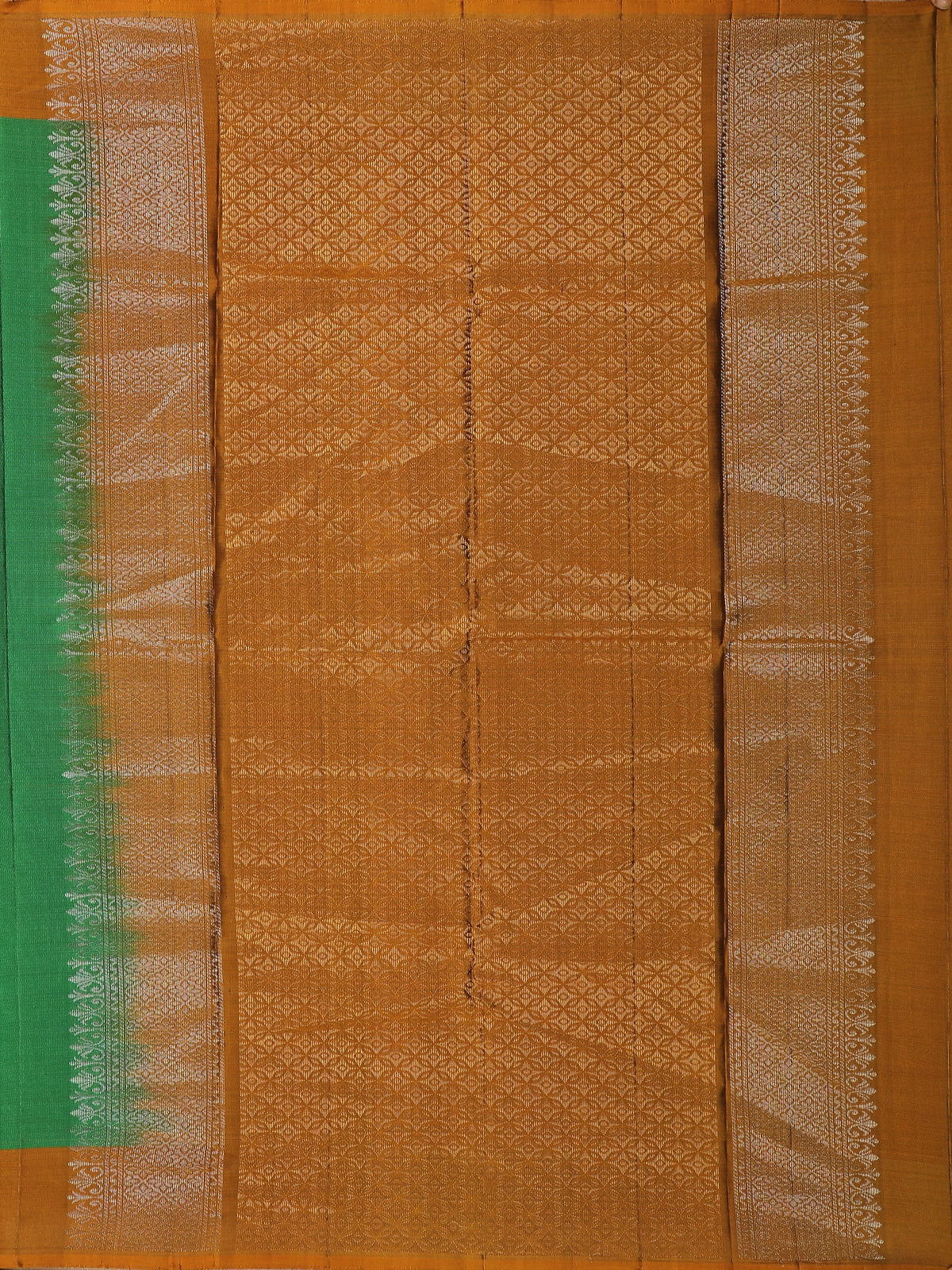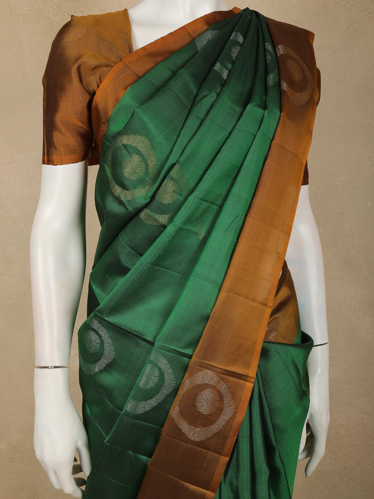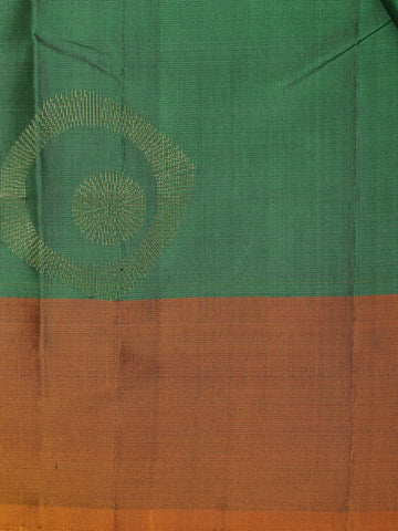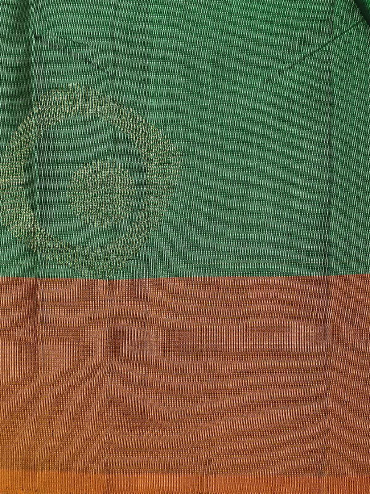 The saree is beautifully complemented by a contrast border in warm antique copper-brown tones, lending a striking yet balanced finish. The interplay of deep green and earthy copper hues enhances the saree’s heritage appeal, while the soft silk sheen ensures a regal drape.