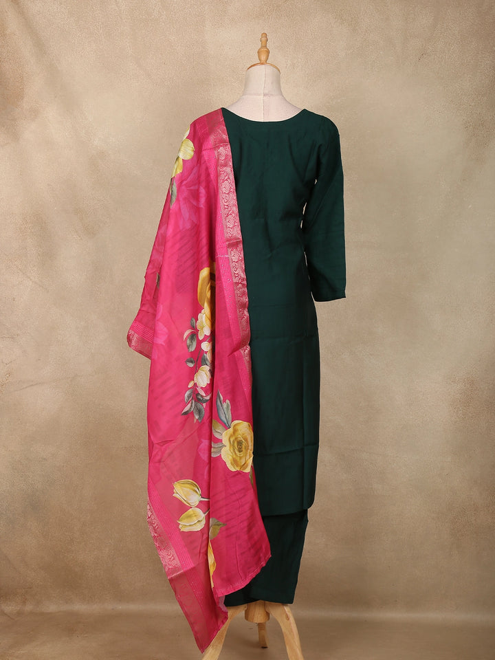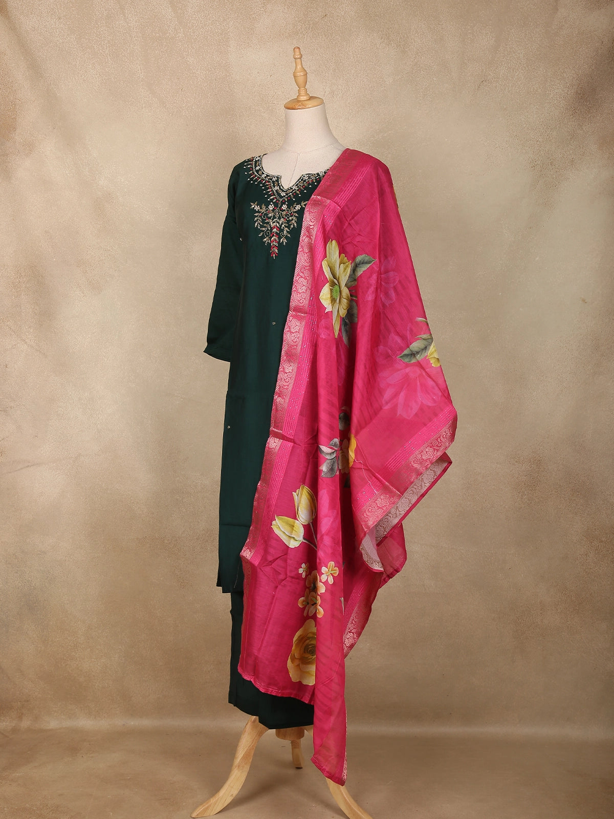 Dark Green Floral Beads Embroidered Design Cotton Straight Cut Salwar Suit with Contrast Dupatta
