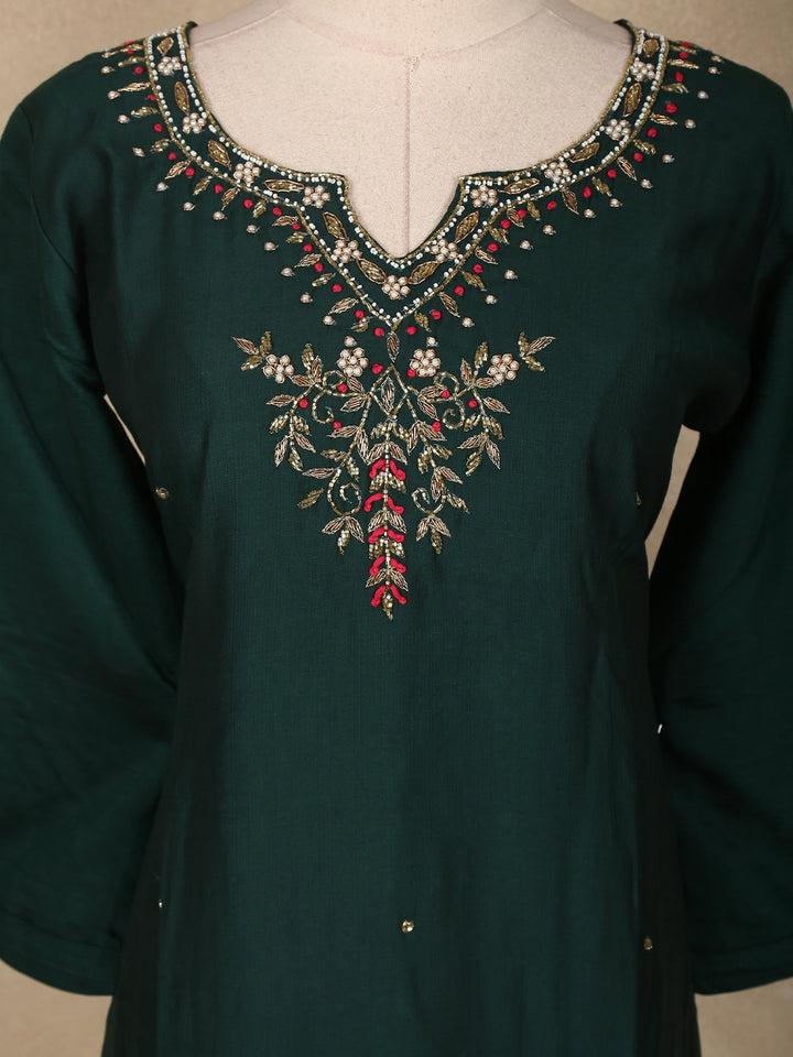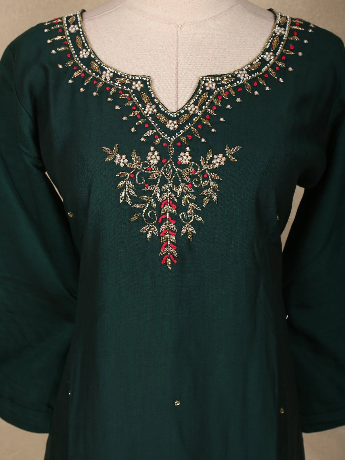 Crafted from soft, breathable cotton fabric, the straight-cut kurta ensures effortless comfort and a flattering silhouette. The highlight of this ensemble is the beautifully hand-embroidered neckline, adorned with intricate floral motifs crafted using fine beads and threadwork that shimmer subtly with every movement. The V-neckline and three-quarter sleeves bring out a refined, contemporary touch, making this piece ideal for festive and semi-formal occasions.