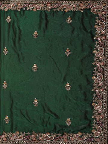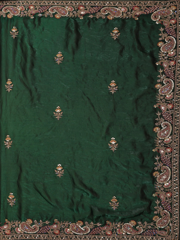 Grace your festive wardrobe with this Dark Green Floral Embroidered Tissue Organza Saree, a statement piece that exudes timeless charm and opulence. The saree features an elaborately designed floral border, adorned with sequins and zari embroidery, creating a captivating shimmer effect. Its rich tissue organza fabric adds a luxurious sheen, while the matching green pallu enhances its elegant drape.