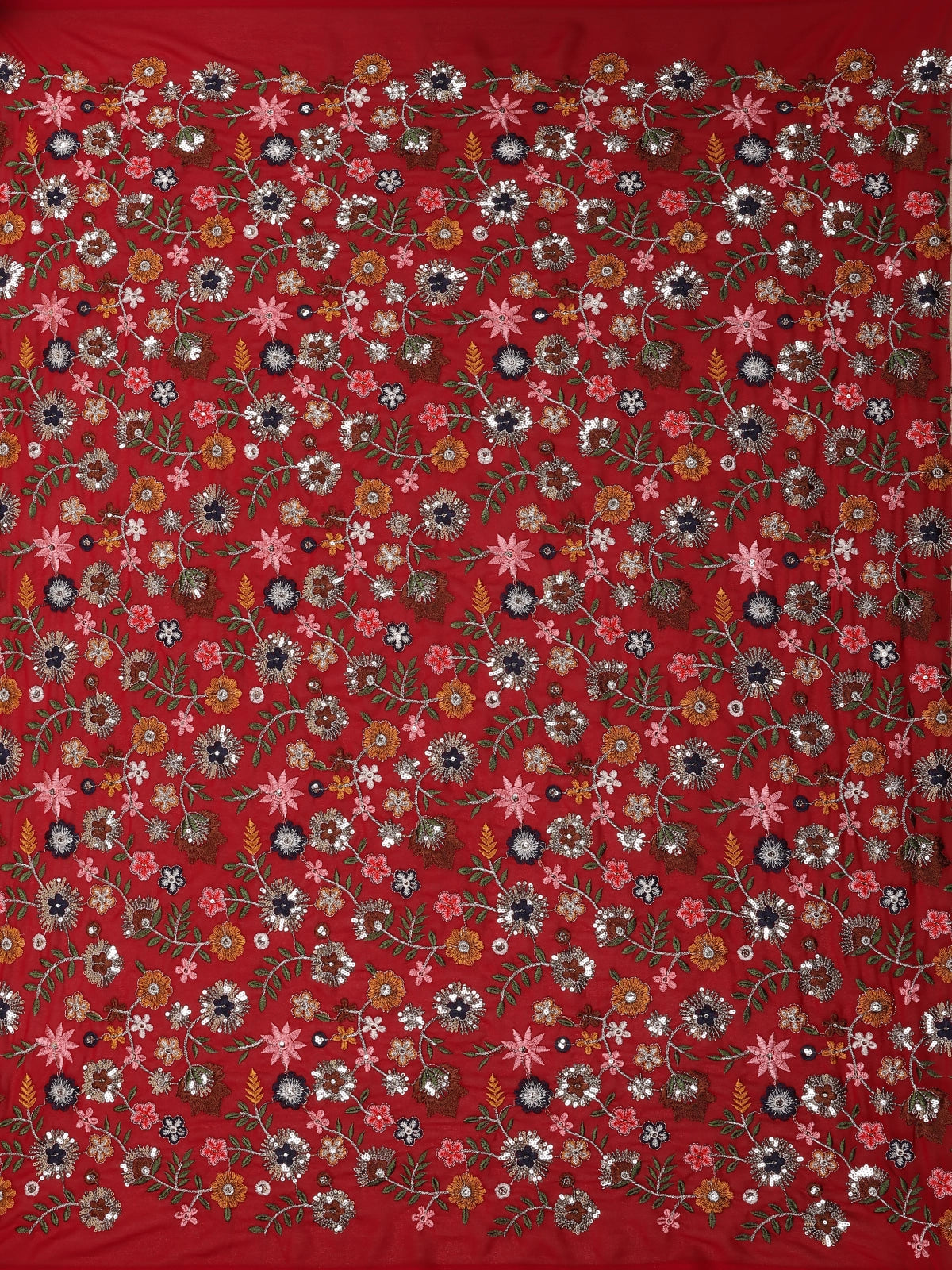 Paired with a vibrant red floral embroidered blouse, intricately embellished with sequins and multicolor threads, this ensemble strikes a perfect balance between traditional artistry and contemporary finesse. Perfect for weddings, engagements, or festive soirées, this saree embodies regal sophistication and festive allure.