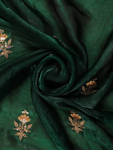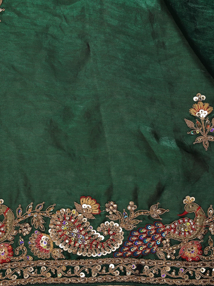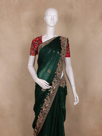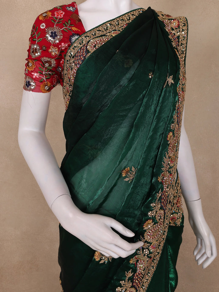Dark Green Floral Embroidered Tissue Organza Saree With Red Floral Blouse