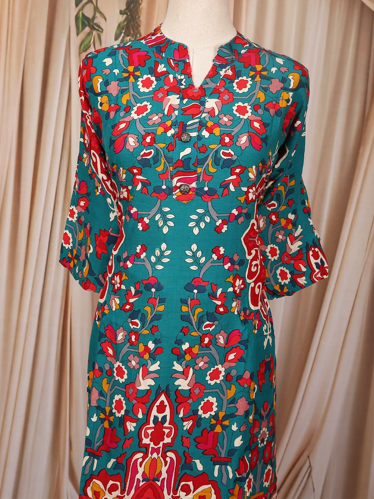 Step into easy elegance with this Dark Green Floral Printed Cotton Palazzo Suit, designed for comfort and style in perfect balance. Made from breathable and lightweight cotton, this outfit keeps you cool throughout the day while offering a beautifully flowy silhouette.