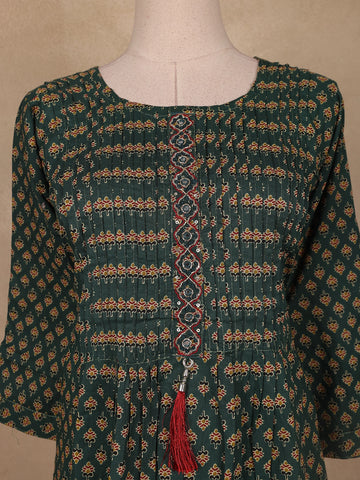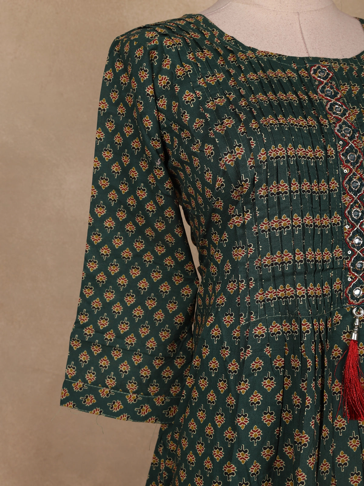 This dark green cotton salwar suit embodies timeless elegance with its all-over floral butta print in mustard and maroon hues. The yoke is beautifully enhanced with mirror and thread embroidery, arranged in a geometric pattern along the front placket, giving the outfit a touch of refined detail. The pleated yoke design adds depth and texture, complemented by a contrast maroon tassel accent for a striking finish. Designed with a round neckline and three-quarter sleeves, this ensemble ensures comfort while maintaining a graceful silhouette.