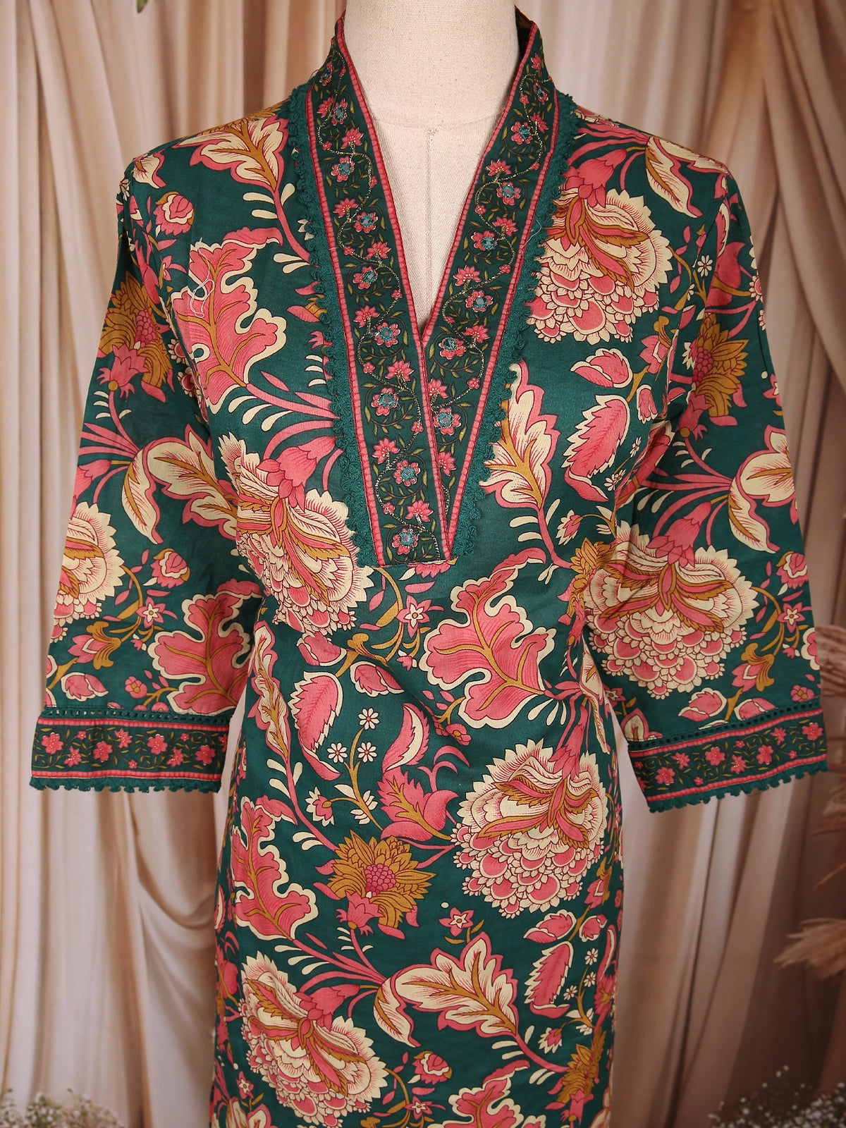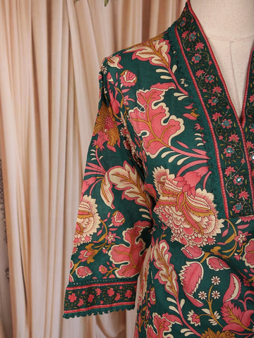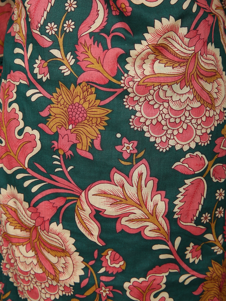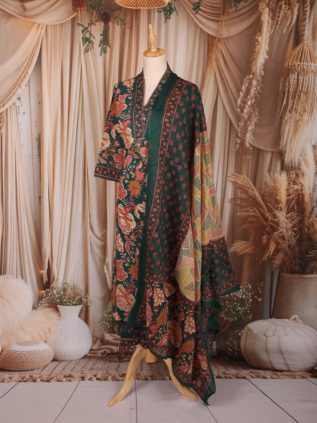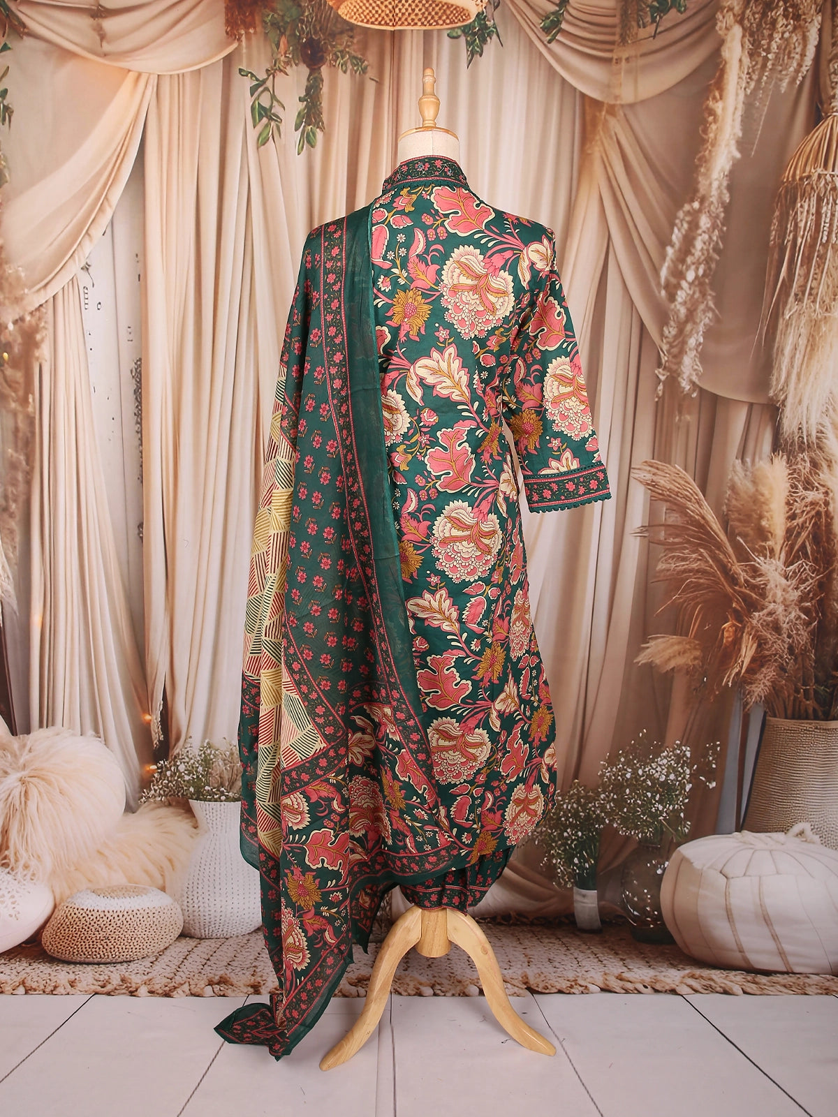 Exude timeless elegance with this Dark Green Cotton Straight Cut Salwar Suit, a perfect blend of classic prints and contemporary sophistication. Crafted from soft, breathable cotton, this ensemble showcases a rich multicolor floral print in shades of red, mustard, and beige — creating a graceful contrast against the deep green backdrop.